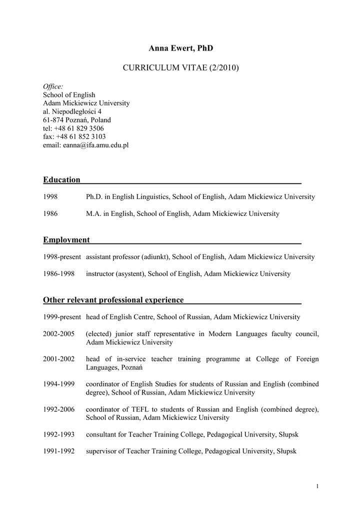 Anna Ewert, PhD CURRICULUM VITAE (2/2010) Office: School of English Adam Mickiewicz University al. Niepodległości 4 61-874 Poznań, Poland tel: +48 61 829 3506 fax: +48 61 852 3103 email: [email protected] Education 1998 Ph.D. in English Linguistics, School of English, Adam Mickiewicz University 1986 M.A. in English, School of English, Adam Mickiewicz University Employment 1998-present assistant professor (adiunkt), School of English, Adam Mickiewicz University 1986-1998 instructor (asystent), School of English, Adam Mickiewicz University Other relevant professional experience 1999-present head of English Centre, School of Russian, Adam Mickiewicz University 2002-2005 (elected) junior staff representative in Modern Languages faculty council, Adam Mickiewicz University 2001-2002 head of in-service teacher training programme at College of Foreign Languages, Poznań 1994-1999 coordinator of English Studies for students of Russian and English (combined degree), School of Russian, Adam Mickiewicz University 1992-2006 coordinator of TEFL to students of Russian and English (combined degree), School of Russian, Adam Mickiewicz University 1992-1993 consultant for Teacher Training College, Pedagogical University, Słupsk 1991-1992 supervisor of Teacher Training College, Pedagogical University, Słupsk 1 Grants 2007-2008 grant N104 040 32/3713 from the Ministry of Science and Higher Education. Habilitation improvement grant. 2003 grant PI-II/18 from the Rector of Adam Mickiewicz University for interdisciplinary research. Project leader. Award 1998 Award of the Rector of Adam Mickiewicz University for excellence in teaching Membership in professional organizations European Second Language Association (EUROSLA) Modern Language Association of Poland (PTN) Current research interests Bilingualism Second language acquisition Multicompetence dynamics L2 effect on L1 Metalinguistic, pragmalinguistic and conceptual aspects of multicompetence Teaching experience Bilingualism Second language acquisition Issues in applied linguistics Neurological and cognitive foundations of language L1 and L2 acquisition in childhood TEFL methodology TEFL methodology to young children Translation Pedagogical grammar of English English pronunciation TEFL at academic level Courses taught (2009/2010) Bilingualism (MA seminars) Second language acquisition 2 Publications Ewert, A. (under contract). L2 users’ L1. Bristol: Multilingual Matters. Czechowska, N., Ewert, A. (in press). “Perception of motion by Polish-English bilinguals.” In: Cook, V. and Bassetti, B. (eds.). Language and bilingual cognition. Psychology Press. Bromberek-Dyzman, K., Ewert, A. (2010, in press). “Figurative competence is better developed in L1 than in L2, or is it? Understanding conversational implicatures in L1 and L2.” In: Pütz, M. and Sicola, L. (eds.). Inside the learner’s mind: Cognitive processing and second language acquisition. Amsterdam/Philadelphia: John Benjamins. Ewert, A., Bromberek-Dyzman, K. (in press). “Testing the Intercultural Style Hypothesis: Semantic strategies in L1 and L2 refusals.” In: Arabski, J. (ed.). Multidisciplinary perspectives on second language acquisition and foreign language learning. Katowice: Wydawnictwo Uniwersytetu Śląskiego. Ewert, A. (2010). “An educational language community: External and internal language use by multilingual students.” In: Arabski, J. and Wojtaszek, A. (eds.). Neurolinguistic and psycholinguistic perspectives on SLA. Bristol: Multilingual Matters, 159-174. Ewert, A. (2009). L2 users’ L1. Poznań: Pracownia Wydawnicza IFA. Ewert, A., Bromberek-Dyzman, K. (2008). “Impossible requests: L2 users’ pragmalinguistic choices in L1 acts of refusal.” EUROSLA Yearbook 8: 32-51. Ewert, A. (2008). “L1 syntactic preferences of Polish adolescents in bilingual and monolingual education programmes.” In: Gabryś-Barker, D. (ed.). Morphosyntactic issues in second language acquisition. Clevedon: Multilingual Matters, 47-62. Ewert, A. (2008). “Do they have different L1s? Bilinguals’ and monolinguals’ grammaticality judgements.” In: Nikolaev, A. and Niemi, J. (eds.). Two or more languages: Proceedings from the 9th Nordic Conference on Bilingualism. [Studies in Languages 43]. Joensuu: University of Joensuu, 56-66. Ewert, A., Bromberek-Dyzman, K. (2007). “Declining offers: L2 users' pragmalinguistic choices in L1.” In: Cap, P. and Nijakowska, J. (eds). Current trends in pragmatics. Newcastle: Cambridge Scholars Publishing, 387-409. Ewert, A., Słoboda, A., Fliciński, P. (2007). “Language change in the microcosm of bilinguals' L1.” In: Arabski, J. (ed.). Challenging tasks for psycholinguistics in the new century. Katowice: University of Silesia, 319-328. Ewert, A. (2007). “Próba identyfikacji zmiennych wpływających na rozwój kompetencji bilingwalnej.” In: Jodłowiec, M. and NiŜegorodcew, A. (eds). Dydaktyka języków obcych na początku XXI wieku. Kraków: Wydawnictwo Uniwersytetu Jagiellońskiego, 41-53. Bromberek-Dyzman, K., Ewert, A. (2007). “Jak Polacy mówią ‘nie’?” In: Chłopicki, W. (ed.) Komunikacja międzykulturowa: Perspektywy badań interdyscyplinarnych. [Język trzeciego tysiąclecia IV]. Kraków: Tertium, 111-121. 3 Domnik, I., Lewandowska, Z., Ewert, A. (2007). The life and achievement of Professor Janina Ewert. Słupskie Prace Matematyczno-Fizyczne 4: 7-9. Ewert, A. (2006). A dynamic model of multilingualism: Developmental changes in L1 morphology of Polish students of English. Scripta Neophilologica Posnaniensia 8: 35-47. Ewert, A. (2006). “Wielojęzyczność jako norma? Implikacje dla glottodydaktyki i polityki językowej.” In: Krieger-Knieja, J. and Paprocka-Piotrowska, U. (eds). Komunikacja językowa w społeczeństwie informacyjnym. Nowe wyzwania dla dydaktyki języków obcych. Lublin: Towarzystwo Naukowe Katolickiego Uniwersytetu Lubelskiego Jana Pawła II, 102-113. Ewert, A. (2001). Matura a egzamin wstępny na filologię angi