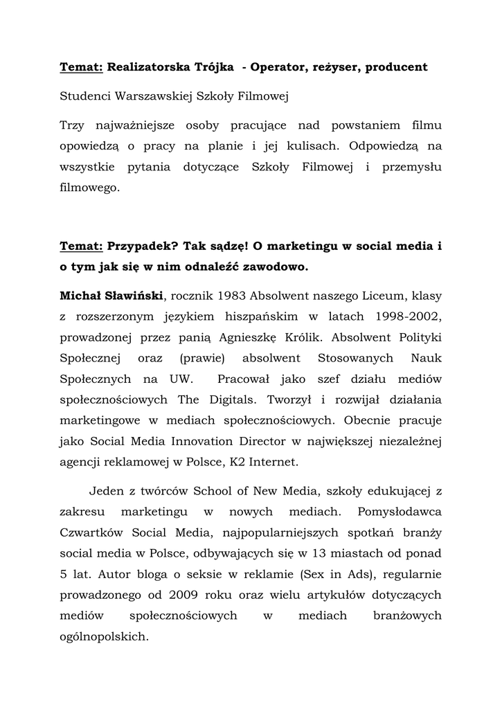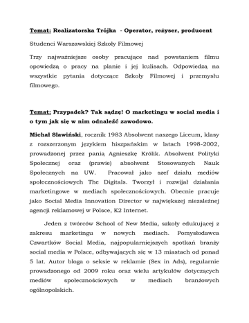 Temat: Realizatorska Trójka - Operator, reżyser, producent Studenci Warszawskiej Szkoły Filmowej Trzy najważniejsze osoby pracujące nad powstaniem filmu opowiedzą o pracy na planie i jej kulisach. Odpowiedzą na wszystkie pytania dotyczące Szkoły Filmowej i przemysłu filmowego. Temat: Przypadek? Tak sądzę! O marketingu w social media i o tym jak się w nim odnaleźć zawodowo. Michał Sławiński, rocznik 1983 Absolwent naszego Liceum, klasy z rozszerzonym językiem hiszpańskim w latach 1998-2002, prowadzonej przez panią Agnieszkę Królik. Absolwent Polityki Społecznej oraz (prawie) Społecznych na UW. absolwent Pracował jako Stosowanych szef działu Nauk mediów społecznościowych The Digitals. Tworzył i rozwijał działania marketingowe w mediach społecznościowych. Obecnie pracuje jako Social Media Innovation Director w największej niezależnej agencji reklamowej w Polsce, K2 Internet. Jeden z twórców School of New Media, szkoły edukującej z zakresu marketingu w nowych mediach. Pomysłodawca Czwartków Social Media, najpopularniejszych spotkań branży social media w Polsce, odbywających się w 13 miastach od ponad 5 lat. Autor bloga o seksie w reklamie (Sex in Ads), regularnie prowadzonego od 2009 roku oraz wielu artykułów dotyczących mediów społecznościowych ogólnopolskich. w mediach branżowych Temat: Studia za granicą Fund for students – Organizacja pomagająca uczniom w aplikacji na uczelnie za granicą Pracownicy i studenci opowiedzą o realiach i możliwościach podjęcia nauki za granicą Temat: Jak zaistnieć w świecie sztuki Marta Czyż, historyk sztuki, kuratorka wystaw Ukończyła Historię Sztuki na UW oraz Muzealnicze studia kuratorskie na UJ. Obecnie jest dyrektorem Fundacji Sztuk Pięknych Kochański i Knut. Opowie jak stworzyć wystawę sztuki od podstaw, jaki jest klucz doboru artystów, na co kurator sztuki zwraca uwagę. Temat: Charakteryzacja i Wizaż Agnieszka Kwiatkowska – Stańska charakteryzatorka. Technikę szkoliła – wizażystka i w Policealnym Studium Sztuk Wizualnych w Gdyni, posiada certyfikat od Jolanty Wagner w EAEA w Warszawie. Uczyła w Europejskiej Szkole Stylizacji SELECT oraz Szkole Wizażu i charakteryzacji MAKE UP STAR w Warszawie. Pracuje przy sesjach fotograficznych, pokazach mody, teledyskach, produkcjach telewizyjnych i eventach Temat:Architektura krajobrazu jako interdyscyplinarna działalność twórcza Krzysztof Herman, dr inż. Architekt krajbrazu, absolwent naszej szkoły, uczęszczał do klasy z rozszerzonym językiem angielskim w latach 1997 – 2001. Adiunkt w Katedrze Sztuki Krajobrazu SGGW, nauczyciel akademicki na Wydziale Ogrodnictwa, Biotechnologii i Architektury Krajobrazu oraz na kierunku Gospodarka W roku Przestrzenna. akademickim 2008/2009 stypendysta Fundacji Fulbrighta na Harvard Graduade School of Design w USA. Członek grupy projektowej Parque-no, z którym realizował projekty m.in. w Galerii Kordegarda, na Festiwalu Ogrodów w Bolestraszycach, Festiwalu Land Art W Toruniu czy “Przebudzeniu” Galerii El w Elblągu Tworzył także zielone instalacje w galerii Heppen Transfer. Temat: Kogo szukają pracodawcy Mariusz Pion Kostera Marketingu Wiceprezes i Zarządu Banku Zarządzania BPH Produktami Pełnił funkcję Chief Commercial Officer w Equa Financial Services, spółce stworzonej w Republice Czeskiej, dla zbudowania nowego banku wcześniejsza na kariera tamtejszym zawodowa rynku była – Equabank. związana z Jego branżą reklamową. Pracował m.in. dla takich klientów i marek jak Coca Cola, Mars, Procter and Gamble, Era, Deutsche Bank czy Norwich Union. Posiada tytuł magistra Ośrodka Studiów Amerykańskich Uniwersytetu Warszawskiego. Temat: Od inżyniera do redaktora językowego, a także o tym, jak dobrze tłumaczyć Tamara Adamus – absolwentka Wydziału Fizyki Technicznej i Matematyki Stosowanej Politechniki Warszawskiej i studiów podyplomowych w zakresie redakcji językowej tekstu na Wydziale Polonistyki Uniwersytetu Warszawskiego. Zaraz po studiach pracowałam jako programista (tworzenie baz danych i programów je obsługujących), a od kilka lat zajmuję się redakcją tekstów. Ktoś mógłby zdziwić się tej zmianie – od matematyka, inżyniera do specjalisty od języka. Co wspólnego mają ze sobą matematyka i gramatyka? Jak doszło do takiej zmiany? Jak szukać dziedziny, w której możemy wykorzystać swoje predyspozycje? Poszukajmy razem odpowiedzi na te i podobne pytania. A także na pytanie, jak być dobrym tłumaczem (redaguję głównie teksty tłumaczone z języka angielskiego, dlatego mogę wiele powiedzieć o pracy dobrego i złego tłumacza ). Temat: Tłumacz prozy hiszpańskojęzycznej Carlos Alex Marrodán Casas – wybitny tłumacz literatury hispanojęzycznej na polski, poeta. Przekłada też z francuskiego i portugalskiego. W swoim dorobku ma wiele powieści Gabriela Garcii Marqueza, Mario Vargasa Llosy, Javiera Mariasa, Carlosa Ruiza Zafona. Temat: Zbawianie świata na codzień- realia pracy w organizacji rozwojowej Dorota Moran, absolwentka naszej szkoły, uczęszczała do klasy z rozszerzonym językiem angielskim w latach 1997 – 2001. Ukończyła Nauki Społeczne (ISNS) na UW, pracowała jako wolontariuszka w Irlandii(na programach terapeutycznych dla osób bezdomnych i uzależnionych od alkoholu), w Tanzanii (na 3mies wolontariacie Polskiej Akcji Humanitarnej), w Ghanie (na rocznym wolontariacie europejskim EVS). Pracuje w tzw trzecim sektorze -pracowała w PAH, gdzie koordynowała program wolontariacki i projekty edukacyjne, w organizacji aktywizującej osoby chorujące psychicznie, obecnie pracuje w Instytucie Globalnej Odpowiedzialności, gdzie zajmuje się edukacją globalną w szczególności obrazem krajów globalnego Południa w polskich mediach, szkołach. Szkoli nauczycieli, prowadzi warsztaty z dziećmi i młodzieżą, pisze materiały edukacyjne. Temat: W świecie mysikrólików i tych większych od nich ptaków. Ornitologi