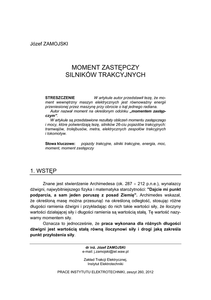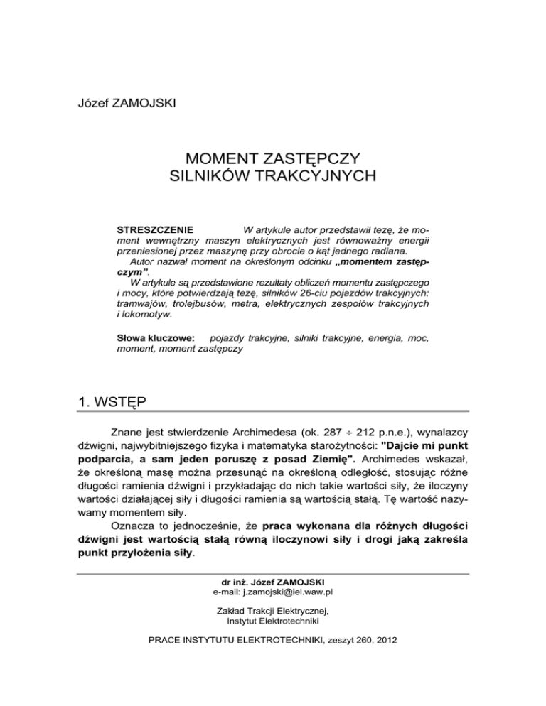 Józef ZAMOJSKI MOMENT ZASTĘPCZY SILNIKÓW TRAKCYJNYCH STRESZCZENIE W artykule autor przedstawił tezę, że moment wewnętrzny maszyn elektrycznych jest równoważny energii przeniesionej przez maszynę przy obrocie o kąt jednego radiana. Autor nazwał moment na określonym odcinku „momentem zastępczym”. W artykule są przedstawione rezultaty obliczeń momentu zastępczego i mocy, które potwierdzają tezę, silników 26-ciu pojazdów trakcyjnych: tramwajów, trolejbusów, metra, elektrycznych zespołów trakcyjnych i lokomotyw. Słowa kluczowe: pojazdy trakcyjne, silniki trakcyjne, energia, moc, moment, moment zastępczy 1. WSTĘP Znane jest stwierdzenie Archimedesa (ok. 287 212 p.n.e.), wynalazcy dźwigni, najwybitniejszego fizyka i matematyka starożytności: "Dajcie mi punkt podparcia, a sam jeden poruszę z posad Ziemię". Archimedes wskazał, że określoną masę można przesunąć na określoną odległość, stosując różne długości ramienia dźwigni i przykładając do nich takie wartości siły, że iloczyny wartości działającej siły i długości ramienia są wartością stałą. Tę wartość nazywamy momentem siły. Oznacza to jednocześnie, że praca wykonana dla różnych długości dźwigni jest wartością stałą równą iloczynowi siły i drogi jaką zakreśla punkt przyłożenia siły. dr inż. Józef ZAMOJSKI e-mail: [email protected] Zakład Trakcji Elektrycznej, Instytut Elektrotechniki PRACE INSTYTUTU ELEKTROTECHNIKI, zeszyt 260, 2012 94 J. Zamojski 2. MOMENT SIŁY A PRACA Nawiązując do treści wstępu (pkt. 1) można stwierdzić, że praca wykonana przy pomocy dźwigni równa się iloczynowi siły przyłożonej do dźwigni i długości drogi jaką wykonuje punkt przyłożenia siły na dźwigni. Powyższe można wyrazić zależnością podaną niżej przy obrocie ramienia o kąt pełny równy 2 radianów: W2 = F 2 r (2.1) Ponieważ jeden obrót ramienia o długości r odpowiada kątowi 2 radianów, praca wykonana przez siłę F przy obrocie o jeden radian wynosi: (2.2) W1rad = F r Uzyskana zależność (2.2) wyraża zgodnie z definicją wartość momentu T siły F przyłożonej do ramienia o długości r. Oznacza to, że wartość liczbowa momentu siły równa się wartości pracy wykonanej przez siłę na drodze odpowiadającej kątowi jednego radiana. O tym, że równość momentu z wykonaną pracą lub z energią przeniesioną przy obrocie o kąt jednego radiana dotyczy także maszyn elektrycznych, można dowieść w sposób następujący. Wyrażenie na moment wewnętrzny maszyny elektrycznej ma postać: Tw = Cm I (2.3) gdzie: I [A] – prąd uzwojenia wirnika, [Wb] – strumień jednego bieguna, Cm = pN – stała momentu. 2a Natomiast pracę jaką wykonuje jeden pręt maszyny obracając się o jeden obrót przy stałej wartości indukcji B można wyrazić zależnością: W1pr = F 2 r = B I l 2 r [Nm] (2.4) 95 Moment zastępczy silników trakcyjnych gdzie: F [N] – siła, R [m] – promień wirnika, B [Wb] – indukcja pod biegunem, l [m] – długość pręta uzwojenia. Ponieważ w maszynie elektrycznej na obwodzie występuje 2p biegunów o podziałce = 2 r / 2p, strumień jednego bieguna = B l , natomiast praca jednego pręta przy jednym obrocie maszyny wynosi: W1pr = I 2p (2.5) [Nm] W przypadku uzwojenia o liczbie prętów N ułożonych równomiernie na obwodzie twornika i liczbie gałęzi 2a praca wykonana przez uzwojenie podczas jednego obrotu wynosi: W pN 2 pN I I a 2a [Nm] (2.6) Przechodząc z pełnego obrotu o kącie 2 radianów na jeden radian, uzyskamy wyrażenie na pracę W1r wykonaną przy obrocie o jeden radian równe momentowi elektromagnetycznemu (wewnętrznemu) – Tw: W1r W pN I = Cm I = Tw 2 2a (2.7) Przedstawione wyżej rozważania, a szczególnie definicja o równości wartości momentu obrotowego i energii przeniesionej przy obrocie o kąt jednego radiana została wykorzystana przez autora do powiązania równania ruchu obrotowego wyrażonego zależnością momentu napędowego silnika: Tn = Td + Topr gdzie: Td Topr – moment dynamiczny, – moment oporowy, (2.8) 96 J. Zamojski z równaniem energetycznym ruchu liniowego pojazdu określonym sumą energii kinetycznej i energii oporów ruchu: (2.9) En = Ed + Eopr gdzie: Ed – energia kinetyczna, Eopr – energia oporów ruchu. 3. MOMENT ZASTĘPCZY SILNIKÓW TRAKCYJNYCH W przypadku ruchu liniowego obiektu np. pojazdu o znanej masie m i znanych parametrach takich jak: prędkość maksymalna Vmax, droga S, siły mechanicznych oporów ruchu W, istnieje możliwość określenia sumy wykonanej pracy i energii kinetycznej pojazdu: E A S mVmax 2 W dS 2 0 (3.1) Przy znanej wartości średnicy kół pojazdu Dkol i wartości przełożenia kół zębatych i, istnieje jednoznaczna zależność między drogą S przebytą przez pojazd, a liczbą (lobr) wykonanych obrotów w tym czasie przez silnik czy silniki. liczba wykonanych obrotów przez koła pojazdów na trasie o długości S wynosi: l obrkol S Dkol liczba pełnych obrotów silnika (silników) trakcyjnego podczas przejazdu pojazdu na drodze S wynosi: l obrsil l obrkol i Si Dkol liczba kątów o wartości jeden radian przy pełnej liczbie obrotów silników podczas przejazdu pojazdu na trasie o długości S wynosi: l rad l obrsil 2 Si 2 Si 2 Dkol Dkol 97 Moment zastępczy silników trakcyjnych Korzystając z przedstawionej wyżej tezy, że moment maszyny elektrycznej równa się energii przeniesionej przy obrocie o kąt jednego radiana, autor proponuje utworzenie pojęcia momentu zastępczego silnika trakcyjnego Tz obliczonego z poniższej zależności: Tz gdzie: E W A W Dkol l rad i l sil 2Si i l sil [Ws] lub [Nm] (3.2) i – sprawność przekładni pojazdu, lsil – liczba silników w pojeździe. W ramach klasycznych obliczeń trakcyjnych ustalany jest prąd zastępczy Iz jednostek napędowych, który określa skutki cieplne pracy silników trakcyjnych i jest przyjmowany jako wartość odpowiadająca znamionowemu prądowi ciągł