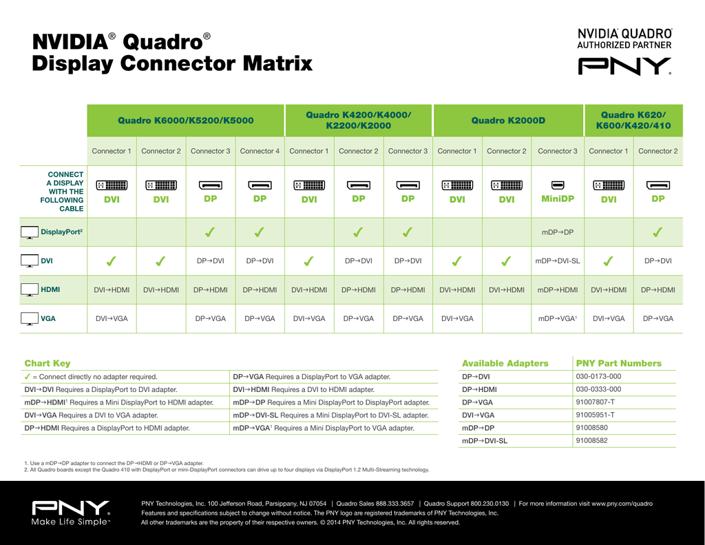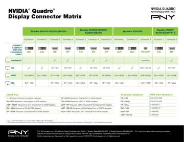 NVIDIA® Quadro® Display Connector Matrix Quadro K4200/K4000/ K2200/K2000 Quadro K6000/K5200/K5000 CONNECT A DISPLAY WITH THE FOLLOWING CABLE Quadro K620/ K600/K420/410 Quadro K2000D Connector 1 Connector 2 Connector 3 Connector 4 Connector 1 Connector 2 Connector 3 Connector 1 Connector 2 Connector 3 Connector 1 Connector 2 DVI DVI DP DP DVI DP DP DVI DVI MiniDP DVI DP 4 4 4 4 DisplayPort2 4 mDPgDP 4 4 DPgDVI DPgDVI 4 DPgDVI DPgDVI 4 4 mDPgDVI-SL 4 DPgDVI HDMI DVIgHDMI DVIgHDMI DPgHDMI DPgHDMI DVIgHDMI DPgHDMI DPgHDMI DVIgHDMI DVIgHDMI mDPgHDMI DVIgHDMI DPgHDMI VGA DVIgVGA DPgVGA DPgVGA DVIgVGA DPgVGA DPgVGA DVIgVGA mDPgVGA1 DVIgVGA DPgVGA DVI Chart Key Available Adapters PNY Part Numbers 4 = Connect directly no adapter required. DPgVGA Requires a DisplayPort to VGA adapter. DPgDVI 030-0173-000 DVIgDVI Requires a DisplayPort to DVI adapter. DVIgHDMI Requires a DVI to HDMI adapter. DPgHDMI 030-0333-000 mDPgHDMI1 Requires a Mini DisplayPort to HDMI adapter. mDPgDP Requires a Mini DisplayPort to DisplayPort adapter. DPgVGA 91007807-T DVIgVGA Requires a DVI to VGA adapter. mDPgDVI-SL Requires a Mini DisplayPort to DVI-SL adapter. DVIgVGA 91005951-T DPgHDMI Requires a DisplayPort to HDMI adapter. mDPgVGA1 Requires a Mini DisplayPort to VGA adapter. mDPgDP 91008580 mDPgDVI-SL 91008582 1. Use a mDPgDP adapter to connect the DPgHDMI or DPgVGA adapter. 2. All Quadro boards except the Quadro 410 with DisplayPort or mini-DisplayPort connectors can drive up to four displays via DisplayPort 1.2 Multi-Streaming technology. PNY Technologies, Inc. 100 Jefferson Road, Parsippany, NJ 07054 | Quadro Sales 888.333.3657 | Quadro Support 800.230.0130 | For more information visit www.pny.com/quadro Features and specifications subject to change without notice. The PNY logo are registered trademarks of PNY Technologies, Inc. All other trademarks are the property of their respective owners. © 2014 PNY Technologies, Inc. All rights reserved.