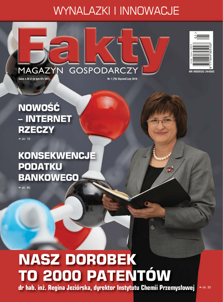 WYNALAZKI I INNOWACJE NR INDEKSU 344583 Cena 4.20 zł (w tym 8% VAT) Nr 1 (79) Styczeń/Luty 2016 NOWOŚĆ – INTERNET RZECZY str. 16 KONSEKWENCJE PODATKU BANKOWEGO str. 80 NASZ DOROBEK TO 2000 PATENTÓW dr hab. inż. Regina Jeziórska, dyrektor Instytutu Chemii Przemysłowej str. 32 Odzież jako suplement opatrunku w terapii chorób dermatologicznych Produkt został opracowany w ramach projektu PBS1 – nr 177463 „Bioaktywna odzież o właściwościach leczniczo-pielęgnacyjnych” finansowanego przez NCBiR (zgłoszenie patentowe nr P 411869 z dn. 02.04.2015) Projekt Bioakod Narodowe Centrum Badań i Rozwoju Opis wynalazku: Odzież – innowacyjne rozwiązanie dla osób z problemami dermatologicznymi; Odzież wykonana z wykorzystaniem wyłącznie naturalnych surowców, które gwarantują bezpieczeństwo w kontakcie z chorą skórą pacjenta: • Dzianina lniana i tkanina z bawełny organicznej, • Barwienie odzieży barwnikami pozyskanymi z roślin o właściwościach prozdrowotnych, • Ekstrakty ziołowe o właściwościach leczniczych zamknięte w mikrokapsułkach; Wspomaganie leczenia chorób skóry osiągnięto dzięki naniesieniu mikrosfer zawierających aktywne ekstrakty ziołowe na wewnętrzną powierzchnię części odzieży z dzianiny lnianej. Odzież jest odpowiedzią na indywidualne potrzeby pacjenta, została przygotowana na podstawie wielopoziomowej personalizacji: • rozlokowanie aktywnych mikrokapsuł na wewnętrznej powierzchni dzianiny w zależności od miejsca występowania zmian chorobowych na skórze pacjenta, • dobór ekstraktów ziołowych w zależności od rodzaju schorzenia, • dopasowanie odzieży do kształtu sylwetki. Efekt noszenia innowacyjnej odzieży w okresie 5 tygodni przez pacjentki z chorobami dermatologicznymi: • Zredukowanie odczucia świądu, • Poprawa nawilżenia skóry, • Zmniejszenie przeznaskórkowej utraty wody, • Zredukowanie kolonii patogennych bakterii. Na zdjęciu autorzy i współuczestnicy prac nad wynalazkiem: (osoby siedzące od prawej) dr hab. Katarzyna Schmidt-Przewoźna prof. IWNiRZ, prof. dr hab. inż. Iwona Frydrych (PŁ), prof. dr hab. inż. Izabella Krucińska (PŁ), dr inż. Małgorzata Zimniewska prof. IWNiRZ – koordynator projektu, dr hab. Przemysław Mikołajczak prof. IWNiRZ, dr hab. Mariola Pawlaczyk (UMP); (osoby stojące od prawej) Wiesław Gajda (Marko-Kolor), dr inż. Agnieszka Cichocka (PŁ), dr inż. Agnieszka Komisarczyk (PŁ), mgr inż. Patrycja Przybylska (IWNiRZ), mgr Małgorzata Muzyczek (IWNiRZ), mgr inż. Barbara Romanowska (IWNiRZ), Monika Urbaniak (Marko-Kolor), mgr inż. Anna Kicińska-Jakubowska (IWNiRZ) Konsorcjum pracujące nad wynalazkiem Instytut Włókien Naturalnych i Roślin Zielarskich Marko-Kolor Sp. J. Politechnika Łódzka Wynalazek został nagrodzony na następujących wystawach: Złoty Medal na Międzynarodowej Warszawskiej Wystawie Wynalazków IWIS 2015 r., Złoty Medal 67. edycji iENA Nuremberg International Trade Fair „Ideas-Inventions – New products” w dniach 29.10.-1.11.2015 r., Złoty Medal – Brussels INNOVA 2015, The World Exhibition on Inventions, Research and new Technologies, Brussels Eureka Competition, 19-21.11.2015 r., Specjalne odznaczenie za innowację „Innovation Award” przyznane przez ORIGITEA Institute of Health and Beauty by Doctor Mukhina, Moscow, Russia, podczas Brussels INNOVA 2015. Więcej informacji o wynalazku w środku numeru Spis treści FAKTY, LUDZIE, OPINIE 4 GOSPODARKA AMBASADOR POLSKIEJ GOSPODARKI 8 Gastronomia w świecie mobilnym Jak najłatwiej usprawnić funkcjonowanie biznesu gastronomicznego, jednocześnie zyskując przychylność konsumentów? Jednym ze sposobów jest wdrożenie nowoczesnych technologii mobilnych. GALA VIP 2015 10 INTERNET RZECZY 16 WIKTORIA - ZNAK JAKOŚCI PRZEDSIĘBIORCÓW 18 PRZEDSIĘBIORSTWA PAŃSTWOWE 20 Gdzie drwa rąbią W czasie obydwu kampanii wyborczych w 2015 r. problem prywatyzacji lasów był przedmiotem ogólnopolskiego sporu. Politycy straszyli obywateli tym, że obszary leśne zostaną ogrodzone, a wejścia do nich będą strzegli ochroniarze. 52 POLSKA SAMORZĄDOWA 64 PODKARPACKA NAGRODA GOSPODARCZA 66 WYNALAZKI I INNOWACJE 24 W poszukiwaniu zaginionej innowacyjności Dziś, kiedy krajowy rynek w wielu branżach zakończył etap ekstensywnego wzrostu, polskie firmy muszą poszukiwać nowych przewag, dopasowanych do realiów nowej dla nich konkurencji przemysłowej na rynkach globalnych. WYBITNY EKSPORTER 70 FIRMA DOBRZE ZARZĄDZANA 74 Problematyczne zatory płatnicze 48 proc. przedsiębiorstw w Polsce ma trudności z terminowym odzyskiwaniem należności od klientów. W największym stopniu problem ten dotyczy mikrofirm, czyli przedsiębiorstw zatrudniających maksymalnie 9 pracowników. POLSKI DZIEŃ JAKOŚCI 38 ZNAKI OSTRZEGAWCZE 40 INFRASTRUKTURA 41 DIAGNOZY – PROGNOZY 42 PLACÓWKA MEDYCZNA DOBRZE ZARZĄDZANA 84 ECHA POLSKIE 44 MOTORYZACJA 90 FORUM PRZEDSIĘBIORCÓW 48 NOWE TECHNOLOGIE 94 PRAWO 50 TARGI 96 www.magazynfakty.pl codzienna porcja nowych informacji Agnieszka Żądło (sekretarz redakcji) e-mail: [email protected] 01-496 Warszawa ul. Korfantego 75 tel. 22 832 42 51, 22 832 42 53 22 832 42 54, fax 22 832 24 99 e-mail: [email protected] www.magazynfakty.pl Jerzy Bojanowicz, Piotr Danilczuk, Cezary Głogowski, Elżbieta Łagowska, Piotr Nowacki, Tomasz Rekowski, Agnieszka Rowicka, Czesław Rychlewski, Igor Stokłosa, Magdalena Szczygielska, Michał Tabaka, Andrzej Uznański, Zbigniew Wawrzkowicz Redaguje kolegium Mariusz Piotr Gryżewski (redaktor naczelny) e-mail: [email protected] Adiustacja i korekta Agnieszka Żądło, Magdalena Szczygielska Dział marketingu i reklamy 01-496 Warszawa ul. Korfantego 75 tel. 022 832 42 51, 022 832 42 53, 022 832 42 54, fax 022 832 24 99 e-mail: [email protected] Projekt i skład MaxMedia (Daniel Kuciński) Prenumerata KIOSK24.PL; KOLPORTER SA; RUCH SA: Zamówienia na prenumeratę w wersji papierowej i na e-wydania można składać na stronie www