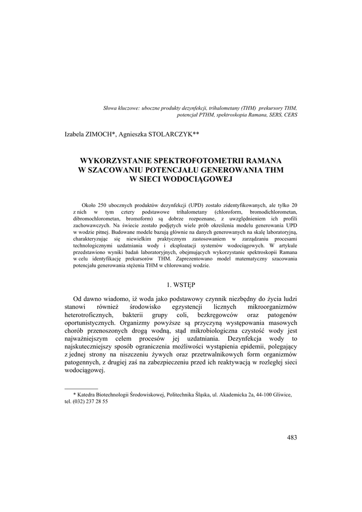 Słowa kluczowe: uboczne produkty dezynfekcji, trihalometany (THM) prekursory THM, potencjał PTHM, spektroskopia Ramana, SERS, CERS Izabela ZIMOCH*, Agnieszka STOLARCZYK** WYKORZYSTANIE SPEKTROFOTOMETRII RAMANA W SZACOWANIU POTENCJAŁU GENEROWANIA THM W SIECI WODOCIĄGOWEJ Około 250 ubocznych produktów dezynfekcji (UPD) zostało zidentyfikowanych, ale tylko 20 z nich w tym cztery podstawowe trihalometany (chloroform, bromodichlorometan, dibromochlorometan, bromoform) są dobrze rozpoznane, z uwzględnieniem ich profili zachowawczych. Na świecie zostało podjętych wiele prób określenia modelu generowania UPD w wodzie pitnej. Budowane modele bazują głównie na danych generowanych na skalę laboratoryjną, charakteryzując się niewielkim praktycznym zastosowaniem w zarządzaniu procesami technologicznymi uzdatniania wody i eksploatacji systemów wodociągowych. W artykule przedstawiono wyniki badań laboratoryjnych, obejmujących wykorzystanie spektroskopii Ramana w celu identyfikację prekursorów THM. Zaprezentowano model matematyczny szacowania potencjału generowania stężenia THM w chlorowanej wodzie. 1. WSTĘP Od dawno wiadomo, iż woda jako podstawowy czynnik niezbędny do życia ludzi stanowi również środowisko egzystencji licznych mikroorganizmów heterotroficznych, bakterii grupy coli, bezkręgowców oraz patogenów oportunistycznych. Organizmy powyższe są przyczyną występowania masowych chorób przenoszonych drogą wodną, stąd mikrobiologiczna czystość wody jest najważniejszym celem procesów jej uzdatniania. Dezynfekcja wody to najskuteczniejszy sposób ograniczenia możliwości wystąpienia epidemii, polegający z jednej strony na niszczeniu żywych oraz przetrwalnikowych form organizmów patogennych, z drugiej zaś na zabezpieczeniu przed ich reaktywacją w rozległej sieci wodociągowej. __________ * Katedra Biotechnologii Środowiskowej, Politechnika Śląska, ul. Akademicka 2a, 44-100 Gliwice, tel. (032) 237 28 55 483 Powszechność stosowania chloru wynika z dużej jego skuteczności technologicznej przy jednoczesnych niskich nakładach finansowych, zarówno inwestycyjnych jak i eksploatacyjnych, w stosunku do alternatywnych chemicznych metod dezynfekcji dwutlenkiem chloru czy ozonem.Negatywnymi konsekwencjami stosowania chloru w procesie uzdatniania wody są uboczne produkty dezynfekcji (UPD) takie jak: trihalometany (THM), kwasy halogenooctowe (HAA), halogenoacenitryle (HAN), chlorofenole, MX czy aldehydy [1,9,17]. Prekursorami tych związków są głównie kwasy humusowe, chlorofil „a”, metabolity organizmów wodnych, alifatyczne hydroksykwasy oraz aromatyczne kwasy karboksylowe, ale również niektóre związki nieorganiczne, takie jak bromiany. UPD powstają w procesie dezynfekcji wody w niewielkich ilościach, ale ze względu na ich charakter – toksyczny, mutagenny, kancerogenny czy teratogenny, muszą być uwzględniane w końcowej ocenie jakości wody. Najczęściej występujące konsekwencje zdrowotne, wynikające z picia wody zawierającej UPD to: choroby nowotworowe nerek, pęcherza moczowego, jelit i wątroby, choroby skóry: podrażnienia, suchość i pęknięcia, obniżenie odporności skóry na zakażenia grzybami i drożdżami czy też bóle głowy. Ponadto woda zawierająca UPD jest szczególnie niebezpieczna dla kobiet w ciąży, noworodków, osób starszych i z uszkodzonym systemem immunologicznym [8,11,15]. Powyższe fakty spowodowały, że w 1996 roku Światowa Organizacja Zdrowia na wniosek IARC (International Agency for Research for Cancer) zakwalifikowała chloroform do grupy B2, czyli związków o prawdopodobnym działaniu rakotwórczym. Kancerogenne oddziaływanie chloroformu na człowieka zostało też uznane w aktach legislacyjnych Polski - Rozporządzenie Ministra Zdrowia z 28.09.2005 r. w sprawie wykazu substancji niebezpiecznych wraz z ich klasyfikacją i oznakowaniem – według których chloroform został zaklasyfikowany do kategorii 3 rakotwórczości. Odkrycie w 1974 roku w wodzie chlorowanej trihalometanów [4,18]oraz znaczący rozwój metod analitycznych, a w szczególności chromatografii gazowej, detektora wychwytu elektronów oraz spektrometrii mas zapoczątkowały lawinę badań naukowych poszukujących odpowiedzi na liczne pytania dotyczące nie tylko zagadnień mechanizmu generowania tych związków, czynników determinujących przebieg reakcji, identyfikacji ich prekursorów, ale również problematyki negatywnego oddziaływania na organizmy żywe. Dokonany przegląd literatury wykazał [1,2,3,9,20,21], iż dotychczas podjęto zaledwie kilka prób zdefiniowania matematycznego modelu określającego poziom generowanych THM-ów w czasie. Budowane dotychczas modele bazują głównie na danych generowanych na skalę laboratoryjną. Tylko kilka z nich zostało wyznaczonych w badaniach prowadzonych w układach rzeczywistych dystrybucji wody. 484 2. ZASTOSOWANIE SPEKTROSKOPII RAMANA Postęp dokonujący się w technologii wody jest ściśle związany z rozwojem nie tylko nauk podstawowych, ale również z wdrażaniem nowych technologii. Wprowadzaniem coraz doskonalszych urządzeń oraz metod analitycznych w badaniach układów molekularnych i ich struktur. Do takich badań strukturalnych zaliczana jest spektroskopia adsorpcyjna podczerwieni oraz spektroskopia ramanowska ze swymi coraz liczniejszymi odmianami. Technika SERS (Surface– Enhanced Raman Spectroscopy) znalazła aktualnie szczególne zastosowanie do badań biomolekuł. Po raz pierwszy technika ta została wykorzystana w 1980r przez Cottona wraz z zespołem [7] w badaniach stężonych roztworów cytochromu c i mioglobiny. W tym samym czasie Koglin i jego zespół wykonywali analogiczne eksperymenty określania budowy strukturalnej kwasów nukleinowych [13]. Pozytywne efekty badań Ottona i Koglina zapoczątkowały erę wykorzystania techniki CARS (Coherent AntiStokes Raman Spectroscopy) i SERS w badaniach substancji organicznych występujących w r
