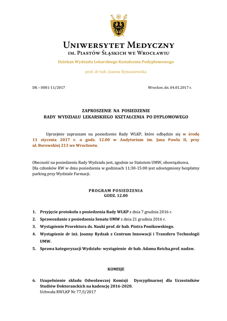 Dziekan Wydziału Lekarskiego Kształcenia Podyplomowego prof. dr hab. Joanna Rymaszewska DK – 0001-11/2017 Wrocław, dn. 04.01.2017 r. ZAPROSZENIE NA POSIEDZENIE RADY WYDZIAŁU LEKARSKIEGO KSZTAŁCENIA PO DYPLOMOWEGO Uprzejmie zapraszam na posiedzenie Rady WLKP, które odbędzie się w środę 11 stycznia 2017 r. o godz. 12.00 w Audytorium im. Jana Pawła II, przy ul. Borowskiej 213 we Wrocławiu. Obecność na posiedzeniu Rady Wydziału jest, zgodnie ze Statutem UMW, obowiązkowa. Dla członków RW w dniu posiedzenia w godzinach 11:30-15:00 jest udostępniony bezpłatny parking przy Wydziale Farmacji. PROGRAM POSIEDZENIA GODZ. 12.00 1. Przyjęcie protokołu z posiedzenia Rady WLKP z dnia 7 grudnia 2016 r. 2. Sprawozdanie z posiedzenia Senatu UMW z dnia 21 grudnia 2016 r. 3. Wystąpienie Prorektora ds. Nauki prof. dr hab. Piotra Ponikowskiego. 4. Wystąpienie dr inż. Joanny Rydzak z Centrum Innowacji i Transferu Technologii UMW. 5. Sprawa kategoryzacji Wydziału- wystąpienie dr hab. Adama Reicha,prof. nadzw. KOMISJE 6. Uzupełnienie składu Odwoławczej Komisji Dyscyplinarnej dla Uczestników Studiów Doktoranckich na kadencję 2016-2020. Uchwała RWLKP Nr 77/I/2017 RESTRUKTURYZACJA 7. Sprawa przekształcenia Katedry i Kliniki Neurochirurgii oraz utworzenia Zakładu Neurochirurgii Regeneracyjnej i Funkcjonalnej przy Katedrze Neurochirurgii UMW. Uchwała RWLKP Nr 78/I/2017 8. Sprawa utworzenia Kliniki Radioterapii przy Katedrze Onkologii UMW. Uchwała RWLKP Nr 79/I/2017 9. Sprawa likwidacji Samodzielej Pracowni Monitorowania Zakażeń u Osób Uzależnionych Katedry Chorób Zakaźnych, Chorób Wątroby i Nabytych Niedoborów Odpornościowych UMW. Uchwała RWLKP Nr 80/I/2017 10. Sprawa przekształcenia Katedry Chorób Zakaźnych, Chorób Wątroby i Nabytych Niedoborów Odpornościowych oraz Kliniki Chorób Zakaźnych, Chorób Wątroby i Nabytych Niedoborów Odpornościowych w Katedrę i Klinikę Chorób Zakaźnych, Chorób Wątroby i Nabytych Niedoborów Odpornościowych UMW. Uchwała RWLKP Nr 81/I/2017 KOMISJE KONKURSOWE Powołanie komisji konkursowej ds. obsady funkcji kierownika: 11. Katedry i Kliniki Urologii i Onkologii Urologicznej UMW Uchwała RWLKP Nr 82/I/2017 12. Katedry i Kliniki Transplantacji Szpiku, Onkologii i Hematologii Dziecięcej UMW Uchwała RWLKP Nr 83/I/2017 13. Katedry i Kliniki Hematologii, Nowotworów Krwi i Transplantacji Szpiku UMW Uchwała RWLKP Nr 84/I/2017 14. Katedry Neurologii i Kliniki Neurologii UMW Uchwała RWLKP Nr 85/I/2017 15. Zakładu Psychiatrii Konsultacyjnej Psychiatrii UMW Uchwała RWLKP Nr 86/I/2017 i Badań Neurobiologicznych Katedry KONKURSY NA STANOWISKA NAUCZYCIELI AKADEMICKICH Powołanie komisji konkursowej na stanowisko profesora nadzwyczajnego: 16. Katedra i Klinika Neurologii UMW Uchwała RWLKP Nr 87/I/2017 2 TYTUŁ NAUKOWY 17. Powołanie zespołu do przeprowadzenia postępowania o nadanie tytułu naukowego profesora nauk medycznych dr. hab Elżbiecie Poniewierce, prof. nadzw. z Katedry i Kliniki Gastroenterologii i Hepatologii UMW Uchwała RWLKP Nr 88/X/2016 HABILITACJE 18. Głosowanie w sprawie wyrażenia zgody na przeprowadzenie postępowania habilitacyjnego oraz powołania trzech członków komisji habilitacyjnej: a) dr Ewy Milnerowicz-Nabzdyk adiunkt w II Katedrze i Klinice Ginekologii i Położnictwa Wydziału Lekarskiego UMW, Uchwała RWLKP Nr 89/I/2017 tytuł osiągnięcia naukowego „Cechy ultrasonograficzne oraz wybrane markery biochemiczne u ciężarnych kobiet palących papierosy ze szczególnym uwzględnieniem grupy prezentującej wewnątrzmaciczne zahamowanie wzrostu płodu”. DOKTORATY 19. Nadanie stopnia naukowego doktora w dziedzinie nauk medycznych w dyscyplinie medycyna: a) lek. Przemysławowi Januszowi Uchwała RWLKP Nr 91/I/2017 b) lek. Elżbiecie Gwieździe-Madej Uchwała RWLKP Nr 92/I/2017 c) lek. Konradowi Kaazowi Uchwała RWLKP Nr 93/I/2017 d) lek. Aleksandrze Wieczorek Uchwała RWLKP Nr 94/I/2017 e) mgr psychologii Annie Jeleń Uchwała RWLKP Nr 95/I/2017 f) lek. Annie Sieja-Bujewskiej Uchwała RWLKP Nr 96/I/2017 20. Wyróżnienie rozprawy doktorskiej dr Aleksandry Rojek. Uchwała RWLKP Nr 97/I/2017 21. Wybór komisji przeprowadzającej egzaminy doktorskie, komisji doktorskiej oraz recenzentów do oceny rozprawy doktorskiej: 3 a) lek. Kamila Kaczorowskiego rezydenta Katedry i Kliniki Okulistyki UM we Wrocławiu, Uchwała RWLKP Nr 98/I/2017 tytuł pracy doktorskiej: „Porównanie morfologii tarczy nerwu wzrokowego i funkcji nerwu wzrokowego za pomocą różnych metod badawczych w diagnostyce jaskry.” promotor: prof. dr hab. Marta Misiuk-Hojło promotor pomocniczy: dr Małgorzata Mulak b) lek. Barbary Kraszewskiej-Głomby uczestnika studiów doktoranckich w Katedrze i Klinice Pediatrii i Chorób Infekcyjnych UM we Wrocławiu, Uchwała RWLKP Nr 99/I/2017 tytuł pracy doktorskiej: „Gorączki nawrotowe o podłożu autozapalnym u dzieci”. promotor: dr hab. Leszek Szenborn, prof. nadzw. c) lek. Wojciecha Krajewskiego rezydenta w Klinice Urologii i Onkologii Urologicznej UMW Uchwała RWLKP Nr 100/I/2017 tytuł pracy doktorskiej: „Ocena nowych metod diagnostycznych w raku pęcherza moczowego.” promotor: prof. dr hab. Romuald Zdrojowy d) lek. Iwony Wiśniewskiej starszego asystenta Zakładu Radioterapii Dolnośląskiego Centrum Onkologii we Wrocławiu, Uchwała RWLKP Nr 101/I/2017 tytuł pracy doktorskiej: „Ocena wskaźników funkcji płuc w okresie ostrego odczynu popromiennego u pacjentek poddanych uzupełniającej radioterapii z powodu raka piersi. promotor: dr hab. Andrzej Tukiendorf, prof. nadzw e) lek. Michała Pulińskiego asystenta w Klinice Chirurgii Dziecięcej, Uniwersytet Warmińsko-Mazurski w Olsztynie, Uchwała RWLKP Nr 102/I/2017 tytuł pracy doktorskiej: „Analiza niepowodzeń w leczeniu odpływu pęcherzowo-moczowodowego u dzieci za pomocą ostrzyknięcia ujścia moczowodu dekstromerem kwasu hialuronowego”. promotor: prof. dr hab. Dariusz Patkowski 22. Sprawy różne, pytania, wolne w