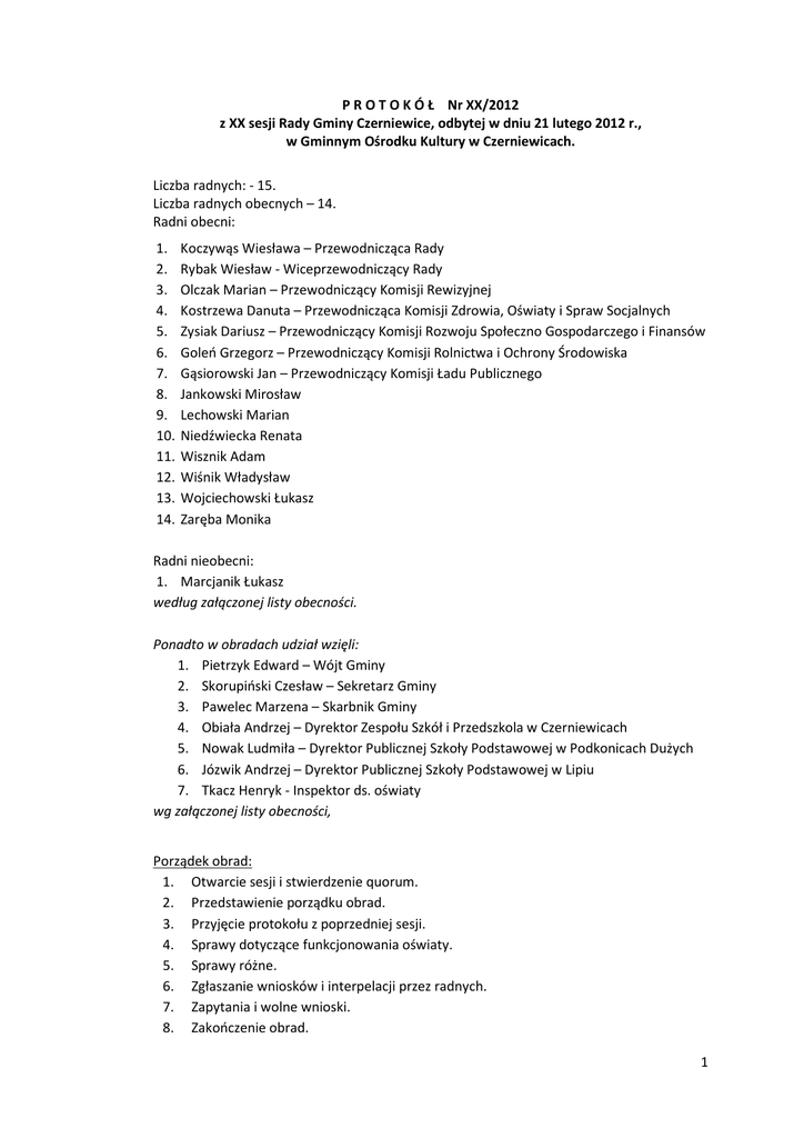 P R O T O K Ó Ł Nr XX/2012 z XX sesji Rady Gminy Czerniewice, odbytej w dniu 21 lutego 2012 r., w Gminnym Ośrodku Kultury w Czerniewicach. Liczba radnych: - 15. Liczba radnych obecnych – 14. Radni obecni: 1. 2. 3. 4. 5. 6. 7. 8. 9. 10. 11. 12. 13. 14. Koczywąs Wiesława – Przewodnicząca Rady Rybak Wiesław - Wiceprzewodniczący Rady Olczak Marian – Przewodniczący Komisji Rewizyjnej Kostrzewa Danuta – Przewodnicząca Komisji Zdrowia, Oświaty i Spraw Socjalnych Zysiak Dariusz – Przewodniczący Komisji Rozwoju Społeczno Gospodarczego i Finansów Goleń Grzegorz – Przewodniczący Komisji Rolnictwa i Ochrony Środowiska Gąsiorowski Jan – Przewodniczący Komisji Ładu Publicznego Jankowski Mirosław Lechowski Marian Niedźwiecka Renata Wisznik Adam Wiśnik Władysław Wojciechowski Łukasz Zaręba Monika Radni nieobecni: 1. Marcjanik Łukasz według załączonej listy obecności. Ponadto w obradach udział wzięli: 1. Pietrzyk Edward – Wójt Gminy 2. Skorupiński Czesław – Sekretarz Gminy 3. Pawelec Marzena – Skarbnik Gminy 4. Obiała Andrzej – Dyrektor Zespołu Szkół i Przedszkola w Czerniewicach 5. Nowak Ludmiła – Dyrektor Publicznej Szkoły Podstawowej w Podkonicach Dużych 6. Józwik Andrzej – Dyrektor Publicznej Szkoły Podstawowej w Lipiu 7. Tkacz Henryk - Inspektor ds. oświaty wg załączonej listy obecności, Porządek obrad: 1. Otwarcie sesji i stwierdzenie quorum. 2. Przedstawienie porządku obrad. 3. Przyjęcie protokołu z poprzedniej sesji. 4. Sprawy dotyczące funkcjonowania oświaty. 5. Sprawy różne. 6. Zgłaszanie wniosków i interpelacji przez radnych. 7. Zapytania i wolne wnioski. 8. Zakończenie obrad. 1 Punkt – 1. Obrady XX sesji Rady Gminy Czerniewice otworzyła Przewodnicząca Rady Wiesława Koczywąs. Powitała Wójta Gminy Pietrzyka Edwarda, radnych, dyrektorów szkół i pracowników Urzędu Gminy w Czerniewicach z Sekretarzem Gminy na czele. Na podstawie listy obecności Przewodnicząca stwierdziła, że na stan 15 radnych, listę podpisało 14 radnych, co oznacza, że obrady są prawomocne i Rada jest władna do podejmowania wszelkich decyzji i uchwał. Punkt – 2. Przewodnicząca poinformowała, że porządek obrad radni otrzymali wraz z zaproszeniem na sesję. Wobec nie zgłoszenia propozycji zmian i uwag przystąpiła do jego realizacji. Punkt – 3. Protokół poprzedniej sesji były wyłożony do wglądu przed sesją, jak też była możliwość wcześniejszego zapoznania się z nim u pracownika obsługującego Radę, Przewodnicząca zapytała radnych, czy mają uwagi do ich treści. Ponieważ radni żadnych zastrzeżeń nie zgłosili, Przewodnicząca poddała protokół pod głosowanie. Rada Gminy w obecności 14 radnych uczestniczących w posiedzeniu – 14 głosami „za” bez głosów „przeciwnych”, oraz „wstrzymujących” przyjęła protokół z XIX sesji Rady Gminy Czerniewice w przedstawionej wersji. Punkt – 4. Wójt Gminy na wstępie poinformował, że sprawą funkcjonowania oświaty zajmowała się komisja oświaty. Nie można spraw oświaty pozostawiać samym sobie. Trzeba na bieżąco je analizować z uwagi na to, że wydatki oświatowe rzutują na budżety samorządów. Te sprawy są omawiane również w pobliskich gminach. Niektóre gminy, przykładowo Żelechlinek pozostawiły 1 szkołę, zlikwidowali placówki w terenie. W Gminie Czerniewice są placówki w terenie. Następnie Wójt Gminy ustosunkował się do sygnałów, jakie docierały do Wójta Gminy, że jest coś robione bez konsultacji. Wyjaśnił, że najpierw Rada powinna zająć odpowiednie stanowisko a dopiero później przekazać je mieszkańcom. Informacje bardzo szybko się tworzą prawdziwe i nieprawdziwe. Dlatego dokonano analizy finansowej. Jeśli chciałoby się podjąć decyzję, to należy ją to zrobić do końca lutego. Z uwagi na to, że po decyzji Rady muszą być konsultacje społeczne, musi zostać zawiadomiony kurator. Zasygnalizował, że w Ministerstwie trwają prace nad zmianami przepisów. Zdaniem Wójta Gminy niepokojące jest to, że w szkole podstawowej w Podkonicach bardzo szybko spada liczba dzieci. Na dzień dzisiejszy jest w granicach 60 uczniów. Dalej jest 2 coraz gorzej (szczegółowe materiały zostały radnym przekazane). Kolejny istotny element to koszty funkcjonowania szkół. Wójt Gminy zaznaczył, że jest pierwszym, który jest za tym, żeby ta szkoła była. Ponieważ włożono wiele wysiłku, pracy i ładny obiekt wykonano. Podobna sytuacja była kiedyś w Lipiu. Tylko, że w Lipiu była 1 taka klasa - 4 osobowa. Natomiast patrząc na Podkonice to zaczyna wyglądać, że będą tylko klasy 4, 5, 6 osobowe. Miejmy nadzieję, że dzieci będą. Jednak teraz trzeba się zastanowić, jak przetrwać ten okres nie likwidując szkoły, a minimalizując koszty. To było głównym celem posiedzenia komisji i jest głównym punktem sesji. Gmina otrzymała subwencji oświatowej 3.744.000 zł. Natomiast koszty utrzymania oświaty tj. 4.460.000 zł. Informacja dotyczy roku 2011. Pozostała kwota została przekazana z budżetu Gminy. Na jednego ucznia wychodzi koszt 7.672 zł w ciągu roku. Koszty poniesione w Zespole Szkół i Przedszkola w Czerniewicach wyniosły 7.024.zł. W Lipiu 8.231 zł w Podkonicach 9.434 zł. Jeśli demografia wskazywałaby, że liczba uczniów się zwiększy trzeba byłoby to przetrzymać. Poinformował, że analizowano szkolę w Lipiu również. W Lipiu tendencja jest bardzo dobra, bo zwyżkowa: 19, 16, 20 uczniów w perspektywie, to są bardzo dobre klasy. Dlatego Lipie pozostaje bez zmian. Odnośnie Podkonic podjęto decyzję, że zamiast samodzielnej placówki, zaproponowano utworzenie filii w Czerniewicach. Brano pod uwagę i sprawy finansowe, które by zmniejszyły koszty i organizacyjne (elastyczność zatrudniania nauczycieli, obsługi, księgowości itp.). Z taką wiedzą chciał, żeby Rada się zapoznała i podjęła decyzję, był nawet przygotowany projekt uchwały Ra