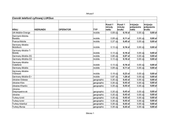 Arkusz1 Cennik telefonii cyfrowej LUKSus KRAJ UK-Mobile-Orange KIERUNEK OPERATOR TYP mobile Koszt 1 Koszt 1 inicjacja inicjacja minuty minuty połączenia połączenia netto brutto netto brutto 0,10 zł 0,00 zł 0,09 zł 0,00 zł Denmark-MobileBarablu France-Mobile mobile mobile 0,09 zł 0,37 zł 0,11 zł 0,45 zł 0,00 zł 0,00 zł 0,00 zł 0,00 zł Germany-MobileMobilkom mobile 0,13 zł 0,16 zł 0,00 zł 0,00 zł Germany-Mobile-TMobile Germany-Mobile-3G Germany-Mobile-O2 mobile mobile mobile 0,13 zł 0,06 zł 0,13 zł 0,16 zł 0,07 zł 0,16 zł 0,00 zł 0,00 zł 0,00 zł 0,00 zł 0,00 zł 0,00 zł Germany-MobileVodafone Germany-Mobile mobile mobile 0,13 zł 0,09 zł 0,16 zł 0,11 zł 0,00 zł 0,00 zł 0,00 zł 0,00 zł Germany-MobileViStream Germany-Mobile-E+ Ukraine-Odessa Ukraine-Kiev Ukraine-Kharkiv mobile mobile geographic geographic geographic 0,19 zł 0,97 zł 0,35 zł 0,35 zł 0,35 zł 0,23 zł 1,20 zł 0,43 zł 0,43 zł 0,43 zł 0,00 zł 0,00 zł 0,00 zł 0,00 zł 0,00 zł 0,00 zł 0,00 zł 0,00 zł 0,00 zł 0,00 zł UkraineDnepropetrovsk Ukraine Turkey-Izmit Turkey-Izmir Turkey-Istanbul Turkey-Bursa geographic geographic geographic geographic geographic geographic 0,35 zł 0,35 zł 0,35 zł 0,35 zł 0,35 zł 0,35 zł 0,43 zł 0,43 zł 0,43 zł 0,43 zł 0,43 zł 0,43 zł 0,00 zł 0,00 zł 0,00 zł 0,00 zł 0,00 zł 0,00 zł 0,00 zł 0,00 zł 0,00 zł 0,00 zł 0,00 zł 0,00 zł Strona 1 Arkusz1 Turkey-Antalya Turkey-Ankara Turkey Slovenia-OLO Slovenia Slovakia Romania-ROC Romania-Bucharest Romania Monaco Moldova-Pridnestrvie Malta geographic geographic geographic geographic geographic geographic geographic geographic geographic geographic geographic geographic 0,35 zł 0,35 zł 0,35 zł 0,35 zł 0,35 zł 0,35 zł 0,35 zł 0,35 zł 0,35 zł 0,35 zł 0,35 zł 0,35 zł 0,43 zł 0,43 zł 0,43 zł 0,43 zł 0,43 zł 0,43 zł 0,43 zł 0,43 zł 0,43 zł 0,43 zł 0,43 zł 0,43 zł 0,00 zł 0,00 zł 0,00 zł 0,00 zł 0,00 zł 0,00 zł 0,00 zł 0,00 zł 0,00 zł 0,00 zł 0,00 zł 0,00 zł 0,00 zł 0,00 zł 0,00 zł 0,00 zł 0,00 zł 0,00 zł 0,00 zł 0,00 zł 0,00 zł 0,00 zł 0,00 zł 0,00 zł LiechtensteinPremium Liechtenstein Iceland Hungary-Budapest Hungary Hong-Kong Greece-Athens Greece Gibraltar geographic geographic geographic geographic geographic geographic geographic geographic geographic 0,35 zł 0,35 zł 0,35 zł 0,35 zł 0,35 zł 0,35 zł 0,35 zł 0,35 zł 0,35 zł 0,43 zł 0,43 zł 0,43 zł 0,43 zł 0,43 zł 0,43 zł 0,43 zł 0,43 zł 0,43 zł 0,00 zł 0,00 zł 0,00 zł 0,00 zł 0,00 zł 0,00 zł 0,00 zł 0,00 zł 0,00 zł 0,00 zł 0,00 zł 0,00 zł 0,00 zł 0,00 zł 0,00 zł 0,00 zł 0,00 zł 0,00 zł Czech-RepublicPrague Czech-Republic Cyprus Croatia China-Shenzhen China-Shanghai China-Guangzhou geographic geographic geographic geographic geographic geographic geographic 0,35 zł 0,35 zł 0,35 zł 0,35 zł 0,35 zł 0,35 zł 0,35 zł 0,43 zł 0,43 zł 0,43 zł 0,43 zł 0,43 zł 0,43 zł 0,43 zł 0,00 zł 0,00 zł 0,00 zł 0,00 zł 0,00 zł 0,00 zł 0,00 zł 0,00 zł 0,00 zł 0,00 zł 0,00 zł 0,00 zł 0,00 zł 0,00 zł Strona 2 Arkusz1 China-Beijing China Bulgaria-Sofia Bulgaria Andorra Ukraine-Lviv Turkey-North-Cyprus Turkey-Adana Slovakia-Bratislava Moldova Croatia-Zagreb Romania-Romtelecom USA geographic geographic geographic geographic geographic geographic geographic geographic geographic geographic geographic geographic geographic 0,35 zł 0,35 zł 0,35 zł 0,35 zł 0,35 zł 0,35 zł 0,35 zł 0,35 zł 0,35 zł 0,35 zł 0,35 zł 0,35 zł 0,10 zł 0,43 zł 0,43 zł 0,43 zł 0,43 zł 0,43 zł 0,43 zł 0,43 zł 0,43 zł 0,43 zł 0,43 zł 0,43 zł 0,43 zł 0,12 zł 0,00 zł 0,00 zł 0,00 zł 0,00 zł 0,00 zł 0,00 zł 0,00 zł 0,00 zł 0,00 zł 0,00 zł 0,00 zł 0,00 zł 0,00 zł 0,00 zł 0,00 zł 0,00 zł 0,00 zł 0,00 zł 0,00 zł 0,00 zł 0,00 zł 0,00 zł 0,00 zł 0,00 zł 0,00 zł 0,00 zł UK-Personal-Numbers UK-Manchester UK-London UK-Local 0844 UK-Edinburgh UK Switzerland-Zurich geographic geographic geographic geographic geographic geographic geographic 0,10 zł 0,10 zł 0,10 zł 0,10 zł 0,10 zł 0,10 zł 0,10 zł 0,12 zł 0,12 zł 0,12 zł 0,12 zł 0,12 zł 0,12 zł 0,12 zł 0,00 zł 0,00 zł 0,00 zł 0,00 zł 0,00 zł 0,00 zł 0,00 zł 0,00 zł 0,00 zł 0,00 zł 0,00 zł 0,00 zł 0,00 zł 0,00 zł Switzerland-Lausanne Switzerland-Geneva Switzerland Sweden Spain-Madrid Spain-Barcelona San-Marino Russia-St.Petersburg geographic geographic geographic geographic geographic geographic geographic geographic 0,10 zł 0,10 zł 0,10 zł 0,10 zł 0,10 zł 0,10 zł 0,10 zł 0,10 zł 0,12 zł 0,12 zł 0,12 zł 0,12 zł 0,12 zł 0,12 zł 0,12 zł 0,12 zł 0,00 zł 0,00 zł 0,00 zł 0,00 zł 0,00 zł 0,00 zł 0,00 zł 0,00 zł 0,00 zł 0,00 zł 0,00 zł 0,00 zł 0,00 zł 0,00 zł 0,00 zł 0,00 zł Strona 3 Arkusz1 Russia 3 Russia 2 Russia Portugal-Lisbon Portugal Norway New-Zealand Netherland-Antilles Malaysia Japan-Tokyo Japan-IP-Phone Japan Italy-Vatican-City Italy-Rome Italy Ireland Germany FRANCE-PARIS FRANCE-OLO France Finland-Helsinki Estonia Canada-Quebec Canada-Other Canada-Ontario Canada-Manitoba Canada-BR-Columbia Canada-Alberta Canada Austria-Vienna geographic geographic geographic geographic geographic geographic geographic geographic geographic geographic geographic geographic geographic geographic geographic geographic geographic geographic geographic geographic geographic geographic geographic geographic geographic geographic geographic geographic geographic geographic Strona 4 0,10 zł 0,10 zł 0,10 zł 0,10 zł 0,10 zł 0,10 zł 0,10 zł 0,10 zł 0,10 zł 0,10 zł 0,10 zł 0,10 zł 0,10 zł 0,10 zł 0,10 zł 0,10 zł 0,10 zł 0,10 zł 0,10 zł 0,10 zł 0,10 zł 0,10 zł 0,10 zł 0,10 zł 0,10 zł 0,10 zł 0,10 zł 0,10 zł 0,10 zł 0,10 zł 0,12 zł 0,12 zł 0,12 zł 0,12 zł 0,12 zł 0,12 zł 0,12 zł 0,12 zł 0,12 zł 0,12 zł 0,12 zł 0,12 zł 0,12 zł 0,12 zł 0,12 zł 0,12 zł 0,12 zł 0,12 zł 0,12 zł 0,12 zł 0,12 zł 0,12 zł 0,12 zł 0,12 zł 0,12 zł