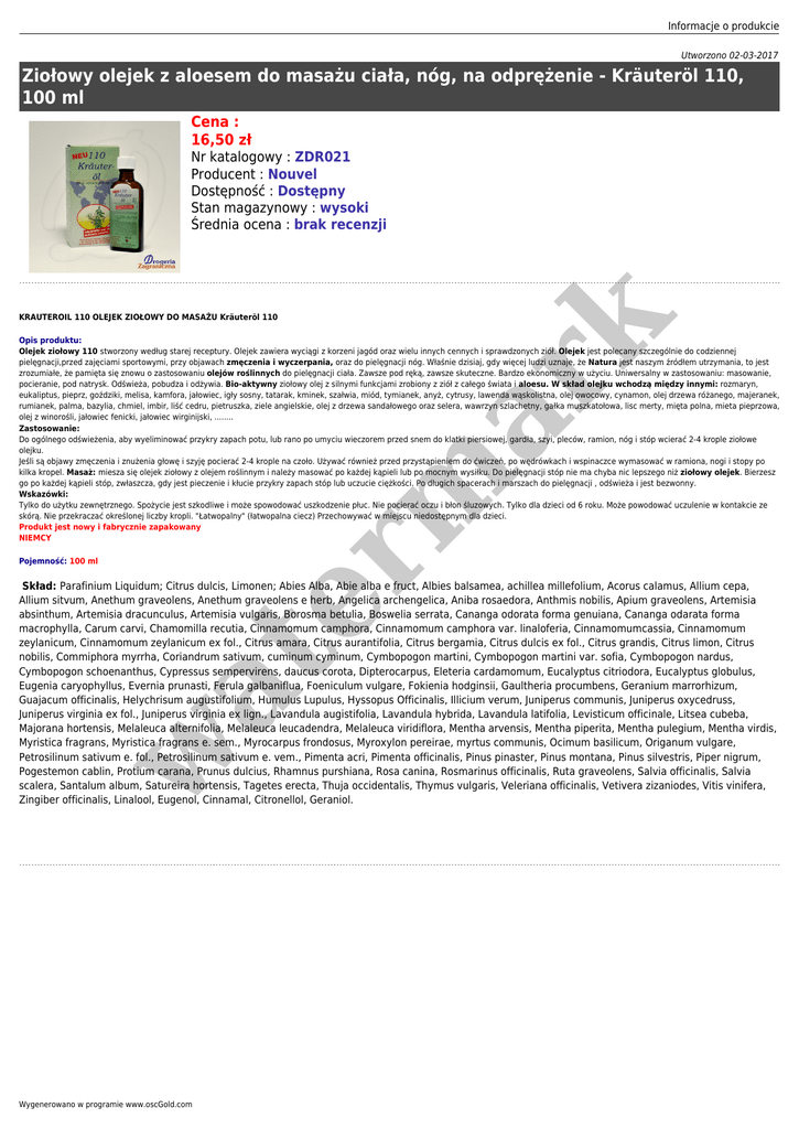 Informacje o produkcie Utworzono 02-03-2017 Ziołowy olejek z aloesem do masażu ciała, nóg, na odprężenie - Kräuteröl 110, 100 ml Cena : 16,50 zł Nr katalogowy : ZDR021 Producent : Nouvel Dostępność : Dostępny Stan magazynowy : wysoki Średnia ocena : brak recenzji er m ar k KRAUTEROIL 110 OLEJEK ZIOŁOWY DO MASAŻU Kräuteröl 110 Opis produktu: Olejek ziołowy 110 stworzony według starej receptury. Olejek zawiera wyciągi z korzeni jagód oraz wielu innych cennych i sprawdzonych ziół. Olejek jest polecany szczególnie do codziennej pielęgnacji,przed zajęciami sportowymi, przy objawach zmęczenia i wyczerpania, oraz do pielęgnacji nóg. Właśnie dzisiaj, gdy więcej ludzi uznaje, że Natura jest naszym źródłem utrzymania, to jest zrozumiałe, że pamięta się znowu o zastosowaniu olejów roślinnych do pielęgnacji ciała. Zawsze pod ręką, zawsze skuteczne. Bardzo ekonomiczny w użyciu. Uniwersalny w zastosowaniu: masowanie, pocieranie, pod natrysk. Odświeża, pobudza i odżywia. Bio-aktywny ziołowy olej z silnymi funkcjami zrobiony z ziół z całego świata i aloesu. W skład olejku wchodzą między innymi: rozmaryn, eukaliptus, pieprz, goździki, melisa, kamfora, jałowiec, igły sosny, tatarak, kminek, szałwia, miód, tymianek, anyż, cytrusy, lawenda wąskolistna, olej owocowy, cynamon, olej drzewa różanego, majeranek, rumianek, palma, bazylia, chmiel, imbir, liść cedru, pietruszka, ziele angielskie, olej z drzewa sandałowego oraz selera, wawrzyn szlachetny, gałka muszkatołowa, lisc merty, mięta polna, mieta pieprzowa, olej z winorośli, jałowiec fenicki, jałowiec wirginijski, ........ Zastosowanie: Do ogólnego odświeżenia, aby wyeliminować przykry zapach potu, lub rano po umyciu wieczorem przed snem do klatki piersiowej, gardła, szyi, pleców, ramion, nóg i stóp wcierać 2-4 krople ziołowe olejku. Jeśli są objawy zmęczenia i znużenia głowę i szyję pocierać 2-4 krople na czoło. Używać również przed przystąpieniem do ćwiczeń, po wędrówkach i wspinaczce wymasować w ramiona, nogi i stopy po kilka kropel. Masaż: miesza się olejek ziołowy z olejem roślinnym i należy masować po każdej kąpieli lub po mocnym wysiłku. Do pielęgnacji stóp nie ma chyba nic lepszego niż ziołowy olejek. Bierzesz go po każdej kąpieli stóp, zwłaszcza, gdy jest pieczenie i kłucie przykry zapach stóp lub uczucie ciężkości. Po długich spacerach i marszach do pielęgnacji , odświeża i jest bezwonny. Wskazówki: Tylko do użytku zewnętrznego. Spożycie jest szkodliwe i może spowodować uszkodzenie płuc. Nie pocierać oczu i błon śluzowych. Tylko dla dzieci od 6 roku. Może powodować uczulenie w kontakcie ze skórą. Nie przekraczać określonej liczby kropli. "Łatwopalny" (łatwopalna ciecz) Przechowywać w miejscu niedostępnym dla dzieci. Produkt jest nowy i fabrycznie zapakowany NIEMCY Pojemność: 100 ml w at Skład: Parafinium Liquidum; Citrus dulcis, Limonen; Abies Alba, Abie alba e fruct, Albies balsamea, achillea millefolium, Acorus calamus, Allium cepa, Allium sitvum, Anethum graveolens, Anethum graveolens e herb, Angelica archengelica, Aniba rosaedora, Anthmis nobilis, Apium graveolens, Artemisia absinthum, Artemisia dracunculus, Artemisia vulgaris, Borosma betulia, Boswelia serrata, Cananga odorata forma genuiana, Cananga odarata forma macrophylla, Carum carvi, Chamomilla recutia, Cinnamomum camphora, Cinnamomum camphora var. linaloferia, Cinnamomumcassia, Cinnamomum zeylanicum, Cinnamomum zeylanicum ex fol., Citrus amara, Citrus aurantifolia, Citrus bergamia, Citrus dulcis ex fol., Citrus grandis, Citrus limon, Citrus nobilis, Commiphora myrrha, Coriandrum sativum, cuminum cyminum, Cymbopogon martini, Cymbopogon martini var. sofia, Cymbopogon nardus, Cymbopogon schoenanthus, Cypressus sempervirens, daucus corota, Dipterocarpus, Eleteria cardamomum, Eucalyptus citriodora, Eucalyptus globulus, Eugenia caryophyllus, Evernia prunasti, Ferula galbaniflua, Foeniculum vulgare, Fokienia hodginsii, Gaultheria procumbens, Geranium marrorhizum, Guajacum officinalis, Helychrisum augustifolium, Humulus Lupulus, Hyssopus Officinalis, Illicium verum, Juniperus communis, Juniperus oxycedruss, Juniperus virginia ex fol., Juniperus virginia ex lign., Lavandula augistifolia, Lavandula hybrida, Lavandula latifolia, Levisticum officinale, Litsea cubeba, Majorana hortensis, Melaleuca alternifolia, Melaleuca leucadendra, Melaleuca viridiflora, Mentha arvensis, Mentha piperita, Mentha pulegium, Mentha virdis, Myristica fragrans, Myristica fragrans e. sem., Myrocarpus frondosus, Myroxylon pereirae, myrtus communis, Ocimum basilicum, Origanum vulgare, Petrosilinum sativum e. fol., Petrosilinum sativum e. vem., Pimenta acri, Pimenta officinalis, Pinus pinaster, Pinus montana, Pinus silvestris, Piper nigrum, Pogestemon cablin, Protium carana, Prunus dulcius, Rhamnus purshiana, Rosa canina, Rosmarinus officinalis, Ruta graveolens, Salvia officinalis, Salvia scalera, Santalum album, Satureira hortensis, Tagetes erecta, Thuja occidentalis, Thymus vulgaris, Veleriana officinalis, Vetivera zizaniodes, Vitis vinifera, Zingiber officinalis, Linalool, Eugenol, Cinnamal, Citronellol, Geraniol. Wygenerowano w programie www.oscGold.com