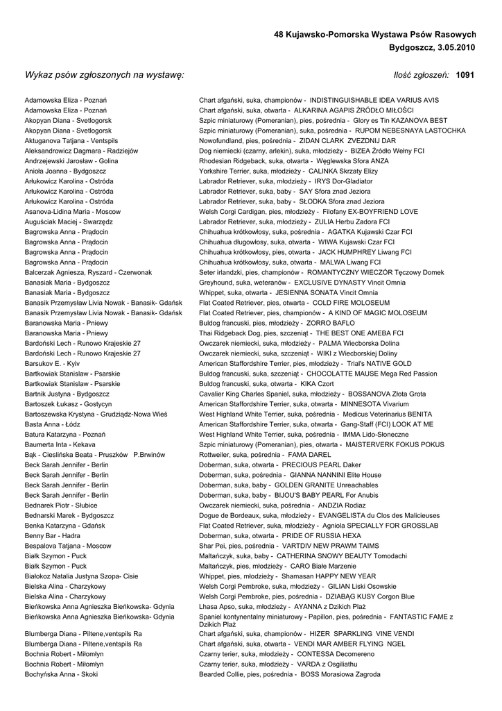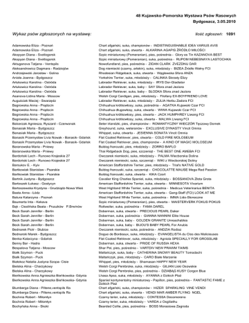48 Kujawsko-Pomorska Wystawa Psów Rasowych Bydgoszcz, 3.05.2010 Wykaz psów zgłoszonych na wystawę: Ilość zgłoszeń: 1091 Adamowska Eliza - Poznań Chart afgański, suka, championów - INDISTINGUISHABLE IDEA VARIUS AVIS Adamowska Eliza - Poznań Akopyan Diana - Svetlogorsk Chart afgański, suka, otwarta - ALKARINA AGAPIS ŹRÓDŁO MIŁOŚCI Szpic miniaturowy (Pomeranian), pies, pośrednia - Glory es Tin KAZANOVA BEST Akopyan Diana - Svetlogorsk Szpic miniaturowy (Pomeranian), suka, pośrednia - RUPOM NEBESNAYA LASTOCHKA Aktuganova Tatjana - Ventspils Aleksandrowicz Dagmara - Radziejów Nowofundland, pies, pośrednia - ZIDAN CLARK ZVEZDNIJ DAR Dog niemiecki (czarny, arlekin), suka, młodzieży - BIZEA Źródło Wełny FCI Andrzejewski Jarosław - Golina Rhodesian Ridgeback, suka, otwarta - Węglewska Sfora ANZA Anioła Joanna - Bydgoszcz Arłukowicz Karolina - Ostróda Yorkshire Terrier, suka, młodzieży - CALINKA Skrzaty Elizy Labrador Retriever, suka, młodzieży - IRYS Dor-Gladiator Arłukowicz Karolina - Ostróda Labrador Retriever, suka, baby - SAY Sfora znad Jeziora Arłukowicz Karolina - Ostróda Asanova-Lidina Maria - Moscow Labrador Retriever, suka, baby - SŁODKA Sfora znad Jeziora Welsh Corgi Cardigan, pies, młodzieży - Filofany EX-BOYFRIEND LOVE Auguściak Maciej - Swarzędz Labrador Retriever, suka, młodzieży - ZULIA Herbu Zadora FCI Bagrowska Anna - Prądocin Bagrowska Anna - Prądocin Chihuahua krótkowłosy, suka, pośrednia - AGATKA Kujawski Czar FCI Chihuahua długowłosy, suka, otwarta - WIWA Kujawski Czar FCI Bagrowska Anna - Prądocin Chihuahua krótkowłosy, pies, otwarta - JACK HUMPHREY Liwang FCI Bagrowska Anna - Prądocin Chihuahua krótkowłosy, suka, otwarta - MALWA Liwang FCI Balcerzak Agniesza, Ryszard - Czerwonak Banasiak Maria - Bydgoszcz Banasiak Maria - Bydgoszcz Banasik Przemysław Livia Nowak - Banasik- Gdańsk Seter irlandzki, pies, championów - ROMANTYCZNY WIECZÓR Tęczowy Domek Greyhound, suka, weteranów - EXCLUSIVE DYNASTY Vincit Omnia Whippet, suka, otwarta - JESIENNA SONATA Vincit Omnia Flat Coated Retriever, pies, otwarta - COLD FIRE MOLOSEUM Banasik Przemysław Livia Nowak - Banasik- Gdańsk Baranowska Maria - Pniewy Flat Coated Retriever, pies, championów - A KIND OF MAGIC MOLOSEUM Buldog francuski, pies, młodzieży - ZORRO BAFLO Baranowska Maria - Pniewy Bardoński Lech - Runowo Krajeskie 27 Bardoński Lech - Runowo Krajeskie 27 Thai Ridgeback Dog, pies, szczeniąt - THE BEST ONE AMEBA FCI Owczarek niemiecki, suka, młodzieży - PALMA Wiecborska Dolina Owczarek niemiecki, suka, szczeniąt - WIKI z Wiecborskiej Doliny Barsukov E. - Kyiv Bartkowiak Stanislaw - Psarskie Bartkowiak Stanislaw - Psarskie American Staffordshire Terrier, pies, młodzieży - Trial's NATIVE GOLD Buldog francuski, suka, szczeniąt - CHOCOLATTE MAUSE Mega Red Passion Buldog francuski, suka, otwarta - KIKA Czort Bartnik Justyna - Bydgoszcz Bartoszek Łukasz - Gostycyn Bartoszewska Krystyna - Grudziądz-Nowa Wieś Cavalier King Charles Spaniel, suka, młodzieży - BOSSANOVA Złota Grota American Staffordshire Terrier, suka, otwarta - MINNESOTA Vivarium West Highland White Terrier, suka, pośrednia - Medicus Veterinarius BENITA Basta Anna - Łódz Batura Katarzyna - Poznań Baumerta Inta - Kekava Bąk - Cieslińska Beata - Pruszków P.Brwinów Beck Sarah Jennifer - Berlin Beck Sarah Jennifer - Berlin Beck Sarah Jennifer - Berlin Beck Sarah Jennifer - Berlin Bednarek Piotr - Słubice Bednarski Marek - Bydgoszcz American Staffordshire Terrier, suka, otwarta - Gang-Staff (FCI) LOOK AT ME West Highland White Terrier, suka, pośrednia - IMMA Lido-Słoneczne Szpic miniaturowy (Pomeranian), pies, otwarta - MAISTERVERK FOKUS POKUS Rottweiler, suka, pośrednia - FAMA DAREL Doberman, suka, otwarta - PRECIOUS PEARL Daker Doberman, suka, pośrednia - GIANNA NANNINI Elite House Doberman, suka, baby - GOLDEN GRANITE Unreachables Doberman, suka, baby - BIJOU'S BABY PEARL For Anubis Owczarek niemiecki, suka, pośrednia - ANDZIA Rodiaz Dogue de Bordeaux, suka, młodzieży - EVANGELISTA du Clos des Malicieuses Benka Katarzyna - Gdańsk Benny Bar - Hadra Bespalova Tatjana - Moscow Białk Szymon - Puck Białk Szymon - Puck Białokoz Natalia Justyna Szopa- Cisie Bielska Alina - Charzykowy Bielska Alina - Charzykowy Bieńkowska Anna Agnieszka Bieńkowska- Gdynia Bieńkowska Anna Agnieszka Bieńkowska- Gdynia Flat Coated Retriever, suka, młodzieży - Agniola SPECIALLY FOR GROSSLAB Doberman, suka, otwarta - PRIDE OF RUSSIA HEXA Shar Pei, pies, pośrednia - VARTDIV NEW PRAWM TAIMS Maltańczyk, suka, baby - CATHERINA SNOWY BEAUTY Tomodachi Maltańczyk, pies, młodzieży - CARO Białe Marzenie Whippet, pies, młodzieży - Shamasan HAPPY NEW YEAR Welsh Corgi Pembroke, suka, młodzieży - GILIAN Liski Osowskie Welsh Corgi Pembroke, pies, pośrednia - DZIABĄG KUSY Corgon Blue Lhasa Apso, suka, młodzieży - AYANNA z Dzikich Plaż Spaniel kontynentalny miniaturowy - Papillon, pies, pośrednia - FANTASTIC FAME z Dzikich Plaż Chart afgański, suka, championów - HIZER SPARKLING VINE VENDI Chart afgański, suka, otwarta - VENDI MAR AMBER FLYING NGEL Czarny terier, suka, młodzieży - CONTESSA Decomereno Czarny terier, suka, młodzieży - VARDA z Osgiliathu Bearded Collie, pies, pośrednia - BOSS Morasiowa Zagroda Blumberga Diana - Piltene,ventspils Ra Blumberga Diana - Piltene,ventspils Ra Bochnia Robert - Miłomłyn Bochnia Robert - Miłomłyn Bochyńska Anna - Skoki Boguslavskaya Sabina - Moscow Doberman, pies, użytkowa - S'LICHOBOR ERMAK Boguslavskaya Sabina - Moscow Bogusławska Agnieszka - Sulejów Doberman, pies, otwarta - CHEROKEE GRAND CHELENDZHER Ceskoslovenský Vlcak, pies, młodzieży - Crying Wolf GISOTSU Bondarevska Iraida - Rigas Raj. Charcik włoski, suka, otwarta - LUX LORAL ISIDORA IDELIA Borisova S.G. - Moscov Borkowska Anna - Kcynia Shiba, pies, championów - HANDZIMESITE Kioshi Siberian Husky, pies, otwarta - Arktogea EVEREST Borkowska Izabela - Gdynia Golden Retriever,