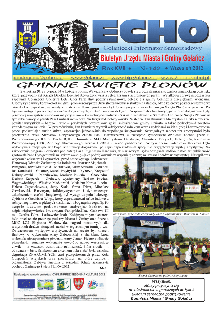 Go³aniecki Informator Samorz¹dowy Biuletyn Urzêdu Miasta i Gminy Go³añcz Rok XVII 142 Wrzesieñ 2012 [email protected] GMINNE ŒWIÊTO PLONÓW 2 wrzeœnia 2012 r. o godz. 14 w koœciele pw. œw. Wawrzyñca w Go³añczy odby³a siê uroczysta msza œw. dziêkczynna z okazji do¿ynek, której przewodniczy³ Ksi¹dz Dziekan Leonard Kowalczyk wraz z celebransami z zaproszonych parafii. Wyj¹tkow¹ oprawê nabo¿eñstwa zapewni³a Go³aniecka Orkiestra Dêta, Chór Parafialny, poczty sztandarowe, delegacje z gminy Go³añcz z przepiêknymi wieñcami. Uroczysty i barwny korowód od œwi¹tyni, prowadzony przez Orkiestrê zawiód³ uczestników na stadion, gdzie kolorowe postaci ze s³omy oraz okaza³y kombajn zbo¿owy wita³y uczestników. Hymn pañstwowy by³ donios³ym pocz¹tkiem Gminnego Œwiêta Plonów w plenerze. Po hymnie nast¹pi³a prezentacja wieñców do¿ynkowych, ich twórców oraz delegacji. Wspania³e dzie³a – tradycyjne wieñce do¿ynkowe, by³y przez ca³¹ uroczystoœæ eksponowane przy scenie – ku zachwycie widzów. Czas na przedstawienie Starostów Gminnego Œwiêta Plonów, w tym roku honory te pe³nili Pani Emilia Kuku³a oraz Pan Krzysztof Dobrzykowski. Nastêpnie Pan Burmistrz Mieczys³aw Durski serdecznie powita³ wszystkich – bardzo licznie – przyby³ych uczestników, goœci, mieszkañców gminy i miasta, a tak¿e podziêkowa³ pocztom sztandarowym za udzia³. W przemówieniu, Pan Burmistrz wyrazi³ wdziêcznoœæ rolnikom wraz z rodzinami za ich ciê¿k¹ i bardzo owocn¹ pracê, podkreœlaj¹c trudne ¿niwa, zapraszaj¹c jednoczeœnie do wspólnego œwiêtowania. Szczególnym momentem uroczystoœci by³o przekazanie przez Starostów Do¿ynkowego chleba Panu Burmistrzowi, a nastêpnie symboliczne dzielenie bochna przez P. Przewodniczacego RMiG Józefa Ry³ko, Burmistrza MiG Mieczys³awa Durskiego, Starostów Do¿ynek, Helenê Czêstochowsk¹ Przewodnicz¹c¹ GRK, Andrzeja Skotowskiego prezesa GZRKiOR wœród publicznoœci. W tym czasie Go³aniecka Orkiestra Dêta wykonywa³a tradycyjne wielkopolskie utwory do¿ynkowe, po czym zaprezentowa³a specjalnie przygotowany wystêp artystyczny. Na zakoñczenie programu, orkiestra pod batut¹ Pana Eugeniusza Hañczuka, w marszowym szyku po¿egna³a stadion, natomiast publicznoœæ zgotowa³a Panu Dyrygentowi i muzykom owacjê – jako podziêkowanie za wspania³¹ oprawê muzyczn¹ i bardzo udany wystêp. Nast¹pi³ czas wrêczania odznaczeñ i wyró¿nieñ, przed scenê wyst¹pili odznaczeni Honorow¹ Odznak¹ Zas³u¿ony dla Rolnictwa: Mariusz Majchrzak – Panigródz, Józef Skotowski – Morakowo, Adam Kruszka – Go³añcz, Jan Kamiñski – Go³añcz, Marek Przybylski – Rybowo, Krzysztof Dobrzykowski – Morakówko, Mariusz Kuku³a – Chaw³odno, Dariusz Kasperek - Grabowo, wyró¿niony Herbem Powiatu W¹growieckiego: Wies³aw Maækowski, Medalem Karola Libelta: Helena Czêstochowska, Jerzy Szala, firma Trivet, Miros³aw Gawkowski. Barwnym, folklorystycznym i dynamicznym zakoñczeniem czêœci obrzêdowej, by³ wystêp zespo³u ludowego Cybinka z Grodziska Wlkp., który zaprezentowa³ tañce ludowe z ró¿nych regionów, w piêknych kostiumach z bogat¹ choreografi¹. Po zespole ludowym podsumowano tradycyjny konkurs na najpiêkniejszy wieniec. I m. otrzyma³ Panigródz, II m. - Grabowo, III m. - Czerlin, IV m. - Laskownica Ma³a. Kolejnym mi³ym akcentem Burmistrz i przewodnicz¹cy rady wraz z wyró¿nionymi Medalem K. Libelta by³o przekazanie przez gospodarzy Miasta i Gminy oraz Prezesa MGZ LZS Eligiusza Wachowiaka nagród rzeczowych dla wszystkich dru¿yn bior¹cych udzia³ w tegorocznym turnieju wsi. Zwieñczeniem wystêpów artystycznych na scenie by³ koncert fina³owy w wykonaniu Anny ¯ebrowskiej z chórkiem, która wykona³a niezapomniane piosenki Anny Jantar. Piêkne stylizacje piosenkarki, staranne wykonanie utworów, nawet wzruszaj¹ce chwile – to wszystko oczarowa³o publicznoœæ, która prosi³a – i otrzyma³a – bisy. Smakowitym akcentem „dla cia³a” by³a wspólna degustacja ZNAKOMITYCH ciast przygotowanych przez Ko³a Gospodyñ Wiejskich oraz grochówki, na które zaprosili organizatorzy. Zabawa taneczna z zespo³em Kfiaty zakoñczy³a obchody Gminnego Œwiêta Plonów 2012. GOK Zespó³ Cybinka na go³anieckiej scenie Wszystkim, którzy przyczynili siê do uœwietnienia tegorocznych do¿ynek sk³adam serdeczne podziêkowanie. Burmistrz Miasta i Gminy Go³añcz Go³aniecki Informator Samorz¹dowy ECHO - wrzesieñ 2012 str. 2 OCHRONA ŒRODOWISKA OPONY Od 25 czerwca do 4 lipca br. trwa³a zbiórka opon przy wspó³pracy z firm¹ RECYKL GRUPA SA ze Œremu. Firma udostêpni³a gminie swoje kontenery, które zosta³y ustawione na placu firmy „AGAZ”, ul. Cisowa 29, w Go³añczy. Zainteresowanie zbiórk¹ by³o bardzo du¿e. Mieszkañcy bezp³atnie mogli oddawaæ ró¿nego rodzaju opony, jednak¿e z zastrze¿eniem, i¿ opony du¿e np. od maszyn rolniczych, nale¿a³o przeci¹æ do wysokoœci 80 cm. Planowano postawiæ tylko dwa kontenery, kaýdy o pojemnoúci 40 m³. Jednak kontenery te bardzo szybko zapeùniùy siæ oponami. W zwiàzku z powyýszym dostawiono kolejne 4 kontenery. Podsumowujàc odebrano ùàcznie okoùo 240 m³ zuýytych opon. Naleýy pamiætaã, ýe zuýyte opony sà odpadem, który bardzo obciàýa úrodowisko naturalne. Trwaùoúã opon jest najwiêksz¹ zalet¹ w czasie ich u¿ytkowania, ale po zakoñczeniu eksploatacji stwarza problemy w ich zagospodarowaniu, poniewa¿ opony nie ulegaj¹ rozk³adowi. Nie wolno ich sk³adowaæ na wysypiskach œmieci i nie nadaj¹ siê do spalania w przydomowych piecach. Najlepszym rozwi¹zaniem jest wiêc selektywna zbiórka opon, a nastêpnie recykling. Materia³ granulatu gumowego wykorzystywany jest m.in.: podczas budowy placów zabaw dla dzieci, boisk szkolnych czy te¿ sal gimnastycznych. ZU¯YTY SPRZÊT ELEKTRYCZNY I ELEKTRONICZNY Ju¿ po raz kolejny pracownicy ds. ochrony œrodowiska Urzêdu Miasta i Gminy Go³añcz p