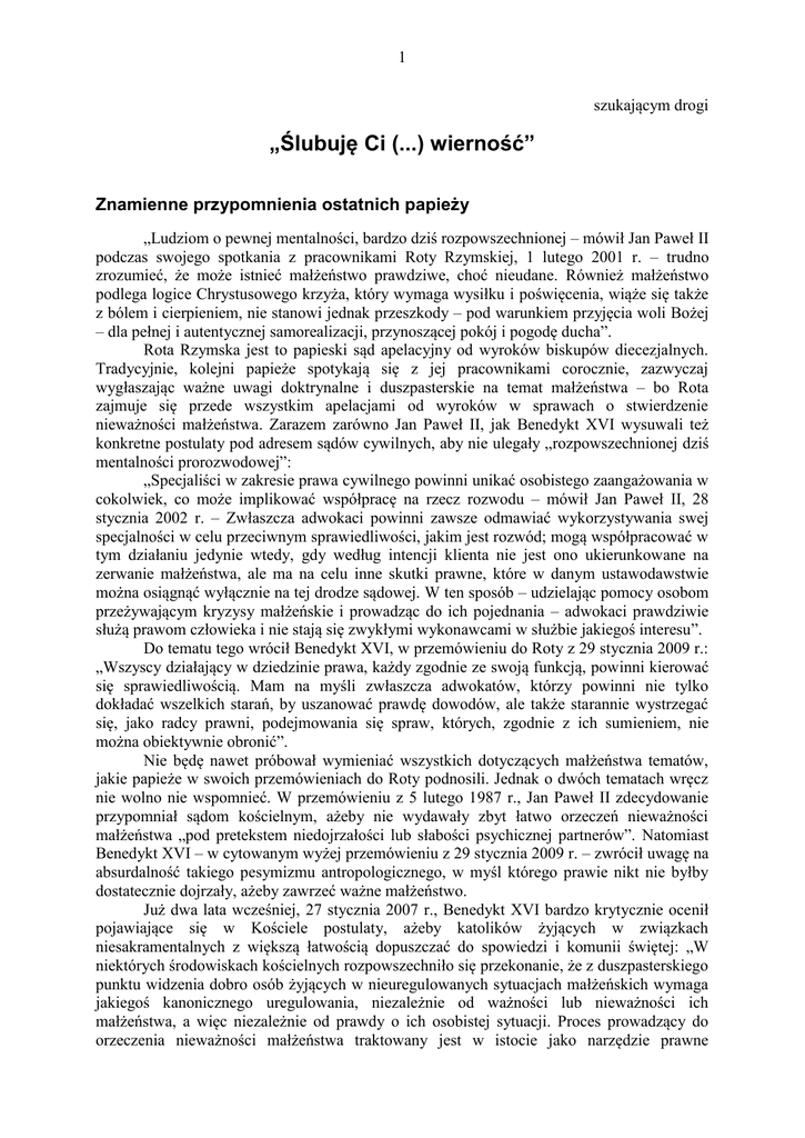 1 szukającym drogi „Ślubuję Ci (...) wierność” Znamienne przypomnienia ostatnich papieży „Ludziom o pewnej mentalności, bardzo dziś rozpowszechnionej – mówił Jan Paweł II podczas swojego spotkania z pracownikami Roty Rzymskiej, 1 lutego 2001 r. – trudno zrozumieć, że może istnieć małżeństwo prawdziwe, choć nieudane. Również małżeństwo podlega logice Chrystusowego krzyża, który wymaga wysiłku i poświęcenia, wiąże się także z bólem i cierpieniem, nie stanowi jednak przeszkody – pod warunkiem przyjęcia woli Bożej – dla pełnej i autentycznej samorealizacji, przynoszącej pokój i pogodę ducha”. Rota Rzymska jest to papieski sąd apelacyjny od wyroków biskupów diecezjalnych. Tradycyjnie, kolejni papieże spotykają się z jej pracownikami corocznie, zazwyczaj wygłaszając ważne uwagi doktrynalne i duszpasterskie na temat małżeństwa – bo Rota zajmuje się przede wszystkim apelacjami od wyroków w sprawach o stwierdzenie nieważności małżeństwa. Zarazem zarówno Jan Paweł II, jak Benedykt XVI wysuwali też konkretne postulaty pod adresem sądów cywilnych, aby nie ulegały „rozpowszechnionej dziś mentalności prorozwodowej”: „Specjaliści w zakresie prawa cywilnego powinni unikać osobistego zaangażowania w cokolwiek, co może implikować współpracę na rzecz rozwodu – mówił Jan Paweł II, 28 stycznia 2002 r. – Zwłaszcza adwokaci powinni zawsze odmawiać wykorzystywania swej specjalności w celu przeciwnym sprawiedliwości, jakim jest rozwód; mogą współpracować w tym działaniu jedynie wtedy, gdy według intencji klienta nie jest ono ukierunkowane na zerwanie małżeństwa, ale ma na celu inne skutki prawne, które w danym ustawodawstwie można osiągnąć wyłącznie na tej drodze sądowej. W ten sposób – udzielając pomocy osobom przeżywającym kryzysy małżeńskie i prowadząc do ich pojednania – adwokaci prawdziwie służą prawom człowieka i nie stają się zwykłymi wykonawcami w służbie jakiegoś interesu”. Do tematu tego wrócił Benedykt XVI, w przemówieniu do Roty z 29 stycznia 2009 r.: „Wszyscy działający w dziedzinie prawa, każdy zgodnie ze swoją funkcją, powinni kierować się sprawiedliwością. Mam na myśli zwłaszcza adwokatów, którzy powinni nie tylko dokładać wszelkich starań, by uszanować prawdę dowodów, ale także starannie wystrzegać się, jako radcy prawni, podejmowania się spraw, których, zgodnie z ich sumieniem, nie można obiektywnie obronić”. Nie będę nawet próbował wymieniać wszystkich dotyczących małżeństwa tematów, jakie papieże w swoich przemówieniach do Roty podnosili. Jednak o dwóch tematach wręcz nie wolno nie wspomnieć. W przemówieniu z 5 lutego 1987 r., Jan Paweł II zdecydowanie przypomniał sądom kościelnym, ażeby nie wydawały zbyt łatwo orzeczeń nieważności małżeństwa „pod pretekstem niedojrzałości lub słabości psychicznej partnerów”. Natomiast Benedykt XVI – w cytowanym wyżej przemówieniu z 29 stycznia 2009 r. – zwrócił uwagę na absurdalność takiego pesymizmu antropologicznego, w myśl którego prawie nikt nie byłby dostatecznie dojrzały, ażeby zawrzeć ważne małżeństwo. Już dwa lata wcześniej, 27 stycznia 2007 r., Benedykt XVI bardzo krytycznie ocenił pojawiające się w Kościele postulaty, ażeby katolików żyjących w związkach niesakramentalnych z większą łatwością dopuszczać do spowiedzi i komunii świętej: „W niektórych środowiskach kościelnych rozpowszechniło się przekonanie, że z duszpasterskiego punktu widzenia dobro osób żyjących w nieuregulowanych sytuacjach małżeńskich wymaga jakiegoś kanonicznego uregulowania, niezależnie od ważności lub nieważności ich małżeństwa, a więc niezależnie od prawdy o ich osobistej sytuacji. Proces prowadzący do orzeczenia nieważności małżeństwa traktowany jest w istocie jako narzędzie prawne 2 pozwalające osiągnąć ten właśnie cel, zgodnie z logiką, wedle której prawo staje się formalizacją subiektywnych roszczeń”. Do tego tematu papież Benedykt wrócił dwa lata później, w przemówieniu już cytowanym: „Należy wystrzegać się pseudoduszpasterskich rozwiązań, gdzie liczy się zaspokojenie subiektywnych żądań, by za wszelką cenę uzyskać orzeczenie nieważności, by między innymi móc przezwyciężyć przeszkody do korzystania z sakramentów pokuty i Eucharystii. Natomiast najwyższe dobro dopuszczenia na nowo do komunii eucharystycznej po pojednaniu sakramentalnym wymaga brania pod uwagę autentycznego dobra osób, nieodłącznie związanego z prawdą ich sytuacji kanonicznej. Byłoby fałszywym dobrem i poważnym uchybieniem sprawiedliwości i miłości otwarcie im mimo wszystko drogi do przyjmowania sakramentów, stwarzając niebezpieczeństwo, że będą żyli w obiektywnej sprzeczności z prawdą swej osobistej kondycji”. Wspólnota Trudnych Małżeństw Przypominanie nauki Bożej ma ogromny sens również wówczas, kiedy jest ona odrzucana, a głosiciela spotykają za to szyderstwa. Dość przeczytać wyjaśnienie, jakie usłyszał kiedyś prorok Ezechiel: „Posyłam cię do nich, abyś im powiedział: Tak mówi Pan Bóg. A oni czy będą słuchać, czy też zaprzestaną – są bowiem ludem opornym – przecież będą wiedzieli, że prorok jest wśród nich. (Ez 2,4-5). Zwolennikom „nowej” moralności – nie przejmującej się Bożymi przykazaniami w momentach, kiedy to trudne – bardzo przeszkadza to świadectwo, jakie Kościół, pod przewodnictwem papieża i biskupów, składa poprzez przypominanie, że tego, co Bóg złączył, człowiek niech nie rozdziela, oraz poprzez stanowczy sprzeciw wobec aborcji, eutanazji, sterylizacji czy zapłodnienia in vitro. Gdyby moralna nauka Kościoła była faktycznie tak beznadziejnie głupia, nieżyciowa, przestarzała, doktrynerska, itp., jak ją usiłują dezawuować jej przeciwnicy – ich gwałtowne krytyki i