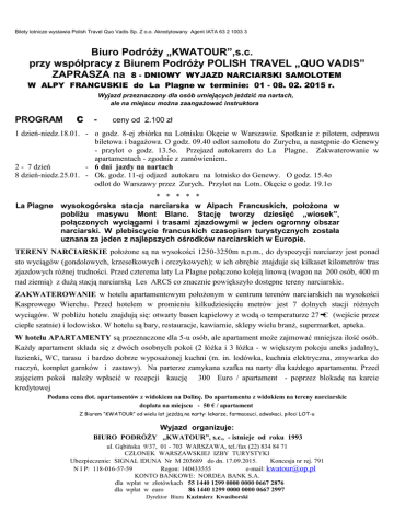 Bilety lotnicze wystawia Polish Travel Quo Vadis Sp. Z o.o. Akredytowany Agent IATA 63 2 1003 3 Biuro Podróży „KWATOUR”,s.c. przy współpracy z Biurem Podróży POLISH TRAVEL „QUO VADIS” ZAPRASZA na 8 - DNIOWY WYJAZD NARCIARSKI SAMOLOTEM W ALPY FRANCUSKIE do La Plagne w terminie: 01 - 08. 02. 2015 r. Wyjazd przeznaczony dla osób umiejących jeździć na nartach, ale na miejscu można zaangażować instruktora PROGRAM C - ceny od 2.100 zł 1 dzień-niedz.18.01. - o godz. 8-ej zbiórka na Lotnisku Okęcie w Warszawie. Spotkanie z pilotem, odprawa biletowa i bagażowa. O godz. 09.40 odlot samolotu do Zurychu, a następnie do Genewy - przylot o godz. 13.5o. Przejazd autokarem do La Plagne. Zakwaterowanie w apartamentach - zgodnie z zamówieniem. 2 - 7 dzień - 6 dni jazdy na nartach 8 dzień-niedz.25.01. - Ok. godz. 11-ej odjazd autokaru na lotnisko do Genewy. O godz. 15.4o odlot do Warszawy przez Zurych. Przylot na Lotn. Okęcie o godz. 19.1o * * * * * La Plagne wysokogórska stacja narciarska w Alpach Francuskich, położona w pobliżu masywu Mont Blanc. Stację tworzy dziesięć „wiosek”, połączonych wyciągami i trasami zjazdowymi w jeden ogromny obszar narciarski. W plebiscycie francuskich czasopism turystycznych została uznana za jeden z najlepszych ośrodków narciarskich w Europie. TERENY NARCIARSKIE położone są na wysokości 1250-3250m n.p.m., do dyspozycji narciarzy jest ponad sto wyciągów (gondolowych, krzesełkowych i orczykowych); w ich obrębie znajduje się kilkaset kilometrów tras zjazdowych różnej trudności. Przed czterema laty La Plagne połączono koleją linową (wagon na 200 osób, 400 m nad ziemią) z dużą stacją narciarską Les ARCS co znacznie powiększyło dostępne tereny narciarskie. ZAKWATEROWANIE w hotelu apartamentowym położonym w centrum terenów narciarskich na wysokości Kasprowego Wierchu. Przed hotelem w promieniu kilkudziesięciu metrów jest 7 dolnych stacji różnych wyciągów. W pobliżu hotelu znajdują się: otwarty basen kąpielowy z wodą o temperaturze 27C (wejście przez ciepłe szatnie) i lodowisko. W hotelu są bary, restauracje, kawiarnie, sklepy wielu branż, supermarket, apteka. W hotelu APARTAMENTY są przeznaczone dla 5-u osób, ale apartament może zajmować mniejsza ilość osób. Każdy apartament składa się z dwóch osobnych pokoi (2 łóżka i 3 łóżka - w większym pokoju aneks jadalny), łazienki, WC, tarasu i bardzo dobrze wyposażonej kuchni (m. in. lodówka, kuchnia elektryczna, zmywarka do naczyń, komplet garnków i zastawy). Na parterze zamykana szafka na narty dla każdego apartamentu. Przed zajęciem pokoi należy wpłacić w recepcji kaucję 300 Euro / apartament - poprzez blokadę na karcie kredytowej Podana cena dot. apartamentów z widokiem na Dolinę. Do apartamentu z widokiem na tereny narciarskie dopłata na miejscu - 50 € / apartament Z Biurem ”KWATOUR” od wielu lat jeżdżą na narty: lekarze, farmaceuci, adwokaci, piloci LOT-u Wyjazd organizuje: BIURO PODRÓŻY „KWATOUR”, s.c., - istnieje od roku 1993 ul. Gąbińska 9/37, 01 - 703 WARSZAWA, tel./fax (22) 834 84 71 CZŁONEK WARSZAWSKIEJ IZBY TURYSTYKI Ubezpieczenie: SIGNAL IDUNA Nr M 203689 do dn. 17.09.2015. Koncesja nr rej. 791 N I P: 118-016-57-59 Regon: 140433555 e-mail: [email protected] KONTO BANKOWE: NORDEA BANK S.A. dla wpłat w złotówkach 55 1440 1299 0000 0000 0667 2876 dla wpłat w euro 86 1440 1299 0000 0000 0667 2997 Dyrektor Biura Kazimierz Kwasiborski Bilety lotnicze wystawia Polish Travel Quo Vadis Sp. Z o.o. Akredytowany Agent IATA 63 2 1003 3 WARUNKI UCZESTNICTWA C (01 - 08. 02. 2015.) W cenie są wliczone: przeloty: Warszawa - Zurych - Genewa; Genewa - Zurych - Warszawa (Linia Lotnicza SWISS), opłaty lotniskowe, paliwowe i podatki, przewóz nart bez dodatk. opłat loty rejsowe - nie czartery ! przejazd autokarem: lotnisko - hotel - lotnisko, 7 noclegów w apartamencie, w tym również: pościel, światło, ciepła woda, ogrzewanie, należy zabrać ręczniki; w apartamencie jest telefon i TV-kablowa - wiele programów wstęp na odkryty basen kąpielowy z podgrzewaną wodą - konieczne zdjęcie taksa klimatyczna ubezpieczenie turystyczne (od następstw nieszcz. wypadków, kosztów leczenia i utraty bagażu) UBEZPIECZENIE NARCIARSKIE - SKI - obejmuje skutki wypadków na stoku i sprzęt, opieka pilota w czasie podróży i pobytu. CENA obejmuje wszystkie wyżej wymienione świadczenia i wynosi : 2.100 zł/os. - jeżeli apartament zajmowany jest przez 2.400 zł/os. - jeżeli apartament zajmowany jest przez 4 2.700 zł/os. - jeżeli apartament zajmowany jest przez 3 3.000 zł/os. - jeżeli apartament zajmowany jest przez 2 5 osób osoby osoby osoby Cena zawiera VAT ZACHOWANO CENĘ z ROKU 2014 inne Biura podniosły o 10% i więcej Cenę przygotowano w oparciu o kurs 1 € = 4,20 PLN może ulec zmianie w przypadku zmiany kursu walut o więcej niż 2% W cenie zawarte są wszystkie świadczenia i opłaty - oprócz wyżywienia i karnetu narciarskiego U W A G A : WIELE BIUR PODRÓŻY PODAJE NISKĄ CENĘ, ABY ZACHĘCIĆ TURYSTÓW. ALE PO CENIE JEST PODANE (zwykle drobnym drukiem) JAKIE JESZCZE OPŁATY POZA CENĄ NALEŻY PONIEŚĆ. Biuro uzyskało niewielką zniżkę grupową przy zbiorowym zakupie karnetu 6-dniowego (poniżej 10%) i tak: dorośli 14 - 64 lat : 235 € za 6 dni; dzieci 6 - 13 lat i dorośli 65 - 71 lat 185 € za 6 dni; dzieci do lat 6 i dorośli powyżej 72 lat otrzymują karnety bezpłatnie - konieczne zdjęcie NA ZAKUP KARNETU - Pilot zbierze pieniądze po przyjeździe do Francji i wyda karnety w Recepcji w dniu 19.01.15. o godz. 9-ej . Aby grupowo wykupić karnety Biuro musi wpłacić zadatek i stąd konieczność wpisania na blankiecie zgłoszenia prośby o wykupienie karnetu. Konieczny ważny paszport lub dowód osobisty ! Dopuszczalny bagaż: 20 kg + 5 kg ręcznego + narty lub deska (bez dopłaty) Wyżywienie we własnym zakresie - łatwe do przygotowania w dobrze wyposażonej kuchni, lub 