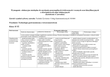 Wymagania edukacyjne niezbędne do uzyskania poszczególnych śródrocznych i rocznych ocen klasyfikacyjnych z obowiązkowych zajęć edukacyjnych (kształcenie w zawodzie) Zawód i symbol cyfrowy zawodu: Technik Żywienia i Usług Gastronomicznych 343404 Przedmiot: Technologia gastronomiczna z towaroznawstwem Klasa: II TŻ Dział nauczania Konieczny dopuszczający Charakterystyka towaroznawcza i przechowywanie żywności podstawowy dostateczny Wymagania edukacyjne Rozszerzający dobry Dopełniający Wykraczający celujący bardzo dobry wyższy poziom wymagań obejmuje zagadnienia z poziomu niższego. Poziom wykraczający to dodatkowo umiejętność korzystania z różnych źródeł, poszerzania swoich wiadomości i umiejętności – wymienia cechy żywności – ocenia żywność biorąc pod – potrafi powiedzieć jakie – potrafi wskazać żywność wysokiej jakości oraz mające wpływ na jakość. uwagę kryteria: cechy żywności świadczą o zaproponować metody jej przygotowania. – potrafi – potrafi pogrupować środki funkcjonalności, ceny, jaj dobrej/złej jakości. również zwrócić uwagę na zagrożenia obniżające zgodności z potrzebami, żywności. – wymienia przykładowe jakość żywności. – potrafi pogrupować bezpieczeństwa zdrowotnego, – potrafi sklasyfikować środki żywności oraz środki żywności poszczególnych środków braku zanieczyszczeń – wymienia środki wykorzystać je w gastronomii. fizycznych, zgodności ze żywności. żywności. – potrafi uzasadnić podział środków żywności – potrafi rozróżnić sposoby standardem jakości; – wymienia sposoby – potrafi wskazać zastosowanie poszczególnych – klasyfikuje poszczególne zabezpieczenia żywności. zabezpieczenia żywności. środków środki żywności. - wymienia zmiany w - potrafi scharakteryzować – dobiera bezbłędnie odpowiednie sposoby żywności. zmiany zachodzące w – charakteryzuje zabezpieczenia żywności. żywności i podać ich towaroznawczo poszczególne – wymienia sposoby – analizuje powody zanieczyszczeń ich skutki dla środki żywności. przechowywania żywności. przyczyny. zdrowia, oraz potrafi znaleźć środki zaradcze. – wskazuje i charakteryzuje – charakteryzuje metody wymienia przykłady – charakteryzuje sposoby zabezpieczenia żywności przechowywania żywności. sposoby zabezpieczenia utrwalania żywności. przed zepsuciem – wymienia wszystkie znane żywności. – przechowywanie żywności; – charakteryzuje skutki w gastronomii metody – charakteryzuje zmiany zachodzące w żywności utrwalania żywności. zdrowotne zanieczyszczenia podczas jej przechowywania żywności. – wskazuje zanieczyszczenia żywności – potrafi wskazać – skutki zdrowotne. zastosowanie metod przechowywania żywności do odpowiedniego asortymentu. – charakteryzuje metody utrwalania żywności. – dokonuje charakterystyki metod utrwalania żywności. – dostrzega wady i zalety metod. – charakteryzuje etapy procesów utrwalania żywności. Proces produkcyjny w zakładzie gastronomicznym – potrafi powiedzieć swoimi słowami jak rozumie pojęcie receptury gastronomicznej. – wymienia elementy produkcji gastronomicznej. – wymienia metody i techniki stosowane w produkcji gastronomicznej. – wymienia surowce w gastronomii. – wymienia elementy procesu produkcyjnego, które można monitorować – podaje właściwa definicję receptury gastronomicznej. – wymienia etapy procesu produkcyjnego. – rozróżnia metody i techniki stosowane w produkcji gastronomicznej. – ocenia przykłady surowca ze względu na możliwość jego zastosowania w produkcji gastronomicznej. – zna elementy procesu produkcyjnego, które należy monitorować – przedstawia znaczenie receptury gastronomicznej jako dokumentu produkcyjnego i rozliczeniowego. – charakteryzuje etapy produkcji gastronomicznej. – charakteryzuje metody i techniki stosowane w produkcji gastronomicznej. – potrafi dobrać surowce do sporządzenia wybranych potraw. – analizuje procedury dotyczące monitorowania CCP w zakładach gastronomicznych. – przedstawia ze zrozumieniem konieczność posługiwania się recepturami gastronomicznymi w procesie produkcyjnym – doskonale charakteryzuje etapy, ich rolę dla procesu produkcyjnego. – charakteryzuje metody i techniki sporządzania potraw lub napojów; – potrafi zastosować metody i techniki stosowane w produkcji gastronomicznej – potrafi dobrać surowce do sporządzenia określonej/wskazanej potrawy lub napoju; – analizuje procedury dotyczące monitorowania CCP w zakładach gastronomicznych; – potrafi zastosować procedury do danego procesu produkcyjnego Technologia sporządzania potraw i napojów z różnych surowców i półproduktów oraz ich ekspedycja – wymienia podstawowe pojęcia związane z tematyka technologii potraw i napojów – dobiera techniki sporządzania potraw i napojów – potrafi sporządzać niektóre potrawy i napoje – charakteryzuje zmiany jakie mogą zachodzić w żywności podczas poszczególnych procesów obróbki technologicznej. – potrafi sporządzać potrawy i napoje – dobiera racjonalne metody produkcyjne – określa temperaturę podawania różnych potraw i napojów – sporządza potrawy przy użyciu właściwych metod. – potrafi zastosować urządzenia zakładu gastronomicznego. – planuje gastronomiczne urządzenia produkcyjne do wykonania określonych zadań. – określa charakterystyczne cechy organoleptyczne podstawowego asortymentu potraw i napojów. -określa temperaturę podawania różnych potraw i napojów