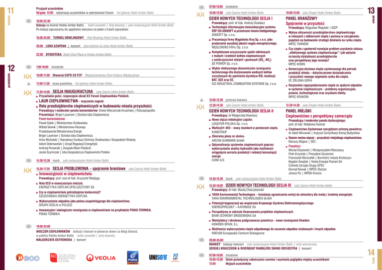 18.00-24.00 TURNIEJ BOWLINGOWY Pub-Bowling Hotel Amber Baltic 20.00 LORA SZAFRAN | koncert Sala Kalman & Lehar Hotel Amber Baltic 22.00 DYSKOTEKA Night Club Plaza w Hotelu Amber Baltic poniedziałek 12 7.00-10.00 śniadanie 10.00-11.00 Otwarcie EXPO XX FCP Międzynarodowy Dom Kultury Międzyzdroje 11.00-11.30 kawa powitalna hol główny Hotel Amber Baltic 11.30-14.00 SESJA INAUGURACYJNA sala Casino Hotel Amber Baltic Przywitanie gości, rozpoczęcie obrad XX Forum Ciepłowników Polskich. LAUR CIEPŁOWNICTWA – wręczenie nagród. Rola przedsiębiorstw ciepłowniczych w budowaniu miasta przyszłości. Prowadzący i moderator panelu komentatorów: Aneta Wieczerzak-Krusińska | Rzeczpospolita Prezentacja: Birger Lauersen | Duńska Izba Ciepłownicza Panel komentatorów: Paweł Sałek | Ministerstwo Środowiska Witold Słowik | Ministerstwo Rozwoju Przedstawiciel Ministerstwa Energii Birger Lauersen | Duńska Izba Ciepłownicza Artur Michalski | Narodowy Fundusz Ochrony Środowiska i Gospodarki Wodnej Adam Dobrowolski | Urząd Regulacji Energetyki Andrzej Porawski | Związek Miast Polskich Jacek Szymczak | Izba Gospodarcza Ciepłownicto Polskie 14.30-15.30 lunch sale restauracyjne Hotel Amber Baltic SESJA PROBLEMOWA – spojrzenie branżowe Innowacyjność w ciepłownictwie. 15.30-17.30 10.00-12.00 sala Casino Hotel Amber Baltic 10.00-12.00 sala Chopin Hotel Amber Baltic DZIEŃ NOWYCH TECHNOLOGII SESJA I PANEL BRANŻOWY Spojrzenie w przyszłość Prowadzący: prof. dr hab. Andrzej Osiadacz Technologie informacyjno-komunikacyjne systemu ERP ZSI UNISOFT w przestrzeni miasta inteligentnego. UNISOFT Sp. z o.o. Prezentacja firmy Węglokoks Kraj Sp. z o.o. jako producenta wysokiej jakości węgla energetycznego. WĘGLOKOKS KRAJ Sp. z o.o. Kompleksowe oczyszczanie spalin odlotowych z małych i średnich kotłów ciepłowniczych z zanieczyszczeń stałych i gazowych (SOx, NOx). GE POWER Sp. z o.o. Wybór efektywnego ekonomicznie rozwiązania technicznego dla dostosowania wodnych kotłów szczytowych do spełnienia dyrektyw IED, konkluzji BAT, OZE oraz EE. ICS INDUSTRIAL COMBUSTION SYSTEMS Sp. z o.o. 12.00-12.30 przerwa kawowa 12.30-14.30 sala Chopin Hotel Amber Baltic DZIEŃ NOWYCH TECHNOLOGII SESJA II PANEL MIEJSKI Ciepłownictwo z perspektywy samorządu sala Casino Hotel Amber Baltic Prowadzący: prof. nzw dr hab. Krzysztof Wojdyga Rola ECO w nowoczesnym mieście. ENERGETYKA CIEPLNA OPOLSZCZYZNY SA Czy w ciepłownictwie potrzebujemy konkurencji? SZCZECIŃSKA ENERGETYKA CIEPLNA Wykorzystanie odpadów jako paliwa uzupełniającego dla ciepłownictwa. GRUPA VEOLIA w POLSCE Innowacyjne i ekologiczne rozwiązania w ciepłownictwie na przykładzie PGNiG TERMIKA. PGNiG TERMIKA 19.00-24.00 WIECZÓR CIEPŁOWNIKÓW kolacja i koncert w plenerze skwer za Aleją Gwiazd, w pobliżu Hotelu Amber Baltic bufet szwedzki | strój dowolny MAŁGORZATA OSTROWSKA | koncert Prowadzący: Bogusław Regulski | IGCP Wpływ aktywności przedsiębiorstwa ciepłowniczego w relacjach z odbiorcami ciepła i pomocy w zarządzaniu popytem na budowanie strategii działania na rynku ciepła. MPEC TARNÓW Czy ciepło z geotermii rozwiąże problem uzyskania statusu „efektywnego systemu ciepłowniczego” i jak wpłynie na koszty działalności przedsiębiorstw oraz perspektywy jego rozwoju? MPEC KONIN Komercyjna dostawa ciepła systemowego dla potrzeb produkcji chłodu – dotychczasowe doświadczenia i przyszłość nowego segmentu rynku dla ciepła. EC ZIELONA GÓRA Racjonalne zagospodarowanie ciepła ze spalarni odpadów w systemie ciepłowniczym – problemy organizacyjne, prawne, technologiczne oraz uzyskane efekty. MPEC KRAKÓW 12.30-14.30 sala Casino Hotel Amber Baltic Prowadzący: dr Małgorzata Kwestarz Nowe złącza indukcyjne Logstor. LOGSTOR POLSKA Sp. z o.o. Multical® 403 – nowy standard w pomiarach ciepła. KAMSTRUP Zbieramy plony ze słońca. ARCON-SUNMARK GmbH Optymalizacja systemów ciepłowniczych poprzez wykorzystanie analizy hydrauliki jako możliwości osiągnięcia wzrostu produkcji i redukcji konsumpcji energii. COWI A/S 13 wtorek 18.00-22.30 Kolacja na terenie Hotelu Amber Baltic. bufet szwedzki | strój dowolny | sale restauracyjne Hotel Amber Baltic Po kolacji zapraszamy do spêdzenia wieczoru na jeden z trzech sposobów: 07.00-10.00 śniadanie Prowadzący i moderator panelu dyskusyjnego: prof. dr hab. Waldemar Kamrat Ciepłownictwo Systemowe narzędziem ochrony powietrza. dr Adolf Mirowski | Instytut Certyfikacji Emisji Budynków Razem można więcej – przyszłość miejskiego ciepłownictwa. Mariusz Majkut | SEC Paneliści: Michał Olszewski | Wiceprezydent Warszawy Piotr Krzystek | Prezydent Szczecina Franciszek Marszałek | Burmistrz miasta Krotoszyn Bogdan Świątek | Veolia Energia Poznań SA Członek Zarządu Grupy GPEC Konrad Nowak | MPEC Olsztyn Janusz Fic | MPGK Krosno 14.30-15.30 lunch sale restauracyjne Hotel Amber Baltic 15.30-18.00 DZIEŃ NOWYCH TECHNOLOGII SESJA III sala Casino Hotel Amber Baltic Prowadzący: dr hab. Maciej Chaczykowski YARA Environmental Technologies – Instalacje ograniczenia emisji do atmosfery dla małej i średniej energetyki. YARA ENVIRONMENTAL TECHNOLOGIES GmbH Potencjał kogeneracji we wspieraniu Krajowego Systemu Elektroenergetycznego. ENERGOPROJEKT – KATOWICE SA Perspektywy w zakresie finansowania projektów ciepłowniczych. BANK OCHRONY ŚRODOWISKA SA Wentylatory i obrotowe podgrzewacze powietrza – nowe rozwiązania Howden. HOWDEN SPAIN, S.L. Możliwości wykorzystania ciepła odpadowego do suszenia odpadów ściekowych i innych odpadów. KREVOX Europejskie Centrum Ekologiczne 20.00-24.00 BANKIET kolacja i koncert sale restauracyjne Hotel Amber Baltic | strój wieczorowy SERGIEJ KRIUCZKOW & RIVERBOAT RAMBLERS SWING ORCHESTRA | koncert 07.00-10.00 śniadanie 10.00-12.00 Dzień poświęcony zakończeniu rozmów i wymianie poglądów między uczestnikami 12.00-12.00 Wyjazd uczestników 14 środa niedziela 11 Przyjazd uczestników Od godz. 15.00 rejestracja