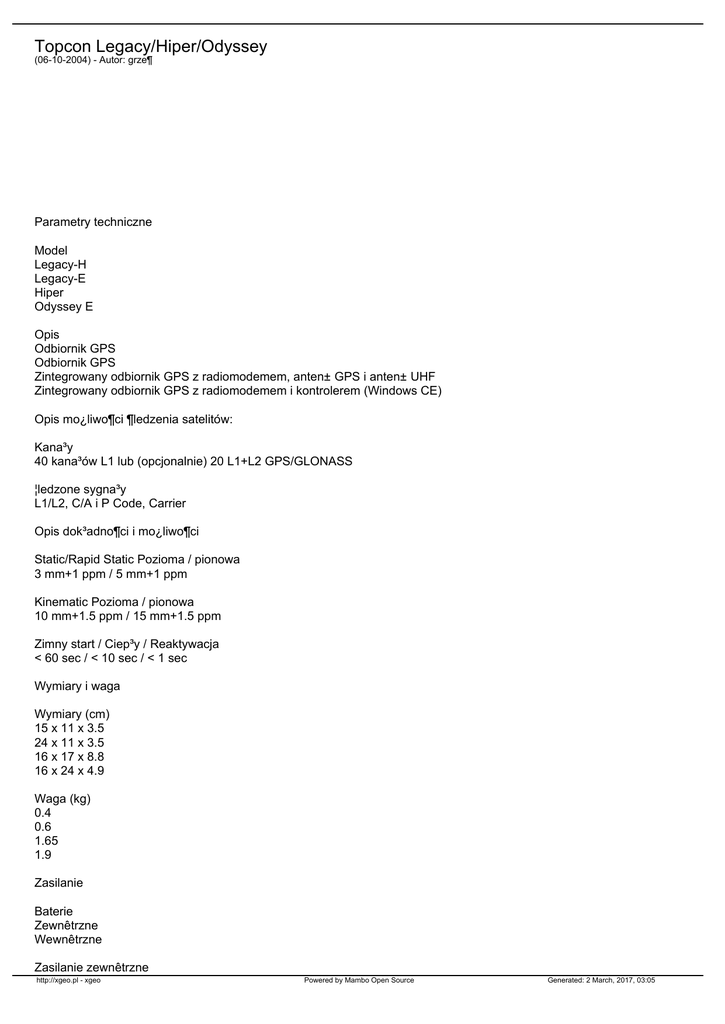 Topcon Legacy/Hiper/Odyssey (06-10-2004) - Autor: grze¶ Parametry techniczne Model Legacy-H Legacy-E Hiper Odyssey E Opis Odbiornik GPS Odbiornik GPS Zintegrowany odbiornik GPS z radiomodemem, anten± GPS i anten± UHF Zintegrowany odbiornik GPS z radiomodemem i kontrolerem (Windows CE) Opis mo¿liwo¶ci ¶ledzenia satelitów: Kana³y 40 kana³ów L1 lub (opcjonalnie) 20 L1+L2 GPS/GLONASS ¦ledzone sygna³y L1/L2, C/A i P Code, Carrier Opis dok³adno¶ci i mo¿liwo¶ci Static/Rapid Static Pozioma / pionowa 3 mm+1 ppm / 5 mm+1 ppm Kinematic Pozioma / pionowa 10 mm+1.5 ppm / 15 mm+1.5 ppm Zimny start / Ciep³y / Reaktywacja < 60 sec / < 10 sec / < 1 sec Wymiary i waga Wymiary (cm) 15 x 11 x 3.5 24 x 11 x 3.5 16 x 17 x 8.8 16 x 24 x 4.9 Waga (kg) 0.4 0.6 1.65 1.9 Zasilanie Baterie Zewnêtrzne Wewnêtrzne Zasilanie zewnêtrzne http://xgeo.pl - xgeo Powered by Mambo Open Source Generated: 2 March, 2017, 03:05 6 do 28 Volt pr±du sta³ego Zu¿ycie energii (W) 1.8-2.4 3.3 3.0 4.3 Warunki pracy Obudowa Odporna na warunki atmosferyczne Odporna na warunki atmosferyczne, aluminium Temperatura pracy -40°C do + 55°C Opis anteny GPS Antena GPS Zewnêtrzna Wewnêtrzna Zewnêtrzna Opis radiomodemów Radiomodem Zewnêtrzna Wewnêtrzna Moc (W) 0.5-10 Wej¶cia/Wyj¶cia (I/O) Porty komunikacyjne 2 szeregowe (RS232) 4 szeregowe (RS232) Inne sygna³y I/O 1pps, event marker, wej¶cie i wyj¶cie czêstotliwo¶ci dodatkowej Wska¼nik stanu dwie 3-kolorowe diody i dwa klawisze (MINTER) Rejestracja danych Pamiêæ wewnêtrzna do 96 Mb RTK Pamiêæ kontrolera 16-32 MB, karty PCMCIA, CF Rejestracja Do 20 razy na sekundê Wyj¶cie danych Format danych czasu rzeczywistego RTCM 104 wersja 2.2, komunikaty 1,2,3,6,9,16 Wyj¶cie tekstowe Zgodne z NMEA 0183 wersja 2.2/2.3 Dodatkowe wyj¶cia http://xgeo.pl - xgeo Powered by Mambo Open Source Generated: 2 March, 2017, 03:05 Format TPS Czêstotliwo¶æ od¶wie¿ania danych wyj¶ciowych Do 20 razy na sekundê Technologie Multipath Rejection Redukcja wielodro¿no¶ci: Strobed Sequence Sampler In-band interference rejection Ograniczenie interferencji wewn±trzkana³owej do 60 dB RTK Rozwi±zania do 20 razy na sekundê http://xgeo.pl - xgeo Powered by Mambo Open Source Generated: 2 March, 2017, 03:05