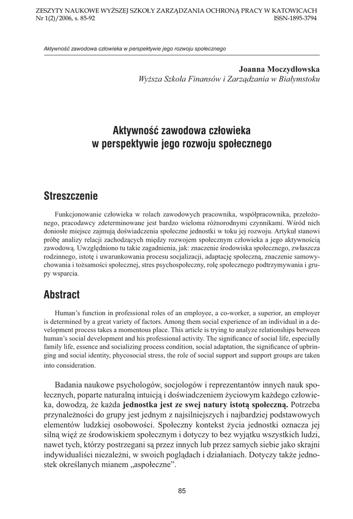 ZESZYTY NAUKOWE WYŻSZEJ SZKOŁY ZARZĄDZANIA OCHRONĄ PRACY W KATOWICACH Nr 1(2)/2006, s. 85-92 ISSN-1895-3794 Aktywność zawodowa człowieka w perspektywie jego rozwoju społecznego Joanna Moczydłowska Wyższa Szkoła Finansów i Zarządzania w Białymstoku Aktywność zawodowa człowieka w perspektywie jego rozwoju społecznego Streszczenie Funkcjonowanie człowieka w rolach zawodowych pracownika, współpracownika, przełożonego, pracodawcy zdeterminowane jest bardzo wieloma różnorodnymi czynnikami. Wśród nich doniosłe miejsce zajmują doświadczenia społeczne jednostki w toku jej rozwoju. Artykuł stanowi próbę analizy relacji zachodzących między rozwojem społecznym człowieka a jego aktywnością zawodową. Uwzględniono tu takie zagadnienia, jak: znaczenie środowiska społecznego, zwłaszcza rodzinnego, istotę i uwarunkowania procesu socjalizacji, adaptację społeczną, znaczenie samowychowania i tożsamości społecznej, stres psychospołeczny, rolę społecznego podtrzymywania i grupy wsparcia. Abstract Human’s function in professional roles of an employee, a co-worker, a superior, an employer is determined by a great variety of factors. Among them social experience of an individual in a development process takes a momentous place. This article is trying to analyze relationships between human’s social development and his professional activity. The significance of social life, especially family life, essence and socializing process condition, social adaptation, the significance of upbringing and social identity, phycosocial stress, the role of social support and support groups are taken into consideration. Badania naukowe psychologów, socjologów i reprezentantów innych nauk społecznych, poparte naturalną intuicją i doświadczeniem życiowym każdego człowieka, dowodzą, że każda jednostka jest ze swej natury istotą społeczną. Potrzeba przynależności do grupy jest jednym z najsilniejszych i najbardziej podstawowych elementów ludzkiej osobowości. Społeczny kontekst życia jednostki oznacza jej silną więź ze środowiskiem społecznym i dotyczy to bez wyjątku wszystkich ludzi, nawet tych, którzy postrzegani są przez innych lub przez samych siebie jako skrajni indywidualiści niezależni, w swoich poglądach i działaniach. Dotyczy także jednostek określanych mianem „aspołeczne”. 85 Joanna Moczydłowska Aktualne funkcjonowanie człowieka w rolach zawodowych ─ pracownika, współpracownika, przełożonego, pracodawcy ─ uwarunkowane jest bardzo wieloma różnorodnymi czynnikami. Wśród nich doniosłe miejsce zajmuje doświadczenie społeczne jednostki nabywane w toku jej rozwoju. Zatem, aby poznać społeczne uwarunkowania aktywności zawodowej, nie można poprzestać na analizie tego, co ma miejsce „tu i teraz”, ale trzeba odwołać się do całego procesu rozwoju człowieka – od momentu jego narodzin, a nawet, jak podkreślają psychologowie prenatalni, od momentu poczęcia. Dopiero całościowe spojrzenie na społeczny kontekst rozwoju jednostki pozwala na pełne zrozumienie jej aktualnego funkcjonowania społecznego, w tym zawodowego. Mianem środowiska określa się względnie trwały układ elementów otoczenia człowieka, ważnych dla jego życia i zachowania się [1]. Inna definicja ujmuje środowisko szerzej: jako całokształt warunków materialnych i biologicznych istotnych dla życia i rozwoju osobników danego gatunku [2]. Z uwagi na analizowane tu zagadnienia skoncentrujmy się na pojęciu środowiska społecznego. Przyjmujemy ─ za S. Niecińskim ─ że środowisko społeczne to „ludzie, ich zachowania i wytwory, które stanowią zespół czynników wywierających wpływ na rozwój oraz zachowanie jednostki” [3]. Najważniejsze, najsilniej oddziałujące na człowieka elementy środowiska społecznego to grupy i instytucje społeczne, systemy polityczne, ekonomiczne, prawne, religijne oraz inne. Termin „środowisko społeczne” bywa używany zamiennie z terminem „środowisko społeczno-kulturowe”. Pierwszy z nich kładzie większy akcent na stosunki międzyludzkie, drugi na wytwory środowiska społecznego, np. normy, wartości, język. Przez pierwszych kilkanaście lat swojego życia (a bywa, że dłużej) jednostka pozostaje w pełnej zależności od swojego otoczenia. Bez rodziców lub ludzi, którzy ich zastępują, nie jest w stanie zaspokoić swoich potrzeb biologicznych i potrzeb psychicznych warunkujących prawidłowy rozwój osobowości (potrzeb tych jest bardzo wiele, ale najważniejsze to potrzeba bezpieczeństwa, miłości, bezwarunkowej akceptacji, uznania) [4]. Wraz z rozwojem jednostki sfera jej kontaktów społecznych systematycznie się rozszerza: jednostka wychodzi poza obszar rodziny, nawiązuje kontakty z grupą rówieśniczą, wchodzi w relacje z nauczycielami, współpracownikami, członkami lokalnej, regionalnej, a nawet narodowej społeczności. Z otoczenia społecznego czerpie wzorce zachowań w różnych życiowych sytuacjach, czerpie wiedzę o otaczającej rzeczywistości, poznaje normy moralne pozwalające na kształtowanie się indywidualnej hierarchii wartości, dziedziczy wypracowane przez pokolenia wartości kulturowe. Poznaje również zasady regulujące życie społeczne. Cały ten skomplikowany i długotrwały proces określany jest mianem socjalizacji. Właśnie w tym procesie przejmowana wartości, norm, wzorców zachowań najsilniej zaznacza się społeczny kontekst rozwoju jednostki. Rozwój to przecież z jednej strony aktualizowanie siebie, ujawnianie wrodzonych możliwości, ale także uczenie się, ciągłe poszerzanie zakresu wiedzy i umiejętności, które pozwalają lepiej poznać i zrozumieć otaczający świat oraz zachodzące w nim sytuacje. Niektórzy bada86 Aktywność zawodowa człowieka w perspektywie jego rozwoju społecznego cze życia społecznego wręcz utożsamiają pojęcia „socjalizacja” i „rozwój” [5]. W toku socjalizacji rozwija