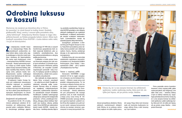 Laureaci konkursu „Biznes. dobry wybór” kastor – Ireneusz Krawczyk Odrobina luksusu w koszuli Wystarczy się rozejrzeć po dowolnej ulicy w Polsce, by zauważyć, że rynek koszul to trudny temat. Dookoła podkoszulki, bluzy, swetry i czasem tylko przemknie ulicą „biały kołnierzyk”. Statystyczny Niemiec kupuje w ciągu roku półtorej koszuli, na Polaka przypada ledwie ćwierć. Mimo tych trudnych warunków firma KASTOR z Łasku dobrze sobie radzi, i to już od dziesięcioleci. Z e statystycznej ćwiartki koszuli na statystycznego Polaka dla prawdziwych producentów zostaje ledwie rękaw, resztę rynku zajęły produkujące w Azji silne marki światowe i dostawcy do hipermarketów. Nie mamy szans konkurować z nimi – mówi prezes firmy KASTOR, Ireneusz Krawczyk. – Koszty wytworzenia wyrobu w kraju są o wiele wyższe. Trudno opłacić koszty tworzenia kolekcji, zdobycia wysokiej klasy tkaniny w atrakcyjnej cenie, pokrycia kosztu konudźwignąć fekcjonowania wyrobu i jeszcze koszt dystrybucji do dość rozproszonego odbiorcy. W większości krajów Europy koszula jest codziennym towarzyszem milionów mężczyzn ze wszystkich warstw społecznych. Tymczasem w Polsce nosi się je nie tak powszechnie. Na co dzień, poza określonymi instytucjami, korporacjami, na ulicach dominuje ubiór bardziej swobodny. Znajomość od podszewki Na przełomie lat 60. i 70. w Łasku, mieście położonym zaledwie 30 kilometrów od włókienniczej Łodzi, powstał jeden z zakładów Wólczanki, ówczesnego polskiego giganta odzieżowego. W 1990 roku w czasach transformacji gospodarczej łaski zakład rozpoczął działalność, jako samodzielne przedsiębiorstwo, dwa lata później przekształcone w akcyjną spółkę pracowniczą. Z zakładem w Łasku prezes Ireneusz Krawczyk związany jest całe swoje życie zawodowe. Co prawda na początku pracował w Telimenie, później w Próchniku, ale wszystkie szczeble organizacyjne przeszedł tutaj w Łasku. To najlepszy sposób na zdobycie doświadczenia, a dzięki temu poznania zakładu od podszewki. Gdy nadarzyła się okazja poprowadzenia firmy w nowych warunkach – nie wahał się ani chwili. Początki nieprzezależności oznaczały walkę o trwanie. Pierwszy okres, to utrzymanie współpracy z dotychczasowymi partnerami, a jednocześnie dynamiczne poszukiwanie nowych kontaktów handlowych. Z zakładu wykonującego usługi szycia, sukcesywnie następowała przemiana w firmę produkcyjno-handlową, oferującą własne kolekcje. Nadszedł czas budowy własnej, polskiej marki. Firma KASTOR jest właścicielem dwóch marek: KASTOR – koszule męskie, Senso – konfekcja damska. Były to i są produkty wysokiej klasy. Swoje wyroby KASTOR sprzedaje w sieci sklepów własnych znajdujących się w galeriach handlowych, w sklepach partnerskich, jak również w sklepach wielomarkowych. Z powodzeniem rozwija się sprzedaż poprzez sklep internetowy. Szczególnym produktem w ofercie firmy jest Program Koszuli na miarę. Tutaj klient prowadzony przez doradcę tworzy produkt sam: dokonuje wyboru fasonu, tkaniny, podejmuje decyzję co do sygnowania produktu monogramem. Produkty firmy, jak i ona sama były wielokrotnie nagradzane zaszczytnymi tytułami, m.in. dwukrotnie Godłem Promocyjnym „Teraz Polska”, i dwunastokrotnie (2000 – 2011) tytułem „Przedsiębiorstwo Fair Play”. Towar z wyższej półki Sterowanie KASTOREM w ciągu ostatnich 20 lat to ciągłe zarządzanie w kryzysie, czy też kolejnych kryzysach. – Efektem naszej pracy jest produkt niskoprzetworzony. Tu nie ma mowy o zbijaniu fortuny, jest ciągła walka o przetrwanie i utrzymanie firmy – podkreśla prezes Ireneusz Krawczyk. – Branża odzieżowa nie jest priorytetowa dla naszego państwa. Łask, to małe miasteczko, a miejsc pracy coraz mniej. W KASTORZE pracowały i pracują rodziny, jest ogromna lojalność pokoleń wobec firmy. Bez względu na to, jak trudny jest rynek i sytuacja konsumenta chcemy się rozwijać, zmieniać, wpasowywać w nową rzeczywistość i bu- Cieszę się, że i u nas zaczyna tworzyć się solidarność społeczna. Ludzie wybierają markę, która jest ich: nie tylko jest lepsza, ale po prostu swoja, lokalna. Ireneusz Krawczyk dować perspektywy działania. Mamy zdolnych, wartościowych młodych ludzi. Wiemy, że na rynkowy sukces firmy wpływa nie tylko ciężka praca, ale i pasja. Pasja, która nam towarzyszyła od momentu budowania nowego oblicza firmy, a dziś towarzyszy i tym ludziom. Firma pozostała wierna koszulom: towarowi z nieco wyższej półki, gdzie ważna jest jakość, styl i elegancja, a nie tylko niska cena. – Jesteśmy dobrzy w tym co robimy i staramy się zaspakajać potrzeby konsumenta. Cieszę się, że i u nas zaczyna tworzyć się solidarność społeczna. Ludzie wybierają markę, która jest ich: nie tylko jest lepsza, ale po prostu swoja, lokalna – mówi prezes Krawczyk. www.kastor.pl
