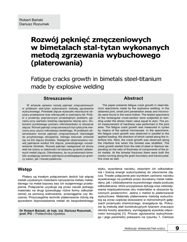 Robert Bański Dariusz Rozumek Rozwój pęknięć zmęczeniowych w bimetalach stal-tytan wykonanych metodą zgrzewania wybuchowego (platerowania) Fatigue cracks growth in bimetals steel-titanium made by explosive welding Streszczenie abstract W artykule opisano rozwój pęknięć zmęczeniowych w próbkach stal-tytan wykonanych metodą zgrzewania wybuchowego. Powstałe złącze wykazało nieznaczne obszary przetopione oraz mikropustki w zawinięciu fal. Próbki o przekroju poprzecznym prostokątnym poddano zginaniu przy wartości średniej naprężenia równej zeru. Dokonano punktowego pomiaru mikrotwardości w obszarze złącza. Wzrost pęknięć zmęczeniowych był cyklicznie mierzony przy użyciu mikroskopu świetlnego. W próbkach obserwowano wzrost pęknięć zmęczeniowych równolegle do przyłożonego obciążenia, którego kierunek zmieniał się na linii złącza bimetalu. Następnie obserwowano rozwój pęknięcia wzdłuż linii złącza, powodującego rozwarstwienie bimetalu. Rozwój pęknięć następował od strony stali lub tytanu w zależności od stosunku grubości składowych metali złącza. Odnotowano, że na przełomach bimetalu występują zarówno pęknięcia przebiegające po granicy ziaren, jak i transkrystaliczne. The paper presents fatigue crack growth in steel-titanium specimens made by the explosive welding. In the obtained joint, small joint penetration areas and microvoids were found in the wave hollow. The tested specimens of the rectangular cross-section were subjected to bending under the stress mean value equal to zero. The point measurement of hardness was performed in the joint area. The fatigue crack growth was measured in cycles by means of the optical microscope. In the specimens, the fatigue crack growth was observed in parallel to the applied loading, the direction of which varied along the interface line. Next, the crack growth was observed along the interface line when the bimetal was stratified. The crack growth started from the side of steel or titanium depending on the ratio of thickness of components of the joint metals. At the bimetal fractures there were both the cracks running along the grain boundary and transcrystalline ones as well. wstęp Platery są trwałym połączeniem dwóch lub więcej metali uzyskanym metodami nanoszenia metalu nakładanego na metal bazowy bez ich wzajemnego przetopienia. Połączenie uzyskuje się przez nacisk jednego materiału na drugi (powodując różne formy odkształcenia) za pomocą walcowania, przeciągania czy tłoczenia. Poszczególne techniki platerowania różnią się sposobem doprowadzenia metali do bezpośredniego Dr Robert Bański, dr hab. inż. Dariusz Rozumek, prof. PO – Politechnika Opolska. styku, wywołania nacisku, stopniem ich odkształcenia i ilością energii wykorzystanej do utworzenia złącza. Trwałe połączenie jest wynikiem zarówno nacisku wywieranego na podłoże przez dociskany metal nakładany, jak i oddziaływania wyzwolonego ciepła podczas odkształcania, które przyspiesza dyfuzję oraz oddziaływania międzyatomowe obu materiałów w obszarze łączonych powierzchni. Jedna z metod to platerowanie wybuchowe. Materiały platerowane metodą wybuchową są coraz częściej stosowane w różnorodnych gałęziach przemysłu chemicznego, energetyce itp. Pokrycie tą metodą stali konstrukcyjnych tytanem znacząco obniża koszty aparatury, wymagającej wysokiej odporności korozyjnej [1]. Proces zgrzewania wybuchowego i jego parametry pokazano na rysunku 1. Cieńsza Przegląd sPawalnictwa 4/2012 9 Charakterystyka złącza zgrzewanego Rys. 1. Proces zgrzewania wybuchowego i jego parametry Fig. 1. Explosive welding process and its parameters płyta tytanowa jest nastrzeliwana na umieszczoną równolegle w pewnej odległości stalową płytę podstawową (bazową). Odległość ta jest tak dobrana, aby płyta z tytanu zderzyła się z płytą bazową po przyspieszeniu do odpowiedniej prędkości zderzenia vP. Parametry układu detonacyjnego dobiera się tak, aby zapewnić odpowiednią prędkość detonacji vD i uzyskać wymaganą ilość energii potrzebną do połączenia blach [2, 3]. Materiał wybuchowy w postaci granulatu jest jednolicie rozsypany na całej powierzchni blachy z tytanu i ograniczony ramką okalającą, umieszczoną dookoła krawędzi płyty nakładanej. Układ ten jest zapalany w ściśle zaplanowanym miejscu za pomocą detonatora o wysokiej prędkości detonacji. Ekspansja gazów detonacji wybuchowej przyspiesza płytę nastrzeliwaną, doprowadzając do zderzenia kątowego β o ściśle określonej prędkości vP. W wyniku zderzenia, w punkcie kolizji C powstaje bardzo wysokie ciśnienie, które dociska do siebie powierzchnie łączonych blach. Powierzchnie te są oczyszczane z tlenków i innych zanieczyszczeń strumieniem powietrza wypychanego spomiędzy łączonych płyt z prędkością ponaddźwiękową vK. W punkcie kolizji C metalicznie czyste powierzchnie są dociskane ciśnieniem rzędu kilku gigapaskali, w wyniku czego powstaje wysokiej jakości złącze stal-tytan bez przetopienia materiałów. Właściwe parametry zderzenia dla określonego połączenia są zależne od typu łączonych metali, ich grubości i właściwości mechanicznych. Prędkość detonacji vD zależy od rodzaju łączonych metali, ich właściwości fizycznych i mechanicznych oraz właściwości zastosowanego materiału wybuchowego i wynosi 2000÷3500 m/s. W wytworzonym w ten sposób platerze, w jego przekroju porzecznym można wyróżnić obszar umocniony siłą zderzenia łączonych blach oraz strefę złącza. Przyjmuje się, że prawidłowe złącze powinno wykazywać budowę o niewielkiej falistości i odpowiedniej wysokości fali oraz jej długości, bez lub z niewielką ilością obszarów przetopionych i nieciągłych (mikropustki, mikropęknięcia). Przy nieodpowiednim doborze parametrów procesu zgrzewania w złączu mogą wystąpić znaczne obszary przetopione mające