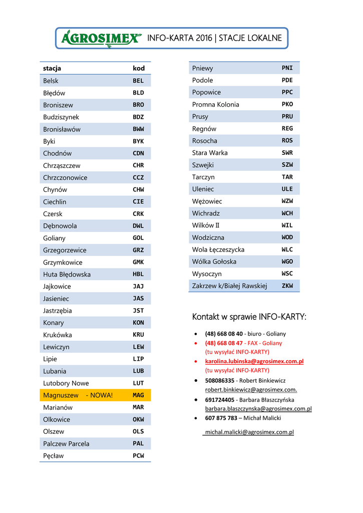 INFO-KARTA 2016 | STACJE LOKALNE stacja kod Pniewy PNI Belsk BEL Podole PDE Błędów BLD Popowice PPC Broniszew BRO Promna Kolonia PKO Budziszynek BDZ Prusy PRU Bronisławów BWW Regnów REG Byki BYK Rosocha ROS Chodnów CDN Stara Warka SWR Chrząszczew CHR Szwejki SZW Chrzczonowice CCZ Tarczyn TAR Chynów CHW Uleniec ULE Ciechlin CIE Wężowiec WZW Czersk CRK Wichradz WCH Dębnowola DWL Wilków II WIL Goliany GOL Wodziczna WOD Grzegorzewice GRZ Wola Łęczeszycka WLC Grzymkowice GMK Wólka Gołoska WGO Huta Błędowska HBL Wysoczyn WSC Jajkowice JAJ Zakrzew k/Białej Rawskiej ZKW Jasieniec JAS Jastrzębia JST Konary KON Krukówka KRU Lewiczyn LEW Lipie LIP Lubania LUB Lutobory Nowe LUT Magnuszew MAG - NOWA! Marianów MAR Olkowice OKW Olszew OLS Palczew Parcela PAL Pęcław PCW Kontakt w sprawie INFO-KARTY: (48) 668 08 40 - biuro - Goliany (48) 668 08 47 - FAX - Goliany (tu wysyłać INFO-KARTY) [email protected] (tu wysyłać INFO-KARTY) 508086335 - Robert Binkiewicz [email protected]. 691724405 - Barbara Błaszczyńska [email protected] 607 875 783 – Michał Malicki [email protected] Wzór – Info Karta 2016 Od tego sezonu jest kilka możliwości aktywacji Info-Karty: 1. Przez internet Wejdź na stronę www.info-karta.pl i postępuj zgodnie z instrukcjami na ekranie. Wypełnij formularz rejestracyjny na stronie internetowej. Podaj numer seryjny, który znajduje się na lewym egzemplarzu Info-karty dla klienta 2. Przez telefon Zadzwoń pod numer telefonu 48 66 80 840. Połączysz się z naszym konsultantem, który aktywuje Twoją Info-Kartę. Podczas rozmowy podaj numer seryjny, który otrzymałeś w pudełku. 3. W sklepie Wypełnij I podpisz formularz rejestracyjny, a następnie przekaż go sprzedawcy w sklepie, gdzie nabyłeś Info-Kartę. Zachowaj dla siebie kupon odrywany od formularza rejestracyjnego oraz dowód zakupu. INFO-KARTA 2016 | STACJE ZAMIEJSCOWE stacja Białośliwie k/Piły Chruślina k/Opola Lubelskiego Czerniec k/Łącka Dębe k/Serocka Gołębiów k/Sandomierza Gorzyczany k/Sandomierza Granice kod Skarbikowo BIA Sompolinek k/Konina CRU CZR DBE GBW GOR Kompina k/Łowicza Las Dębowy k/Opola Lubelskiego Lenarczyce k/Sandomierza Mostki k/Konina Nowodwór k/Dęblina Piotrowice k/Nałęczowa Polubicze k/Radzynia Podlaskiego Rogów k/Łodzi Rudniczek k/Łodzi Rybno k/Sochaczewa Wandalin k/Opola Lubelskiego GRU k/Przysuchy Trzebnica k/Wrocławia Grudziądz Kamień Świątniki k/Sandomierza Tęgoborze k/Nowego Sącza GRA k/Radzynia Podlaskiego Śmiłowice k/Włocławka k/Opola Lubelskiego Horodyszcze k/Błonia HOR KAM KMP LAS LEN MKU NOW PIO Wojciechów k/Opola Lubelskiego Wójtostwo k/ Serocka Wtelno k/Bydgoszczy Zakalinki k/Białej Podlaskiej Żurawieniec k/Kutna SKA SPL SMI STK TGB TRZ WAN WOJ WTO WTE ZAK ZUR Kontakt w sprawie INFO-KARTY: (48) 668 08 40 - biuro - Goliany (48) 668 08 47 - FAX - Goliany (tu wysyłać INFO-KARTY) [email protected] (tu wysyłać INFO-KARTY) POL 508086335 - Robert Binkiewicz [email protected]. ROG RUD 691724405 - Barbara Błaszczyńska [email protected] 607 875 783 – Michał Malicki [email protected] RYB