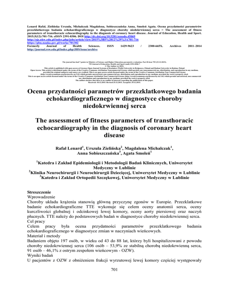 Lenard Rafał, Zielińska Urszula, Michalczak Magdalena, Sobieszczańska Anna, Smoleń Agata. Ocena przydatności parametrów przezklatkowego badania echokardiograficznego w diagnostyce choroby niedokrwiennej serca = The assessment of fitness parameters of transthoracic echocardiography in the diagnosis of coronary heart disease. Journal of Education, Health and Sport. 2015;5(12):701-716. eISSN 2391-8306. DOI http://dx.doi.org/10.5281/zenodo.45069 http://ojs.ukw.edu.pl/index.php/johs/article/view/2015%3B5%2812%29%3A701-716 https://pbn.nauka.gov.pl/works/701302 Formerly Journal of Health Sciences. ISSN 1429-9623 / 2300-665X. Archives 2011–2014 http://journal.rsw.edu.pl/index.php/JHS/issue/archive The journal has had 7 points in Ministry of Science and Higher Education parametric evaluation. Part B item 755 (23.12.2015). 755 Journal of Education, Health and Sport (null) 2391-8306 7 © The Author (s) 2015; This article is published with open access at Licensee Open Journal Systems of Kazimierz Wielki University in Bydgoszcz, Poland and Radom University in Radom, Poland Open Access. This article is distributed under the terms of the Creative Commons Attribution Noncommercial License which permits any noncommercial use, distribution, and reproduction in any medium, provided the original author(s) and source are credited. This is an open access article licensed under the terms of the Creative Commons Attribution Non Commercial License (http://creativecommons.org/licenses/by-nc/3.0/) which permits unrestricted, non commercial use, distribution and reproduction in any medium, provided the work is properly cited. This is an open access article licensed under the terms of the Creative Commons Attribution Non Commercial License (http://creativecommons.org/licenses/by-nc/3.0/) which permits unrestricted, non commercial use, distribution and reproduction in any medium, provided the work is properly cited. The authors declare that there is no conflict of interests regarding the publication of this paper. Received: 10.12.2015. Revised 25.12.2015. Accepted: 29.12.2015. Ocena przydatności parametrów przezklatkowego badania echokardiograficznego w diagnostyce choroby niedokrwiennej serca The assessment of fitness parameters of transthoracic echocardiography in the diagnosis of coronary heart disease Rafał Lenard1, Urszula Zielińska2, Magdalena Michalczak1, Anna Sobieszczańska3, Agata Smoleń1 1 Katedra i Zakład Epidemiologii i Metodologii Badań Klinicznych, Uniwersytet Medyczny w Lublinie 2 Klinika Neurochirurgii i Neurochirurgii Dziecięcej, Uniwersytet Medyczny w Lublinie 3 Katedra i Zakład Ortopedii Szczękowej, Uniwersytet Medyczny w Lublinie Streszczenie Wprowadzenie Choroby układu krążenia stanowią główną przyczynę zgonów w Europie. Przezklatkowe badanie echokardiograficzne TTE wykonuje się celem oceny anatomii serca, oceny kurczliwości globalnej i odcinkowej lewej komory, oceny aorty piersiowej oraz naczyń płucnych. TTE należy do podstawowych badań w diagnostyce choroby niedokrwiennej serca. Cel pracy Celem pracy była ocena przydatności parametrów przezklatkowego badania echokardiograficznego w diagnostyce zmian w naczyniach wieńcowych. Materiał i metody Badaniem objęto 197 osób, w wieku od 43 do 88 lat, którzy byli hospitalizowani z powodu choroby niedokrwiennej serca (106 osób – 53,9% ze stabilną chorobą niedokrwienną serca, 91 osób – 46,1% z ostrym zespołem wieńcowym - OZW). Wyniki badań U pacjentów z OZW z obniżeniem frakcji wyrzutowej lewej komory częściej występowały 701 istotne zmiany w tętnicach wieńcowych (p<0,0001). Wśród chorych z ostrym zespołem wieńcowym częściej występowała obniżona frakcja wyrzutowa lewej komory (62,6%) w porównaniu z pacjentami ze stabilną chorobą niedokrwienną serca (24,5%) (p<0,0001). W subpopulacji osób z OZW częściej występowały odcinkowe zaburzenia kurczliwości (67,0%) w porównaniu do grupy osób ze stabilną chorobą niedokrwienną serca (8,0%) (p<0,0001). Wnioski 1. Badanie echokardiograficzne powinno być wykonywane u każdego pacjenta z podejrzeniem choroby niedokrwiennej serca, jeżeli tylko nie opóźnia pilnej rewaskularyzacji mięśnia serca. 2. Badanie echokardiograficzne jest najważniejszym badaniem w diagnostyce różnicowej bólu w klatce piersiowej oraz pozwala na stratyfikację ryzyka zdarzeń sercowonaczyniowych. 3. Do najważniejszych parametrów w diagnostyce ChNS należy ocena frakcji wyrzutowej oraz regionalnych zaburzeń kurczliwości mięśnia lewej komory. 4. Zmniejszenie frakcji wyrzutowej oraz regionalne zaburzenia kurczliwości lewej komory są charakterystyczne dla zawału mięśnia serca (STEMI, NSTEMI). Słowa kluczowe: echokardiografia, choroba niedokrwienna serca, diagnostyka. Abstract Introduction Cardiovascular diseases are the major cause of death in Europe. Transthoracic echocardiography (TTE) is one of the most important examination in the diagnosis of coronary artery disease (CAD). Aim of the study The aim of the study was to evaluate parameters of TTE in the diagnosis of coronary artery disease. Methods and results The study included 197 patients hospitalized with coronary artery disease (106 -53.9% with stable CAD, 91 – 46.1% with acute coronary syndrome - ACS). The major atherosclerotic changes in the coronary arteries were more frequent in males, in patients with ACS and reduction of left ventricular ejection fraction (p<0.0001). In patients with ACS left ventricular ejection fraction was more frequent decreased (62.6%) compared to patients with stable coronary artery disease (24.5%) (p <0,0001). In patients with ACS segmental wall motion abnormalities were more frequent 61/91 (67.0%) compared to patients with stable CAD 9/106 (8.0%) (p<0.0001) Conclusions: 1. The echocardiography should be performed in every patient with suspected coronary heart disease, if only it doesn’t delay urgent revascularization of the heart muscle. 2. The echocardiogra