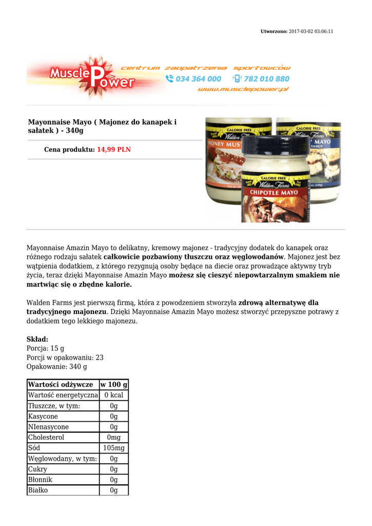 Utworzono: 2017-03-02 03:06:11 Mayonnaise Mayo ( Majonez do kanapek i sałatek ) - 340g Cena produktu: 14,99 PLN Mayonnaise Amazin Mayo to delikatny, kremowy majonez - tradycyjny dodatek do kanapek oraz różnego rodzaju sałatek całkowicie pozbawiony tłuszczu oraz węglowodanów. Majonez jest bez wątpienia dodatkiem, z którego rezygnują osoby będące na diecie oraz prowadzące aktywny tryb życia, teraz dzięki Mayonnaise Amazin Mayo możesz się cieszyć niepowtarzalnym smakiem nie martwiąc się o zbędne kalorie. Walden Farms jest pierwszą firmą, która z powodzeniem stworzyła zdrową alternatywę dla tradycyjnego majonezu. Dzięki Mayonnaise Amazin Mayo możesz stworzyć przepyszne potrawy z dodatkiem tego lekkiego majonezu. Skład: Porcja: 15 g Porcji w opakowaniu: 23 Opakowanie: 340 g Wartości odżywcze w 100 g Wartość energetyczna 0 kcal Tłuszcze, w tym: 0g Kasycone 0g NIenasycone 0g Cholesterol Sód 0mg 105mg Węglowodany, w tym: 0g Cukry 0g Błonnik 0g Białko 0g Witamina A ślad. Wapń ślad. Witamina C ślad. Żelazo ślad. Dawkowanie: W zależności od zapotrzebowania. Adres: http://www.muscle.trustnet.pl/ Telefon: 34 36 43 000, 782 010 880 Email: [email protected]