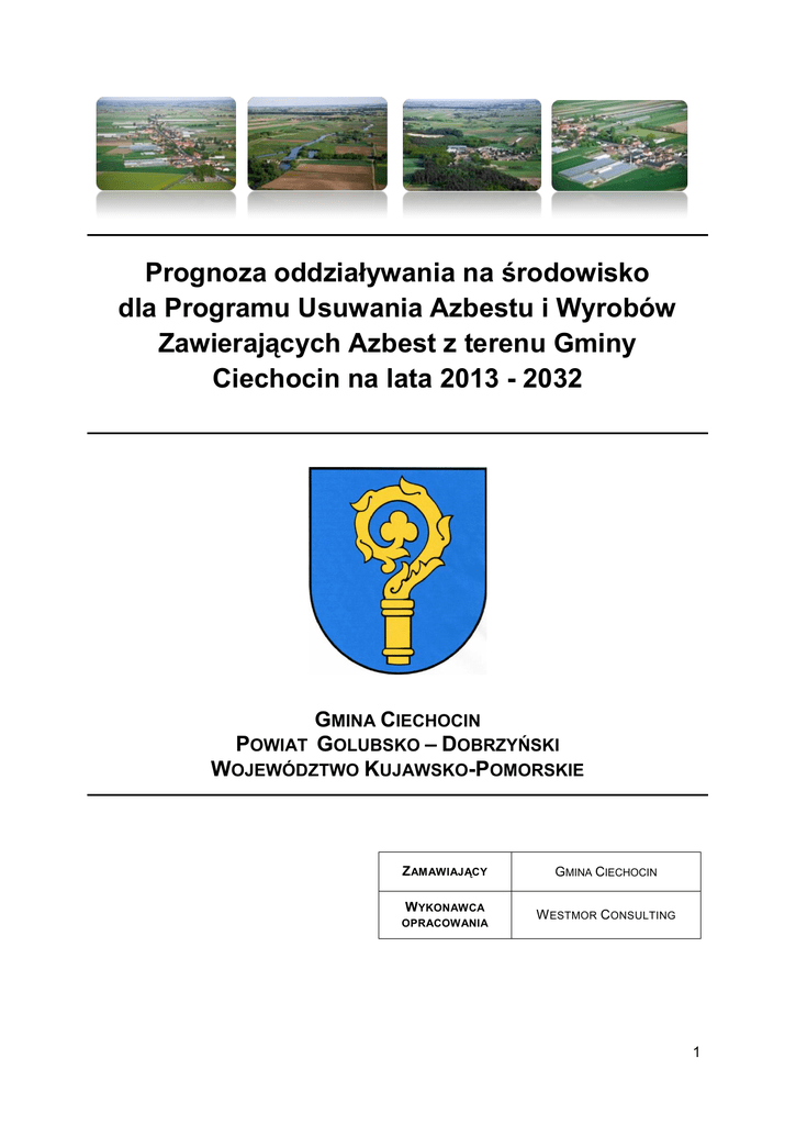 Prognoza oddziaływania na środowisko dla Programu Usuwania Azbestu i Wyrobów Zawierających Azbest z terenu Gminy Ciechocin na lata 2013 - 2032 GMINA CIECHOCIN POWIAT GOLUBSKO – DOBRZYŃSKI WOJEWÓDZTWO KUJAWSKO-POMORSKIE Z AMAWIAJĄCY GMINA CIECHOCIN W YKONAWCA OPRACOWANIA W ESTMOR CONSULTING 1 PROGNOZA ODDZIAŁYWANIA NA ŚRODOWISKO DLA PROGRAMU USUWANIA AZBESTU I WYROBÓW ZAWIERAJĄCYCH AZBEST Z TERENU GMINY CIECHOCIN NA LATA 2013 – 2032 CIECHOCIN 2013 Spis treści 1. PODSTAWA OPRACOWANIA ............................................................................................... 4 2. PRZEDMIOT OPRACOWANIA – CELE GŁÓWNE, ZAWARTOŚĆ PROGRAMU I POWIĄZANIA Z INNYMI DOKUMENTAMI. ................................................................................................................ 6 2.1. GŁÓWNE CELE .............................................................................................................. 6 2.2. ZAWARTOŚĆ PROGRAMU............................................................................................... 7 2.3. BILANS WYROBÓW ZAWIERAJĄCYCH AZBEST NA TERENIE GMINY CIECHOCIN .................... 9 2.2. KONCEPCJA ZARZĄDZANIA I MONITORINGU PROGRAMU ..................................................11 3. METODYKA ZASTOSOWANA PRZY SPORZĄDZANIU PROGNOZY .............................................13 4. ANALIZA ZGODNOŚCI PROJEKTOWANEGO DOKUMENTU Z INNYMI DOKUMENTAMI ..................15 5. AKTUALNY STAN ŚRODOWISKA GMINY CIECHOCIN .............................................................18 5.1. POŁOŻENIE GEOGRAFICZNE ......................................................................................18 5.2. BIORÓŻNORODNOŚĆ FAUNY I FLORY ..........................................................................19 5.3. POWIETRZE..............................................................................................................20 5.4. WODY......................................................................................................................21 5.5. GLEBY .....................................................................................................................22 5.6. KLIMAT ....................................................................................................................23 5.7. HAŁAS .....................................................................................................................24 5.8. POLA ELEKTROMAGNETYCZNE ...................................................................................25 5.9. SUROWCE NATURALNE .............................................................................................27 5.10. OBSZARY CHRONIONE ..............................................................................................29 5.11. ODPADY ..................................................................................................................30 6. PROBLEMY OCHRONY ŚRODOWISKA ISTOTNE Z PUNKTU PROJEKTOWANEGO DOKUMENTU ....32 6.1. ZANIECZYSZCZENIA POWIETRZA I ZMIANY KLIMATU ......................................................32 6.2. POWIERZCHNIA ZIEMI ORAZ ZANIECZYSZCZENIA GLEB .................................................33 6.3. ZANIECZYSZCZENIA WÓD ..........................................................................................34 6.4. KLIMAT AKUSTYCZNY ................................................................................................35 6.5. POLA ELEKTROMAGNETYCZNE ...................................................................................36 6.6. GOSPODARKA ODPADAMI ..........................................................................................36 6.7. WALORY KRAJOBRAZOWE .........................................................................................37 6.8. BIORÓŻNORODNOŚĆ FAUNY I FLORY ..........................................................................37 6.9. ZDROWIE LUDZI ........................................................................................................39 6.10. FORMY OCHRONY PRZYRODY ....................................................................................41 7. POTENCJALNE SKUTKI BRAKU REALIZACJI PROPONOWANYCH ROZWIĄZAŃ ...........................43 WESTMOR CONSULTING 2 PROGNOZA ODDZIAŁYWANIA NA ŚRODOWISKO DLA PROGRAMU USUWANIA AZBESTU I WYROBÓW ZAWIERAJĄCYCH AZBEST Z TERENU GMINY CIECHOCIN NA LATA 2013 – 2032 8. 9. ANALIZA I OCENA SKUTKÓW ŚRODOWISKOWYCH PRZEWIDYWANYCH KIERUNKÓW DZIAŁAŃ ...44 8.1. NAJWAŻNIEJSZE ODDZIAŁYWANIA I ZAGROŻENIA. SKUTKI ODDZIAŁYWAŃ NA ŚRODOWISKO. KIERUNKI I SKALA PRZEWIDYWANYCH ZMIAN STANU ŚRODOWISKA..........44 8.2. ZAPOBIEGANIE, OGRANICZANIE LUB KOMPENSACJA PRZYRODNICZA NEGATYWNYCH ODDZIAŁYWAŃ NA ŚRODOWISKO ................................................................................48 8.3. POTENCJALNE ODDZIAŁYWANIA TRANSGRANICZNE .....................................................49 OCENA ROZWIĄZAŃ ALTERNATYWNYCH ............................................................................49 10. METODY ANALIZY REALIZACJI ZADAŃ I POSTANOWIEŃ ZAWARTYCH W PROGRAMIE ..............50 11. STRESZCZENIE SPORZĄDZONE W JĘZYKU NIESPECJALISTYCZNYM ......................................51 12. SPIS TABEL .....................................................................................................................53 13. SPIS RYSUNKÓW .............................................................................................................53 WESTMOR CONSULTING 3 1. Podstawa opracowania Podstawą prawną sporządzenia „Prognozy oddziaływania na środowisko dla Programu Usuwania Azbestu i Wyrobów Zawierających Azbest z terenu Gminy Ciechocin na lata 20132032” jest art. 46 ustawy z dnia 3 października 2008 r. o udostępnianiu informacji o środowisku i jego ochronie, udziale społeczeństwa w ochronie środowiska oraz o ocenach oddziaływania na środowisko (Dz. U. z 2008 Nr 199, poz