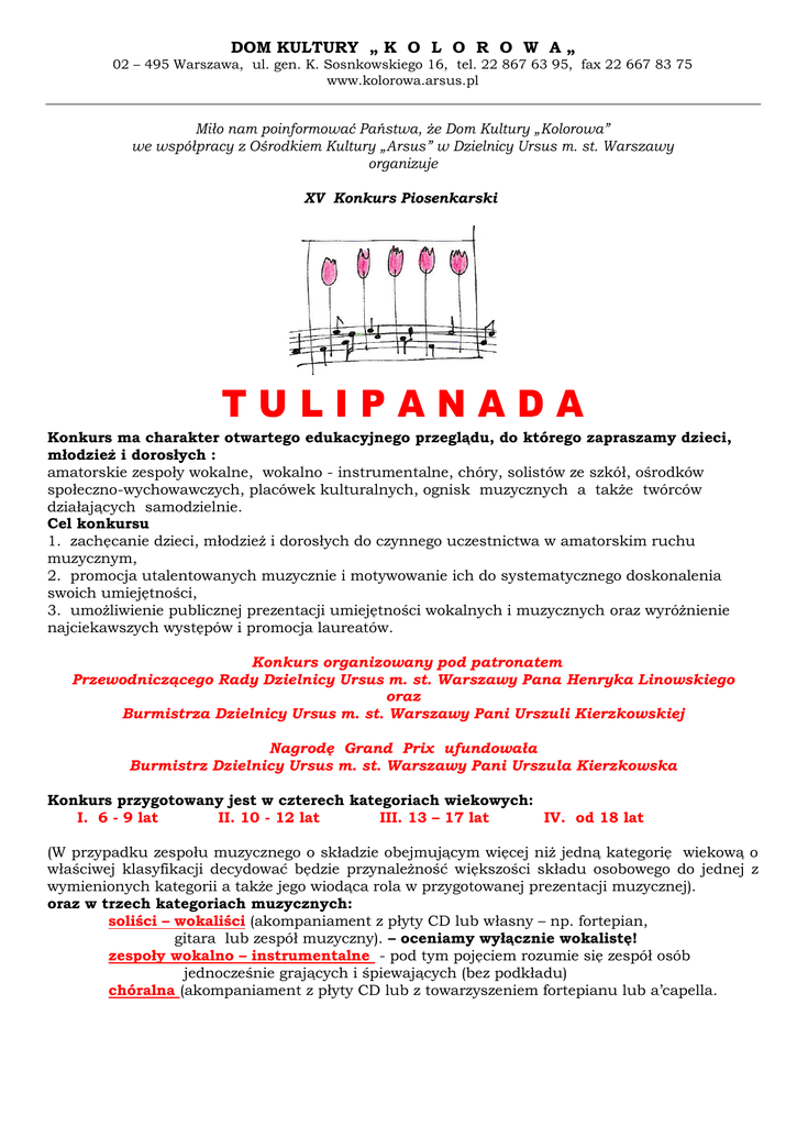 DOM KULTURY „ K O L O R O W A „ 02 – 495 Warszawa, ul. gen. K. Sosnkowskiego 16, tel. 22 867 63 95, fax 22 667 83 75 www.kolorowa.arsus.pl Miło nam poinformować Państwa, że Dom Kultury „Kolorowa” we współpracy z Ośrodkiem Kultury „Arsus” w Dzielnicy Ursus m. st. Warszawy organizuje XV Konkurs Piosenkarski TULIPANADA Konkurs ma charakter otwartego edukacyjnego przeglądu, do którego zapraszamy dzieci, młodzież i dorosłych : amatorskie zespoły wokalne, wokalno - instrumentalne, chóry, solistów ze szkół, ośrodków społeczno-wychowawczych, placówek kulturalnych, ognisk muzycznych a także twórców działających samodzielnie. Cel konkursu 1. zachęcanie dzieci, młodzież i dorosłych do czynnego uczestnictwa w amatorskim ruchu muzycznym, 2. promocja utalentowanych muzycznie i motywowanie ich do systematycznego doskonalenia swoich umiejętności, 3. umożliwienie publicznej prezentacji umiejętności wokalnych i muzycznych oraz wyróżnienie najciekawszych występów i promocja laureatów. Konkurs organizowany pod patronatem Przewodniczącego Rady Dzielnicy Ursus m. st. Warszawy Pana Henryka Linowskiego oraz Burmistrza Dzielnicy Ursus m. st. Warszawy Pani Urszuli Kierzkowskiej Nagrodę Grand Prix ufundowała Burmistrz Dzielnicy Ursus m. st. Warszawy Pani Urszula Kierzkowska Konkurs przygotowany jest w czterech kategoriach wiekowych: I. 6 - 9 lat II. 10 - 12 lat III. 13 – 17 lat IV. od 18 lat (W przypadku zespołu muzycznego o składzie obejmującym więcej niż jedną kategorię wiekową o właściwej klasyfikacji decydować będzie przynależność większości składu osobowego do jednej z wymienionych kategorii a także jego wiodąca rola w przygotowanej prezentacji muzycznej). oraz w trzech kategoriach muzycznych: soliści – wokaliści (akompaniament z płyty CD lub własny – np. fortepian, gitara lub zespół muzyczny). – oceniamy wyłącznie wokalistę! zespoły wokalno – instrumentalne - pod tym pojęciem rozumie się zespół osób jednocześnie grających i śpiewających (bez podkładu) chóralna (akompaniament z płyty CD lub z towarzyszeniem fortepianu lub a’capella. Repertuar Każdy z uczestników prezentuje w I etapie eliminacji dowolny jeden utwór (piosenka w języku polskim! ) Uczestnicy zakwalifikowani do II etapu prezentują w nim drugi utwór (inny niż w I etapie) (piosenka w języku polskim!) Czas prezentacji nie może przekroczyć 7 minut. Jury zastrzega sobie prawo do możliwości przerwania prezentacji. Uczestnicy nie posiadający instrumentu muzycznego będą mieli możliwość uzyskania w tym zakresie pomocy ze strony Domu Kultury po uprzednim zgłoszeniu w karcie uczestnictwa. Organizator zapewnia kompletne nagłośnienie w zależności od wymagań uczestnika. Dopuszcza się możliwość akompaniamentu zarejestrowanego na CD lub podkład muzyczny (syntezator, fortepian, gitara itp.). Bardzo prosimy o zwrócenie uwagi na jakość techniczną podkładu. Słabe parametry techniczne podkładu obniżają jakość prezentacji artystycznej. Termin i miejsce konkursu Eliminacje odbędą się w Ośrodku Kultury „Arsus” – sala widowiskowa, Warszawa-Ursus, ul. Traktorzystów 14: I etap - 7 kwietnia (piątek), 21 kwietnia (piątek) 2017 roku. Szczegółowy plan przesłuchań dostępny będzie na stronie internetowej www.kolorowa.arsus.pl II etap – 5 maja (piątek) 2017 roku, do którego jury zakwalifikuje najlepszych z każdej kategorii wiekowej. Informacja o zakwalifikowanych do II etapu będzie dostępna na stronie internetowej www.kolorowa.arsus.pl po zakończeniu eliminacji. Werdykt jury będzie dostępny na stronie internetowej www.kolorowa.arsus.pl - 10.05. 2017r. Karty uczestnictwa należy przesłać lub dostarczyć do dnia 13 marca 2017 roku na adres: Dom Kultury "Kolorowa", 02 - 495 Warszawa-Ursus, ul. gen. K. Sosnkowskiego 16 "TULIPANADA" tel. 22 867 63 95, fax 22 667 83 75, e-mail: [email protected] lub on-line ze strony organizatora. Kwota „wpisowego“ od jednego zgłoszenia (osoby, zespołu lub chóru) wynosi 20 (dwadzieścia) złotych. Należy ją wpłacić na konto Ośrodka Kultury „Arsus“ 02 -495 Warszawa, ul.Traktorzystów 14: Bank PKO S.A. O/Warszawa nr 83 1240 2887 1111 0010 0357 8215 z dopiskiem:“ Opłata wpisowa –Tulipanada - imię i nazwisko uczestnika „ w nieprzekraczalnym terminie do 13 marca br. Opłata nie podlega zwrotowi, gdy uczestnik nie stawił się w dniu eliminacji. Nagrody konkursowe Jury XV Konkursu Piosenkarskiego "TULIPANADA" przyzna nagrody odpowiednio w kategoriach wiekowych i kategoriach muzycznych. W uzasadnionych przypadkach jury w porozumieniu z organizatorem ma prawo przyznać indywidualne nagrody i wyróżnienia. Koncert Laureatów i uroczyste wręczenie nagród odbędzie się 24 maja (środa) 2017 roku o godzinie 18.00 w sali widowiskowej Ośrodka Kultury "Arsus", Warszawa - Ursus ul. Traktorzystów 14. Kryteria oceny uczestników konkursu precyzja intonacji, dykcja i interpretacja wrażenie artystyczno - estetyczne dobór repertuaru (ze względu na wiek wykonawcy) Informacje Szczegółowych informacji udziela opiekun konkursu Janusz Łukaszewicz Dom Kultury „ Kolorowa ” 02 – 495 Warszawa-Ursus, ul. gen. K. Sosnkowskiego 16, II piętro pokój 230, kom. 0 604 503 353, tel. 22 867 63 95, fax 22 667 83 75 Powyższa informacja będzie dostępna również na stronie internetowej organizatora www.kolorowa.arsus.pl w załączeniu: karta zgłoszenia Organizatorzy XV Konkurs Piosenkarski TULIPANADA KARTA ZGŁOSZENIA PROSIMY WYPEŁNIĆ PISMEM DRUKOWANYM Nazwa placówki zgłaszającej adres telefon fax e-mail Imię i nazwisko uczestnika lub nazwa zespołu (w przypadku zespołu –podać ilość osób) Kategoria wiekowa (proszę odpowiednio zaznaczyć) I. (6 - 9 lat) II. (10 -12 lat) III. (13- 17 lat) IV. (od 18 lat) soliści – wokaliści zespoły wokalno – instrumentalne chóralna Kategoria muzyczna (proszę odpowiednio zaznaczyć) I etap tytuł utworu kompozytor au