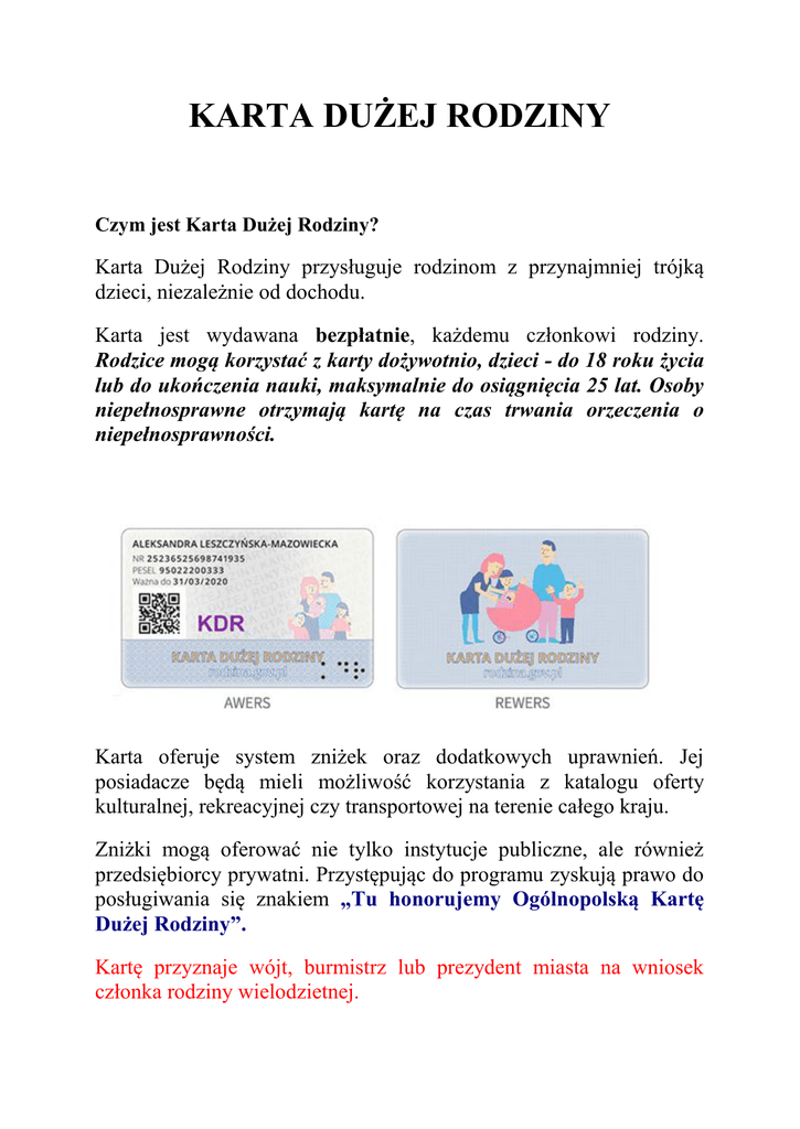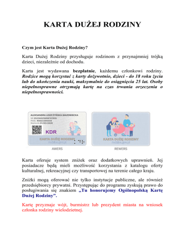 KARTA DUŻEJ RODZINY Czym jest Karta Dużej Rodziny? Karta Dużej Rodziny przysługuje rodzinom z przynajmniej trójką dzieci, niezależnie od dochodu. Karta jest wydawana bezpłatnie, każdemu członkowi rodziny. Rodzice mogą korzystać z karty dożywotnio, dzieci - do 18 roku życia lub do ukończenia nauki, maksymalnie do osiągnięcia 25 lat. Osoby niepełnosprawne otrzymają kartę na czas trwania orzeczenia o niepełnosprawności. Karta oferuje system zniżek oraz dodatkowych uprawnień. Jej posiadacze będą mieli możliwość korzystania z katalogu oferty kulturalnej, rekreacyjnej czy transportowej na terenie całego kraju. Zniżki mogą oferować nie tylko instytucje publiczne, ale również przedsiębiorcy prywatni. Przystępując do programu zyskują prawo do posługiwania się znakiem „Tu honorujemy Ogólnopolską Kartę Dużej Rodziny”. Kartę przyznaje wójt, burmistrz lub prezydent miasta na wniosek członka rodziny wielodzietnej. Co oferuje Karta Dużej Rodziny? Tańsze bilety na wydarzenia kulturalne, wystawy, muzea, przejazdy komunikacją publiczną, a nawet wakacje - na to mogą liczyć rodziny wielodzietne dzięki Karcie Dużej Rodziny. Ogólnopolska Karta Dużej Rodziny to system zniżek dla rodzin wielodzietnych. Liczba instytucji i firm, które oferują zniżki rodzinom systematycznie się powiększa. Wszystkie miejsca oferujące zniżki będą opatrzone logo „Tu honorujemy Kartę Dużej Rodziny”. Ponad to od 1 stycznia 2015 roku Ustawa o Karcie Dużej Rodziny rozszerzy na dorosłych członków rodzin wielodzietnych posiadających Kartę Dużej Rodziny ustawowe zniżki na przejazdy kolejowe: 37% ulgi przy przejazdach publicznym transportem kolejowym na podstawie biletów jednorazowych oraz 49% ulgi dla posiadaczy biletów miesięcznych. Otrzymują oni również ulgi w opłacie paszportowej: 75% w przypadku dzieci oraz 50% dla rodziców. Rodziny wielodzietne będą także zwolnione z opłat za wstęp do parków narodowych oraz za wydanie odpisów aktów stanu cywilnego przy staraniu się o przyznanie Karty. Składając wniosek o przyznanie Karty Dużej Rodziny trzeba okazać oryginały lub odpisy dokumentów potwierdzających stanowienie rodziny wielodzietnej. Oznacza to, że członek rodziny wielodzietnej ubiegający się o przyznanie Karty Dużej Rodziny jest zobowiązany do pokazania oryginałów lub odpisów tych dokumentów. Przy składaniu wniosku należy okazać w szczególności: 1) w przypadku rodzica oraz małżonka rodzica – dokument potwierdzający tożsamość; 2) w przypadku dzieci w wieku do ukończenia 18. roku życia – akt urodzenia lub dokument potwierdzający tożsamość; 3) w przypadku dzieci w wieku powyżej 18. roku życia – dokument potwierdzający tożsamość oraz zaświadczenie ze szkoły lub szkoły wyższej o planowanym terminie ukończenia nauki w danej placówce; 4) w przypadku dzieci legitymujących się orzeczeniem o umiarkowanym albo znacznym stopniu niepełnosprawności w wieku powyżej 18. roku życia – dokument potwierdzający tożsamość oraz orzeczenie o umiarkowanym albo znacznym stopniu niepełnosprawności; 5) w przypadku dzieci umieszczonych w rodzinie zastępczej lub rodzinnym domu dziecka – postanowienie o umieszczeniu w rodzinie zastępczej lub rodzinnym domu dziecka; 6) w przypadku osób, o których mowa w art. 37 ust. 2 ustawy z dnia 9 czerwca 2011 r. o wspieraniu rodziny i systemie pieczy zastępczej – zaświadczenie o pozostawaniu w dotychczasowej rodzinie zastępczej lub rodzinnym domu dziecka. 7) Składając wniosek o wydanie duplikatu Karty, należy okazać dokument potwierdzający tożsamość lub, w przypadku dziecka, odpis aktu urodzenia. Należy jednak wskazać, że organ może domagać się okazania innych dokumentów lub ich odpisów, jeżeli będzie to niezbędne w celu ustalenia uprawnienia do korzystania z Karty Dużej Rodziny(np. w przypadku cudzoziemca). Okazanie dokumentów przez wnioskodawcę nie jest wymagane w przypadku, gdy wójt (burmistrz lub prezydent miasta) może bezpłatnie we własnym zakresie uzyskać dane niezbędne do ustalenia prawa do korzystania z programu za pomocą urządzeń teletransmisji danych (np. jeżeli istnieje możliwość skorzystania z bazy PESEL). Wszelkie dodatkowe informacje dostępne są również oraz na stronie internetowej: www.rodzina.gov.pl/duza-rodzina/karta-duzej-rodziny