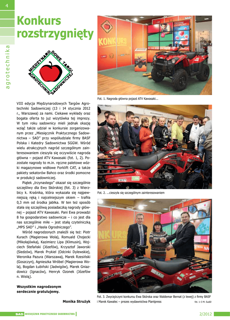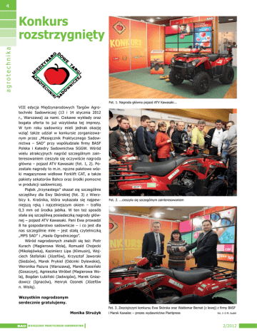 4 agrotechnika Konkurs rozstrzygnięty Fot. 1. Nagroda główna pojazd ATV Kawasaki... VIII edycja Międzynarodowych Targów Agrotechniki Sadowniczej (13 i 14 stycznia 2012 r., Warszawa) za nami. Ciekawe wykłady oraz bogata oferta to już wizytówka tej imprezy. W tym roku sadownicy mieli jednak okazję wziąć także udział w konkursie zorganizowanym przez „Miesięcznik Praktycznego Sadownictwa – SAD” przy współudziale firmy BASF Polska i Katedry Sadownictwa SGGW. Wśród wielu atrakcyjnych nagród szczególnym zainteresowaniem cieszyła się oczywiście nagroda główna – pojazd ATV Kawasaki (fot. 1, 2). Pozostałe nagrody to m.in. ręczne paletowe wózki magazynowe widłowe Forklift CAT, a także pakiety sekatorów Bahco oraz środki pomocne w produkcji sadowniczej. Piątek „trzynastego” okazał się szczególnie szczęśliwy dla Ewy Skórskiej (fot. 3) z Wierzbicy k. Kraśnika, która wykazała się najpewniejszą ręką i najcelniejszym okiem – trafiła 0,3 mm od środka jabłka. W ten też sposób stała się szczęśliwą posiadaczką nagrody głównej – pojazd ATV Kawasaki. Pani Ewa prowadzi 8 ha gospodarstwo sadownicze – i co jest dla nas szczególnie miłe – jest stałą czytelniczką „MPS SAD” i „Hasła Ogrodniczego”. Wśród nagrodzonych znaleźli się też: Piotr Kurach (Magierowa Wola), Romuald Chojecki (Mikołajówka), Kazimierz Lipa (Klimusin), Wojciech Stefański (Józefów), Krzysztof Jaworski (Siedzów), Marek Prykiel (Odcinki Dylewskie), Weronika Pazura (Warszawa), Marek Rzesiński (Goszczyn), Agnieszka Wróbel (Magierowa Wola), Bogdan Łubiński (Jadwigów), Marek Gniazdowicz (Ignaców), Henryk Ozonek (Józefów n. Wisłą). Fot. 2. ...cieszyła się szczególnym zainteresowaniem Wszystkim nagrodzonym serdecznie gratulujemy. Fot. 3. Zwyciężczyni konkursu Ewa Skórska oraz Waldemar Bernat (z lewej) z firmy BASF Monika Strużyk miesięcznik praktycznego sadownictwa i Marek Kawalec – prezes wydawnictwa Plantpress fot. 1–3 M. Sudół 2/2012