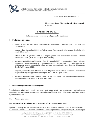 Opole, dnia 10 stycznia 2013 r. Okręgowa Izba Pielęgniarek i Położnych w Opolu OPINIA PRAWNA dotycząca uprawnień pielęgniarki systemu I. Podstawa prawna: - ustawa z dnia 15 lipca 2011 r. o zawodach pielęgniarki i położnej (Dz. U. Nr 174, poz. 1039 ze zm.); - ustawa z dnia 8 września 2006 r. o Państwowym Ratownictwie Medycznym (Dz. U. Nr 191, poz. 1410 ze zm.); - ustawa z dnia 5 grudnia 2008 r. o zapobieganiu oraz zwalczaniu zakażeń i chorób zakaźnych u ludzi (Dz. U. Nr 234, poz. 1570 ze zm.); - rozporządzenie Ministra Zdrowia z dnia 7 listopada 2007 r. w sprawie rodzaju i zakresu świadczeń zapobiegawczych, diagnostycznych, leczniczych i rehabilitacyjnych udzielanych przez pielęgniarkę albo położną samodzielnie bez zlecenia lekarskiego (Dz. U. Nr 210, poz. 1540); - rozporządzenie Ministra Zdrowia z dnia 29 października 2003r. w sprawie kształcenia podyplomowego pielęgniarek i położnych (Dz. U. Nr 197, poz. 1922), - rozporządzenie Ministra Zdrowia z dnia 18 sierpnia 2011 r. w sprawie obowiązkowych szczepień ochronnych (Dz. U. Nr 182, poz. 1086). II. Określenie przedmiotu i celu opinii: Przedmiotem niniejszej opinii prawnej jest odpowiedź na przekazane opiniującemu zapytanie: czy pielęgniarka systemu musi ukończyć kursy EKG i RGO oraz jak długo ważne są kursy szczepień. III. Ocena pr awna: Ad. Uprawnienia pielęgniarki systemu do wykonywania EKG Zgodnie z obowiązującym obecnie rozporządzeniem Ministra Zdrowia z dnia 7 listopada 2007 r. w sprawie rodzaju i zakresu świadczeń zapobiegawczych, diagnostycznych, leczniczych ul. Ligonia 13/4, 45-362 Opole | tel.: (077) 453 12 17 | fax: (077) 453 02 93 e-mail: kancelaria@radcy prawni.opole.pl | www.radcyprawni.opole.pl NIP 7542954923 | KRS 0000316483 | Regon 160220424 i rehabilitacyjnych udzielanych przez pielęgniarkę albo położną samodzielnie bez zlecenia lekarskiego (dalej „rozporządzenie”), zasadniczo pielęgniarka jest uprawniona do wykonywania samodzielnie, bez zlecenia lekarskiego świadczeń diagnostycznych obejmujących wykonywanie EKG pod warunkiem odbycia kursu specjalistycznego. W przypadku natomiast pielęgniarek systemu w rozumieniu art. 3 pkt 6 ustawy z dnia 8 września 2006 r. o Państwowym Ratownictwie Medycznym (Dz. U. Nr 191, poz. 1410 oraz z 2007 r. Nr 89, poz. 590 i Nr 166, poz. 1172) zgodnie z § 2, pielęgniarki systemu są uprawnione do wykonywania samodzielnie bez zlecenia lekarskiego medycznych czynności ratunkowych obejmujących między innymi: - wykonanie EKG, wykonanie defibrylacji ręcznej na podstawie EKG, wykonanie defibrylacji zautomatyzowanej (§ 2 pkt 9-11 rozporządzenia). Mając powyższe na uwadze w ocenie opiniującego pielęgniarka systemu posiada uprawnienia do samodzielnego wykonywania badań elektrokardiograficznych bez konieczności ukończenia kurs u specjalistyczn ego w przedmiotowym zakresie. Ad. Uprawnienia pielęgniarki systemu - RKO Podobnie w przypadku resuscytacji krążeniowo-oddechowej (RKO) rozporządzenie przewiduje uprawnienie dla pielęgniarek systemu do wykonywania czynności samodzielnie bez zlecenia lekarskiego medycznych czynności ratunkowych obejmujących podjęcie i prowadzenie podstawowej i zaawansowanej resuscytacji krążeniowo-oddechowej u dorosłych i dzieci według standardów ogłoszonych w obwieszczeniu wydanym na podstawie art. 43 ustawy o Państwowym Ratownictwie Medycznym. Zatem nie jest wymagalne dla pielęgniarki system u odbywanie kursu specjalistycznego RKO dla wykonywania resuscytacji krążeniowo – oddechowej. Ad. Projekt nowego rozporządzenia Mając na uwadze przygotowywanie projektu wprowadzenia nowego rozporządzenia w sprawie rodzaju i zakresu świadczeń zapobiegawczych, diagnostycznych, leczniczych i rehabilitacyjnych udzielanych przez pielęgniarkę albo położną samodzielnie bez zlecenia lekarskiego, informuję, iż w zakresie uprawnień pielęgniarki systemu projekt ten nie przewiduje zmian i stanowi powtórzenie brzmienia obecnie obowiązującego § 2 rozporządzenia regulującego uprawnienia pielęgniarki systemu. Zatem po wejściu przepisów nowego rozporządzenia - przy złożeniu braku ich zmiany na etapie procesu legislacyjnego - powyższe uwagi zachowają swoją aktualność. Ad. Termin ważności kursu szczepień Odnośnie natomiast zapytania dotyczącego terminu ważności kursu specjalistycznego szczepień wskazać należy, iż przepisy ustawy z dnia 15 lipca 2011 r. o zawodach pielęgniarki i położnej (Dz. 2 U. Nr 174, poz. 1039 ze zm.) w rozdziale 6 regulują zasady funkcjonowania systemu kształcenia podyplomowego pielęgniarek i położnych. Zapisy ustawy nie przewidują, terminu ważności uprawnień uzyskanych w wyniku odbycia danej formy kształcenia czy doskonalenia zawodowego. Także jeszcze obowiązujące rozporządzenie Ministra Zdrowia z dnia 29 października 2003 r. w sprawie kształcenia podyplomowego pielęgniarek i położnych (Dz. U. Nr 197, poz. 1922) nie zawiera postanowień odnośnie terminu ważności wydawanych zaświadczeń o ukończonych szkoleniach. W szczególności we wzorze zaświadczenia o ukończeniu kursu specjalistycznego, stanowiącym załącznik nr 10 do rozporządzenia, brak jest treści wskazującej na dokonywanie wpisu daty ważności takiego zaświadczenia. Jedynie w przepisie przejściowym - regulującym stosunek tego rozporządzenia do aktu prawnego uprzednio obowiązującego - wskazano, iż zaświadczenia o ukończeniu przez pielęgniarkę, położną kursu kwalifikacyjnego, kursu specjalistycznego oraz kursu dokształcającego, wydane na podstawie dotychczasowych przepisów, zachowują swoją ważność (§ 41 rozporządzenia). Zapewne także przy wejściu w życie nowego rozporządzenia regulującego tą kwestię znajdzie się zapis analogiczny, zgodnie z którym także wydane na podstawie uprzednio obowiązujących przepisów zaświadczenia zachowają swoją ważność. Reasumując, stwierdzić należy, iż zaświadczenia to wydawane są bezt