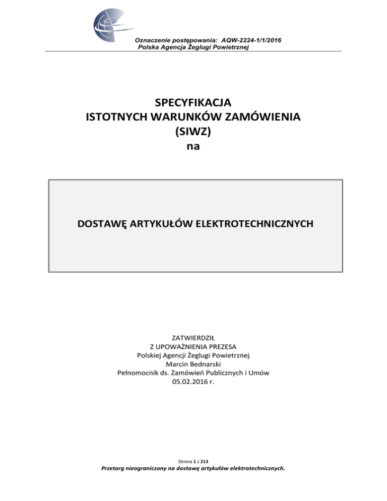 Oznaczenie postępowania: AQW-2224-1/1/2016 Polska Agencja Żeglugi Powietrznej SPECYFIKACJA ISTOTNYCH WARUNKÓW ZAMÓWIENIA (SIWZ) na DOSTAWĘ ARTYKUŁÓW ELEKTROTECHNICZNYCH ZATWIERDZIŁ Z UPOWAŻNIENIA PREZESA Polskiej Agencji Żeglugi Powietrznej Marcin Bednarski Pełnomocnik ds. Zamówień Publicznych i Umów 05.02.2016 r. Strona 1 z 213 Przetarg nieograniczony na dostawę artykułów elektrotechnicznych. Oznaczenie postępowania: AQW-2224-1/1/2016 Polska Agencja Żeglugi Powietrznej I. NAZWA I ADRES ZAMAWIAJĄCEGO Nazwa Zamawiającego: Polska Agencja Żeglugi Powietrznej Adres: ul. Wieżowa 8, 02-147 Warszawa NIP: 522-283-83-21 REGON 140886771 Fax: +48 22 574-63-59, Strona internetowa: www.pansa.pl Godziny pracy: od poniedziałku do piątku, w godzinach 7.00 – 15.00 II. TRYB UDZIELENIA ZAMÓWIENIA PRZETARG NIEOGRANICZONY Na podstawie art. 39 w zw. z art. 10 ust. 1 ustawy z dnia 29 stycznia 2004r. Prawo zamówień publicznych (t.j. Dz. U. z 2015 r. poz. 2164), zwanej dalej „ustawą”, z zastosowaniem przepisów dla postępowań, o wartości nie przekraczającej kwoty określonej w przepisach wydanych na podstawie art. 11 ust. 8 ustawy. III. OPIS PRZEDMIOTU ZAMÓWIENIA 1. 2. Przedmiotem zamówienia jest dostawa artykułów elektrotechnicznych. Oznaczenie przedmiotu zamówienia wg Wspólnego Słownika Zamówień (CPV): 31731000-9 Artykuły elektrotechniczne, 3. Miejsce realizacji przedmiotu zamówienia: Polska Agencja Żeglugi Powietrznej, ul. Wieżowa 8, 02147 Warszawa oraz Ośrodki terenowe PAŻP wskazane w Załączniku nr 1 – Szczegółowy Opis Przedmiotu Zamówienia. 4. SZCZEGÓŁOWY OPIS PRZEDMIOTU ZAMÓWIENIA – znajduje się w załączniku nr 1 do SIWZ. 5. Zamawiający oświadcza, iż nie zamierza zwoływać zebrań Wykonawców. 6. Zamawiający nie przewiduje udzielania zamówień uzupełniających, o których mowa w art. 67 ust. 1 pkt. 7 ustawy. 7. Zamawiający nie dopuszcza składania ofert częściowych. 8. Zamawiający nie dopuszcza składania ofert wariantowych. 9. Podwykonawstwo w wykonaniu przedmiotu zamówienia: 9.1. Wykonawca zamierzający powierzyć podwykonawcom realizację jakiegoś elementu zamówienia zobowiązany jest umieścić taką informację w składanej ofercie wraz z podaniem zakresu jaki zamierza powierzyć podwykonawcom. 9.2. Brak informacji, o której mowa w pkt. 9.1. będzie uznany za stwierdzenie samodzielnego wykonania zamówienia przez Wykonawcę, który złożył ofertę. 9.3. Konieczność powierzenia podwykonawcom realizacji jakiegoś elementu zamówienia wynikła w trakcie realizacji zamówienia wymaga uzyskania zgody Zamawiającego. 9.4. Za działania bądź zaniechania podwykonawców Wykonawca odpowiada, jak za swoje własne. 10. Zamawiający nie przewiduje: 10.1. zawarcia umowy ramowej, 10.2. ustanowienia dynamicznego systemu zakupów, 10.3. wyboru najkorzystniejszej oferty z zastosowaniem aukcji elektronicznej. Strona 2 z 213 Przetarg nieograniczony na dostawę artykułów elektrotechnicznych. Oznaczenie postępowania: AQW-2224-1/1/2016 Polska Agencja Żeglugi Powietrznej 11. Zamawiający informuje, że przed wszczęciem postępowania o udzielenie zamówienia nie przeprowadzono dialogu technicznego. IV. TERMIN WYKONANIA ZAMÓWIENIA Przedmiot zamówienia realizowany będzie przez okres 24 miesięcy od daty podpisania umowy lub do wyczerpania kwoty określonej w § 4 ust. 1 Umowy. V. WARUNKI UDZIAŁU W POSTĘPOWANIU ORAZ OPIS SPOSOBU DOKONYWANIA OCENY SPEŁNIANIA TYCH WARUNKÓW 1. O udzielenie zamówienia mogą ubiegać się Wykonawcy, którzy spełniają warunki określone w art. 22 ust. 1 ustawy, dotyczące: a) posiadania uprawnień do wykonywania określonej działalności lub czynności, jeżeli przepisy prawa nakładają obowiązek ich posiadania; b) posiadania wiedzy i doświadczenia; c) dysponowania odpowiednim potencjałem technicznym oraz osobami zdolnymi do wykonania zamówienia; d) sytuacji ekonomicznej i finansowej. 1.1. Warunek nr 1 - Wykonawca posiada niezbędną wiedzę i doświadczenie. Opis sposobu dokonania oceny spełnienia warunku nr 1: Wykonawca musi wykazać, iż: w okresie ostatnich trzech lat przed upływem terminu składania ofert, a jeżeli okres prowadzenia działalności jest krótszy – w tym okresie: wykonał/wykonuje należycie co najmniej 2 „dostawy” na kwotę nie niższą niż 200 000,00 PLN netto każda polegające na sukcesywnych dostawach artykułów elektrotechnicznych. 2. 3. 4. 5. UWAGA: W przypadku podania wartości dostawy w walucie innej niż PLN, w celu oceny spełniania ww. warunku Zamawiający dokona przeliczenia wskazanej kwoty na PLN według średniego kursu Narodowego Banku Polskiego obowiązującego w dniu publikacji ogłoszenia o niniejszym zamówieniu w Biuletynie Zamówień Publicznych. O udzielenie zamówienia mogą ubiegać się Wykonawcy, którzy nie podlegają wykluczeniu z postępowania na podstawie art. 24 ustawy. W celu potwierdzenia spełniania warunków udziału w postępowaniu przez Wykonawców składających wspólną ofertę: 3.1. spełnienie warunku określonego przez Zamawiającego w pkt. 1.1 będzie oceniane łącznie dla wszystkich Wykonawców wspólnie ubiegających się o udzielenie zamówienia; 3.2. przesłanka nie podlegania wykluczeniu z postępowania, określona w pkt. 2. oceniana będzie odrębnie dla każdego z Wykonawców wspólnie ubiegających się o udzielenie zamówienia. Zamawiający oceni spełnianie warunków udziału w postępowaniu na podstawie informacji zawartych w oświadczeniach i dokumentach załączonych do oferty. Ocena spełniania warunków wymaganych od Wykonawców nastąpi wg formuły: „spełnia nie spełnia”. VI. WYKAZ OŚWIADCZEŃ LUB DOKUMENTÓW, JAKIE MAJĄ DOSTARCZYĆ WYKONAWCY W CELU POTWIERDZENIA SPEŁNIANIA WARUNKÓW UDZIAŁU W POSTĘPOWANIU 1. W Y K A Z D O K U M E N T Ó W I O Ś W I A D C Z E Ń na potwierdzenie spełniania warunków udziału w postępowaniu opisanych w art. 22 ust. 1 ustawy. Wykonawcy obowiązani są zło