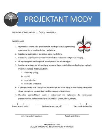 PROJEKTANT MODY SPRAWNOŚĆ DO STOPNIA - ĆWIK / PIONIERKA WYMAGANIA 1. Wymieni nazwiska kilku projektantów mody polskiej i zagranicznej oraz znane domy mody w Polsce i na świecie. 2. Przedstawi swoje zbiory projektów ubrań i wykrojów. 3. Przedstawi zaprojektowany samodzielnie strój na zbiorce zastępu lub drużyny. 4. W wybrany przez siebie sposób poda i przedstawi informację o: 5. Przedstawi w zastępie lub drużynie sposoby doboru dodatków do konkretnych ubrań. Dobrał dodatki do 4 różnych ubrań: a. do szkoly i pracy, b. na bal, c. na wycieczkę, d. na ważne spotkanie. 6. Czyta systematycznie czasopisma prezentujące aktualne trędy w modzie.Wybrane przez siebie czasopismo zaprezentuje na zbioce zastępu lub drużyny. 7. Osobiście zaprojektował stroje i nadzorował ich wykonanie do wskazanego przedstawienia, pokazu w szczepie lub podczas kolonii, obozu, biwaku. _____|_____|_____ Data otwarcia próby ________________________________ Zdobywający sprawność __________________________________ Imię i nazwisko instruktora _____|_____|_____ Data zamknięcia próby __________________________________ Podpis instruktora REFERAT HARCERSKI ZWIĄZEK HARCERSTWA RZECZYPOSPOLITEJ W KANADZIE