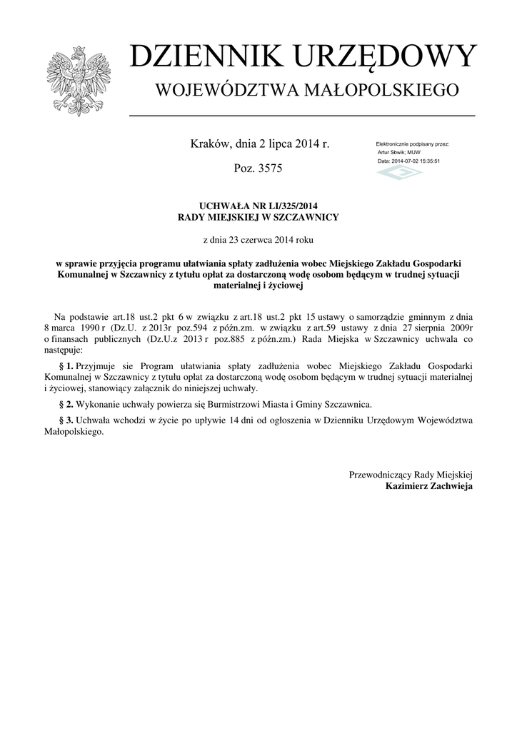 DZIENNIK URZĘDOWY WOJEWÓDZTWA MAŁOPOLSKIEGO Kraków, dnia 2 lipca 2014 r. Elektronicznie podpisany przez: Artur Słowik; MUW Data: 2014-07-02 15:35:51 Poz. 3575 UCHWAŁA NR LI/325/2014 RADY MIEJSKIEJ W SZCZAWNICY z dnia 23 czerwca 2014 roku w sprawie przyjęcia programu ułatwiania spłaty zadłużenia wobec Miejskiego Zakładu Gospodarki Komunalnej w Szczawnicy z tytułu opłat za dostarczoną wodę osobom będącym w trudnej sytuacji materialnej i życiowej Na podstawie art.18 ust.2 pkt 6 w związku z art.18 ust.2 pkt 15 ustawy o samorządzie gminnym z dnia 8 marca 1990 r (Dz.U. z 2013r poz.594 z późn.zm. w związku z art.59 ustawy z dnia 27 sierpnia 2009r o finansach publicznych (Dz.U.z 2013 r poz.885 z późn.zm.) Rada Miejska w Szczawnicy uchwala co następuje: § 1. Przyjmuje sie Program ułatwiania spłaty zadłużenia wobec Miejskiego Zakładu Gospodarki Komunalnej w Szczawnicy z tytułu opłat za dostarczoną wodę osobom będącym w trudnej sytuacji materialnej i życiowej, stanowiący załącznik do niniejszej uchwały. § 2. Wykonanie uchwały powierza się Burmistrzowi Miasta i Gminy Szczawnica. § 3. Uchwała wchodzi w życie po upływie 14 dni od ogłoszenia w Dzienniku Urzędowym Województwa Małopolskiego. Przewodniczący Rady Miejskiej Kazimierz Zachwieja Dziennik Urzędowy Województwa Małopolskiego –2– Poz. 3575 Załącznik - PROGRAM do Uchwały Nr LI/325/2014 Rady Miejskiej w Szczawnicy z dnia 23 czerwca 2014 r. Program ułatwiania spłaty zadłużenia wobec Miejskiego Zakładu Gospodarki Komunalnej w Szczawnicy z tytułu opłat za dostarczoną wodę osobom będącym w trudnej sytuacji materialnej i życiowej. § 1. W celu ułatwienia osobom (dłużnikom) posiadającym umowę o zaopatrzenie w wodę z Miejskim Zakładem Gospodarki Komunalnej (MZGK) w Szczawnicy, będącym w trudnej sytuacji materialnej i życiowej spłaty należności z tytułu zaległości za dostarczoną przez MZGK wodę przyjmuje się możliwość odpracowania należności dla MZGK w Szczawnicy w formie świadczenia ekwiwalentnego, zwanego dalej świadczeniem. § 2. 1. Dłużnik znajdujący się w trudnej sytuacji materialnej i życiowej składa wniosek do Dyrektora MZGK w Szczawnicy wg wzoru stanowiącego załącznik Nr 1 do niniejszego Programu. 2. Po uzyskaniu zgody MZGK w Szczawnicy strony podpisują umowę, której wzór stanowi załącznik nr 2 do niniejszego Programu. § 3. Przedmiotem umowy mogą być uzgodnione wyłącznie z przedstawicielami MZGK w Szczawnicy prace porządkowe i usługowe świadczone na rzecz MZGK w Szczawnicy, które nie są realizowane w ramach zawartych umów z firmami wykonawczymi. § 4. Nadzór nad wykonaniem niniejszego Programu sprawuje Burmistrz Miasta i Gminy Szczawnica. § 5. Program wchodzi w życie 14 dni po opublikowaniu w Dzienniku Urzędowym Województwa Małopolskiego. Przewodniczący Rady Miejskiej Kazimierz Zachwieja Dziennik Urzędowy Województwa Małopolskiego –3– Poz. 3575 Załącznik Nr 1 do Programu ułatwiania spłaty zadłużenia wobec Miejskiego Zakładu Gospodarki Komunalnej w Szczawnicy Wniosek o odpracowanie zaległości z tytułu opłat za dostarczoną wodę Miejski Zakład Gospodarki Komunalnej w Szczawnicy Zawodzie 19 c 34 - 460 SZCZAWNICA 1. Imię i Nazwisko: ………………………………………………………………………………… 2. Data urodzenia: …………………………………………………………………………………… 3. PESEL: …………………………………………………………………………………………… 4. Miejsce zamieszkania: …………………………………………………....................................… 5. Telefon kontaktowy: ………………………………………………………..............................….. 6. Email: ……………………………………………………………………………………………… 7. Wniosek dotyczy odpracowania zaległości z tytułu opłat za dostarczoną wodę w formie: - sprzątanie ulic i chodników* - prace porządkowe terenów zielonych* - ………………………………………………………………..* - inne (malowanie bram, drzwi, ogrodzeń …………………………………………………………..)* (*niepotrzebne skreślić) 8. Dokumenty dotyczące sytuacji osobistej i życiowej dłużnika stanowiące załączniki do wniosku np. zaświadczenie z Powiatowego Urzędu Pracy, MOPS, PIT za rok ubiegły itp. Oświadczam, że dane zawarte w pkt. 1- 4 są zgodne z dokumentem tożsamości: seria …………. numer …………………… wydanym przez ………………………………………………………………………………. Szczawnica, dn. …………………., …………………………………………………… (czytelny podpis wnioskodawcy) Przewodniczący Rady Miejskiej Kazimierz Zachwieja Dziennik Urzędowy Województwa Małopolskiego –4– Poz. 3575 Załącznik Nr 2 do Programu ułatwiania spłaty zadłużenia wobec Miejskiego Zakładu Gospodarki Komunalnej w Szczawnicy Umowa nr ……………………. (ekwiwalentne) z dnia ………………………….… o świadczenie zamienne zawarta pomiędzy: Gminą Szczawnica – Miejskim Zakładem Gospodarki Komunalnej w Szczawnicy z siedzibą w Szczawnicy (34-460), ul. Zawodzie 19 C reprezentowaną przez: Dyrektora – Józefę Kanclerską zwaną w dalszej części umowy Wierzycielem, a Panią/em ……………………………………………………………………………………………………… Zamieszkałą/ym 34-460 Szczawnica, ul. ……………………………........................................................… zwanym w dalszej części umowy Dłużnikiem, o następującej treści: § 1. Umowa zostaje zawarta pomiędzy stronami w wyniku wzajemnych uzgodnień w zakresie wykonania świadczenia zamiennego celem zwolnienia Dłużnika z