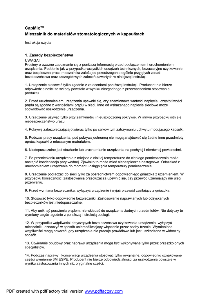 CapMix™ Mieszalnik do materiałów stomatologicznych w kapsułkach Instrukcja użycia 1. Zasady bezpieczeństwa UWAGA! Prosimy o uważne zapoznanie się z poniższą informacją przed podłączeniem i uruchomieniem urządzenia. Podobnie jak w przypadku wszystkich urządzeń technicznych, bezawaryjne użytkowanie oraz bezpieczna praca mieszalnika zależą od przestrzegania ogólnie przyjętych zasad bezpieczeństwa oraz szczegółowych zaleceń zawartych w niniejszej instrukcji. 1. Urządzenie stosować tylko zgodnie z zaleceniami poniższej instrukcji. Producent nie bierze odpowiedzialności za szkody powstałe w wyniku niezgodnego z przeznaczeniem stosowania produktu. 2. Przed uruchomieniem urządzenia upewnić się, czy znamionowe wartości napięcia i częstotliwości prądu są zgodne z wartościami prądu w sieci. Inne od wskazanego napięcie sieciowe może spowodować uszkodzenie urządzenia. 3. Urządzenie używać tylko przy zamkniętej i nieuszkodzonej pokrywie. W innym przypadku istnieje niebezpieczeństwo urazu. 4. Pokrywę zabezpieczającą otwierać tylko po całkowitym zatrzymaniu uchwytu mocującego kapsułki. 5. Podczas pracy urządzenia, pod pokrywą ochronną nie mogą znajdować się żadne inne przedmioty oprócz kapsułki z mieszanym materiałem. 6. Niedopuszczalne jest stawianie lub uruchamianie urządzenia na pochyłej i nierównej powierzchni. 7. Po przeniesieniu urządzenia z miejsca o niskiej temperaturze do ciepłego pomieszczenia może nastąpić kondensacja pary wodnej. Zjawisko to może mieć niebezpieczne następstwa. Odczekać z uruchomieniem urządzenia do momentu osiągnięcia temperatury pomieszczenia. 8. Urządzenie podłączać do sieci tylko za pośrednictwem odpowiedniego gniazdka z uziemieniem. W przypadku konieczności zastosowania przedłużacza upewnić się, czy przewód uziemiający nie uległ przerwaniu. 9. Przed wymianą bezpiecznika, wyłączyć urządzenie i wyjąć przewód zasilający z gniazdka. 10. Stosować tylko odpowiednie bezpieczniki. Zastosowanie naprawianych lub odzyskanych bezpieczników jest niedopuszczalne. 11. Aby uniknąć porażenia prądem, nie wkładać do urządzenia żadnych przedmiotów. Nie dotyczy to wymiany części zgodnie z poniższą instrukcją obsługi. 12. W przypadku wątpliwości dotyczących bezpieczeństwa użytkowania urządzenia, wyłączyć mieszalnik i oznaczyć w sposób uniemożliwiający włączenie przez osoby trzecie. Wymienione wątpliwości mogą powstać, gdy urządzenie nie pracuje prawidłowo lub jest uszkodzone w widoczny sposób. 13. Otwieranie obudowy oraz naprawy urządzenia mogą być wykonywane tylko przez przeszkolonych specjalistów. 14. Podczas naprawy i konserwacji urządzenia stosować tylko oryginalne, odpowiednio oznakowane części wymienne 3M ESPE. Producent nie bierze odpowiedzialności za uszkodzenia powstałe w wyniku zastosowania innych niż oryginalne części. PDF created with pdfFactory trial version www.pdffactory.com 15. Nie używać urządzenia przy wyłączonych zabezpieczeniach (np. po wyłączeniu automatycznego wyłącznika na pokrywie zabezpieczającej). Nieprzestrzeganie zasad bezpieczeństwa może spowodować poważny uraz i powoduje utratę gwarancji oraz rękojmi. 16. Chronić urządzenie przed rozpuszczalnikami, łatwopalnymi cieczami oraz silnymi źródłami ciepła. Wymienione elementy mogą uszkodzić obudowę z tworzywa sztucznego. 17. Podczas czyszczenia urządzenia uważać, aby środki czyszczące nie dostały się do wnętrza, ponieważ może to spowodować spięcie lub nieprawidłowe funkcjonowanie urządzenia. 18. Stosując kapsułki z amalgamatem należy sprawdzić ich szczelność. Rtęć z nieszczelnej kapsułki może zanieczyścić urządzenie. Naprawa zanieczyszczonego urządzenia nie jest możliwa. Zanieczyszczone urządzenie poddać utylizacji zgodnie z obowiązującymi przepisami! Dodatkowe ostrzeżenia dotyczące pierwszej pomocy, postępowania w przypadku spowodowania niezamierzonego przecieku, posługiwania się, przechowywania, ograniczeń ekspozycji i zalecanej odzieży ochronnej znajdują się na karcie bezpieczeństwa stosowanego amalgamatu. 2. Opis produktu Mieszalnik CapMix, prod. przez 3M ESPE służy do mieszania stomatologicznych materiałów do wypełnień i cementów w kapsułkach. Pożądane czasy mieszania można zaprogramować w programach »P1«-»P4«. Dodatkowo, dostępne są dwa stałe, fabrycznie zaprogramowane czasy mieszania: »10sek.« i »15sek.« Instrukcję użycia przechowywać przez cały czas stosowania urządzenia 3. Zastosowanie Mieszanie materiałów stomatologicznych w kapsułkach o wadze maksymalnej do 7 gramów. Nie wolno stosować kapsułek o wadze powyżej 7 gramów. 4. Informacje techniczne Napęd: Silnik na łożyskach kulkowych z wbudowanym automatycznym wyłącznikiem zabezpieczającym przed przegrzaniem. Rodzaj pracy: Praca krótkotrwała, Po 1 minucie pracy należy odczekać 7 minut. Sterowanie: Mikroprocesor, duża dokładność czasu mieszania dzięki zastosowaniu zegara kwarcowego. Uchwyt kapsułki: Samozaciskowy. Kapsułki: Kapsułki o maksymalnej średnicy 19 mm, maksymalnej długości 58 mm (długość max bez końcówki 38 mm)i wadze do 7g. Obudowa: Obudowa i pokrywa wykonane z tworzywa sztucznego o dużej wytrzymałości na uszkodzenia. Częstotliwość: 4650 drgań na minutę przy kapsułkach 7g Zalecana temp. pracy: 18°C ... 40°C/64°F ... n/a Wilgotność względna powietrza: maksymalnie 80% przy 31°C maksymalnie 50% przy 40°C. Napięcie sieciowe: 100V, 120V, 230V; 50/60Hz, ustawioną fabrycznie wartość napięcia podano na tabliczce znamionowej. Pobór mocy: 330 VA PDF created with pdfFactory trial version www.pdffactory.com Bezpieczniki: 230 V: 2A 120 V: 3.2A Wymiary: 195 x 160 x 195 mm (szerokość/wysokość/głębokość) Waga: 3750 g 5. Instalacja Przed rozpoczęciem pracy usunąć zabezpieczenie transportowe. Podłączyć CapMix do sieci i wcisnąć włącznik zasilania 