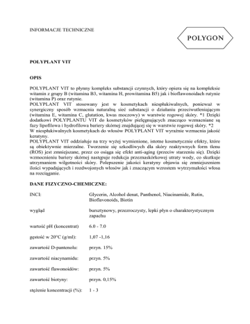 INFORMACJE TECHNICZNE POLYPLANT VIT OPIS POLYPLANT VIT to płynny kompleks substancji czynnych, który opiera się na kompleksie witamin z grupy B (witamina B3, witamina H, prowitamina B5) jak i bioflawonoidach rutynie (witamina P) oraz rutynie. POLYPLANT VIT stosowany jest w kosmetykach niespłukiwalnych, ponieważ w synergiczny sposób wzmacnia naturalną sieć substancji o działaniu przeciwutleniającym (witamina E, witamina C, glutation, kwas moczowy) w warstwie rogowej skóry. *1 Dzięki dodatkowi POLYPLANTU VIT do kosmetyków pielęgnujących znacząco wzmacniane są fazy lipofilowa i hydrofilowa bariery skórnej znajdującej się w warstwie rogowej skóry. *2 W niespłukiwalnych kosmetykach do włosów POLYPLANT VIT wyraźnie wzmacnia jakość keratyny. POLYPLANT VIT oddziałuje na trzy wyżej wymienione, istotne kosmetycznie efekty, które są obiektywnie mierzalne. Tworzenie się szkodliwych dla skóry reaktywnych form tlenu (ROS) jest zmniejszane, przez co osiąga się efekt anti-aging (przeciw starzeniu się). Dzięki wzmocnieniu bariery skórnej następuje redukcja przeznaskórkowej utraty wody, co skutkuje utrzymaniem wilgotności skóry. Polepszenie jakości keratyny objawia się zmniejszeniem ilości wypadających i rozdwojonych włosów jak i znaczącym wzrostem wytrzymałości włosa na rozciąganie. DANE FIZYCZNO-CHEMICZNE: INCI: Glycerin, Alcohol denat, Panthenol, Niacinamide, Rutin, Bioflavonoids, Biotin wygląd bursztynowy, przezroczysty, lepki płyn o charakterystycznym zapachu wartość pH (koncentrat) 6.0 - 7.0 gęstość w 20°C (g/ml): 1,07 -1,16 zawartość D-pantenolu: przyn. 15% zawartość niacynamidu: przyn. 5% zawartość flawonoidów: przyn. 5% zawartość biotyny: przyn. 0,15% stężenie koncentracji (%): 1-3 INFORMACJE TECHNICZNE konserwanty brak trwałość POLYPLANT VIT może być przechowywany w zamkniętych pojemnikach w temperaturze pokojowej bez znaczącej utraty efektywności działania. Mogą się przy tym wytrącać śladowe ilości osadów, które jednak już po lekkim potrząśnięciu z powrotem przechodzą do roztworu. Efekt ten nie ma wpływu na biologiczne działanie produktu i nie jest dowodem spadku jakości. POLYPLANT VIT można na krótko ogrzać do 85°C (do 1h). W temperaturze poniżej 10°C produkt może stać się mętny. Można go przywrócić do stanu pierwotnego poprzez lekkie podgrzanie (maks. 40°C) i poruszenie bez spadku jakości WŁASNOŚCI SPECJALNE: Brak nicynamidu (witaminy B3) ma poważne konsekwencje dla skóry. Od dziesięcioleci znana medycynie i dobrze opisana jest pelagra (szorstka skóra). Brak nicynamidu objawia się m.in. zapaleniem skóry oraz podwyższoną pigmentacją. Występują one przede wszystkim na tych partiach skóry, które wystawione są na promieniowanie słoneczne. Niacynamid to ważny prekursor koenzymów NADH i NADPH, które odgrywają ważną rolę w metabolizmie komórki. Koenzymy te niszczone są z wiekiem, zaś niacynamid naniesiony z zewnątrz na skórę wydaje się regenerować te układy. Badania in vitro wykazały znaczący wzrost zawartości NADH poprzez dodatek niacynamidu do postarzonych komórek skóry. Wzmaga on syntezę lipidów w warstwie rogowej skóry, co łączy się ze zmniejszeniem przeznaskórkowej utraty wody. Uszkodzenia bariery przez laurylosiarczan sodu mogą być znacząco niwelowane przez niacynamid. Zwiększa się także ilość białek naskórkowych. *2 Z tego powodu niacynamid stosowany jest w kremach do twarzy, które wygładzają skórę oraz korzystnie wpływają na pigmentację. Nowsze testy potwierdzają działanie niacynamidu; powierzchnia skóry wygładza się i stabilizuje, a nieregularna pigmentacja ulega redukcji. Dlatego też POLYPLANT VIT to idealny kompleks substancji czynnych do ochrony skóry przed stresem oksydacyjnym i przeznaskórkową utratą wody jak też do polepszenia jakości keratyny i przez to wsparcie wytrzymałości włosów na rozciąganie. INFORMACJE TECHNICZNE WDRAŻANIE: POLYPLANT VIT jest rozpuszczalny w wodzie i mieszaninie woda/etanol. Tworzą się przy tym cytrynowożółte roztwory. POLYPLANT VIT rozpuszcza się także do 3% w następujących mieszaninach: 1. woda/betaina (80/20) 2. woda/siarczan eteru (WAS 28%) (80/20) 3. woda/ siarczan eteru (WAS 28%)/betaina (80/10/10) 4. woda/etanol (80/20) Dzięki swojej dobrej trwałości temperaturowej POLYPLANT VIT można także w lekko podwyższonej temperaturze łatwo wprowadzić do fazy tłuszczowej formuły kosmetycznej. Zalecane stężenie aplikacji leży w zakresie 1 - 3%. Przykłady Odżywki do włosów dla suchej skóry głowy i suchych włosów Szampony do włosów suchych Płukanki do włosów suchych Płyny pod prysznic utrzymujące naturalną wilgotność skóry Balsamy do skóry suchej i napiętej Kremy na noc (przeciw starzeniu się) Kremy na dzień do skóry suchej i pękającej Dodatki do kąpieli 1 – 2% 1 – 2% 2 – 3% 1 – 3% 2 – 3% 2 – 3% 2 – 3% 1 – 2% TOKSYKOLOGIA: 1.D-pantenol *5, *6 toksyczność ostra LD50 (doustnie): pierwotne podrażnienie skóry: podrażnienie oczu: przy wdychaniu: uczulenie: > 10.000 mg/kg (szczury, OECD 401) brak (króliki, OECD 404) brak (króliki, OECD 405) brak podrażnienia (człowiek) nie uczulający (OECD 406) D-pantenol jest prowitaminą kwasu pantenowego (witaminy B5) i odgrywa ważną rolę podczas przemiany materii w ludzkim organizmie. INFORMACJE TECHNICZNE 2.Niacynamid podrażnienie skóry podrażnienie błon śluzowych/oczu: potencjał uczuleniowy: toksyczność podprzewlekła: nie drażniący (test Draize’a) drażniący (test Draize’a), jako sucha masa nie uczulający (test maksymalizacji) nie mutagenny podczas testów krótkoterminowych (test Amesa) Rozpuszczalna w wodzie witamina B3 występuje w wielu środkach spożywczych i od dziesięcioleci używana jest jako dodatek do żywności. Maksymalna doustna dawka, która uchodzi za „pewną” dla osoby dorosłej, ustalona została przez „Food and Nutrition Boar
