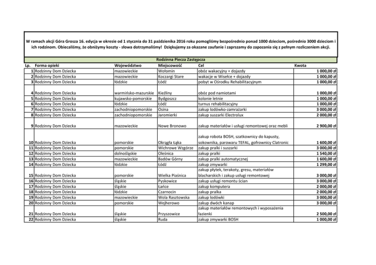W ramach akcji Góra Grosza 16. edycja w okresie od 1 stycznia do 31 paździenika 2016 roku pomogliśmy bezpośrednio ponad 1000 dzieciom, pośrednio 3000 dzieciom i ich rodzinom. Obiecaliśmy, że obniżymy koszty - słowa dotrzymaliśmy! Dziękujemy za okazane zaufanie i zaprszamy do zapozania się z pełnym rozliczeniem akcji. Lp. Forma opieki 1 Rodzinny Dom Dziecka 2 Rodzinny Dom Dziecka 3 Rodzinny Dom Dziecka 4 5 6 7 8 Rodzinny Dom Dziecka Rodzinny Dom Dziecka Rodzinny Dom Dziecka Rodzinny Dom Dziecka Rodzinny Dom Dziecka 9 Rodzinny Dom Dziecka Województwo mazowieckie mazowieckie łódzkie Rodzinna Piecza Zastępcza Miejscowość Cel Wołomin obóz wakacyjny + dojazdy Koczargi Stare wakacje w Wisełce + dojazdy Łódź pobyt w Ośrodku Rehabilitacyjnym 1 000,00 zł 1 000,00 zł 1 000,00 zł warmińsko-mazurskie kujawsko-pomorskie łódzkie zachodniopomorskie zachodniopomorskie Kieźliny Bydgoszcz Łódź Osina Jaromierki obóz pod namiotami kolonie letnie turnus rehabilitacyjny zakup lodówko-zamrażarki zakup suszarki Electrolux 1 000,00 zł 1 000,00 zł 1 000,00 zł 3 000,00 zł 2 000,00 zł mazowieckie Nowe Bronowo zakup materiałów i usługi remontowej oraz mebli 2 900,00 zł 10 11 12 13 14 Rodzinny Dom Dziecka Rodzinny Dom Dziecka Rodzinny Dom Dziecka Rodzinny Dom Dziecka Rodzinny Dom Dziecka pomorskie pomorskie dolnośląskie mazowieckie łódzkie Okrągła Łąka Wichrowe Wzgórze Oleśnica Badów Górny Łódź 15 16 17 18 19 20 Rodzinny Dom Dziecka Rodzinny Dom Dziecka Rodzinny Dom Dziecka Rodzinny Dom Dziecka Rodzinny Dom Dziecka Rodzinny Dom Dziecka pomorskie śląskie śląskie łódzkie mazowieckie pomorskie Wielka Piaśnica Pyskowice Łańce Czarnocin Wola Rasztowska Wejherowo śląskie śląskie Przyszowice Ruda 21 Rodzinny Dom Dziecka 22 Rodzinny Dom Dziecka Kwota zakup robota BOSH, szatkownicy do kapusty, sokownika, parowaru TEFAL, gofrownicy Clatronic zakup pralki i suszarki zakup pralki zakup pralki automatycznej zakup zmywarki zakup płytek, terakoty, gresu, materiałów blacharskich i zakup usługi remontowej zakup usługi remontu ścian zakup komputera zakup pralka zakup lodówki zakup dwóch kanap zakup materiałów remontowych i wyposażenia łazienki zakup zmywarki BOSH 1 600,00 zł 3 000,00 zł 1 540,00 zł 1 600,00 zł 1 299,00 zł 3 000,00 zł 3 000,00 zł 2 000,00 zł 2 000,00 zł 3 000,00 zł 3 000,00 zł 2 500,00 zł 1 000,00 zł 23 24 25 26 Rodzinny Dom Dziecka Rodzinny Dom Dziecka Rodzinny Dom Dziecka Rodzinny Dom Dziecka pomorskie wielkopolskie kujawsko-pomorskie śląskie Zblewo Nowy Folwark Dobrcz Łęg 27 28 29 30 31 Rodzinny Dom Dziecka Rodzinny Dom Dziecka Rodzinny Dom Dziecka Rodzinny Dom Dziecka Rodzinny Dom Dziecka śląskie pomorskie śląskie mazowieckie śląskie Racibórz Gdynia Krzyżanowice Wołomin Kuźnia Raciborska śląskie łódzkie 32 Rodzinny Dom Dziecka 33 Rodzinny Dom Dziecka Zawodowa Specjalistyczna Rodzina 34 Zastępcza Zawodowa Specjalistyczna Rodzina 35 Zastępcza Zawodowa Specjalistyczna Rodzina 36 Zastępcza Zawodowa Specjalistyczna Rodzina 37 Zastępcza Zawodowa Specjalistyczna Rodzina 38 Zastępcza Zawodowa Specjalistyczna Rodzina 39 Zastępcza Zawodowa Specjalistyczna Rodzina 40 Zastępcza Zawodowa Specjalistyczna Rodzina 41 Zastępcza Zawodowa Specjalistyczna Rodzina 42 Zastępcza Zawodowa Specjalistyczna Rodzina 43 Zastępcza Zawodowa Specjalistyczna Rodzina 44 Zastępcza 2 970,00 zł 1 700,00 zł 2 500,00 zł 3 000,00 zł Sosnowiec Łódź zakup usług remontowych oraz wyposażenia domu zakup suszarko-pralki zakup lodówko-zamrażarki zakup pralki i suszarki bębnowej zakup kafelków, drzwi z ościeżnicą oraz usługi remontowej montażu kafelków zakup stołu, regałów i krzeseł zakup pralki i suszarki zakup dwóch łóżek z materacami zakup szafy zakup materiałów i usług remontowych pokoju sypialnego zakup pralko-suszarki i kabiny prysznicowej łódzkie Łódź turnus rehabilitacyjny 1 000,00 zł łódzkie Łódź 2 974,00 zł warmińsko-mazurskie Olsztyn zakup i montaż ogrodzenia oraz kuchni gazowej zakup balustrady, wykładziny i materiałów wykończeniowych pomorskie Sierakowice zakup pieca co i kształtek do podłączenia 3 000,00 zł wielkopolskie Książ Wielkopolski zakup zmywarki i lodówki 3 000,00 zł łódzkie Łódź remont pokoju 2 000,00 zł łódzkie Huta Janowska zakup stołu, krzeseł i łóżka 3 000,00 zł pomorskie Bytów zakup łóżka 1 800,00 zł małopolskie Lachowice zakup mebli kuchennych 2 400,00 zł mazowieckie Radom zakup materiałów i usługi remontu podłóg 2 999,00 zł wielkopolskie Objezierze zakup lodówko-zamrażarki 1 249,00 zł 3 000,00 zł 2 000,00 zł 3 000,00 zł 1 200,00 zł 3 000,00 zł 3 000,00 zł 2 800,00 zł 3 000,00 zł Zawodowa Specjalistyczna Rodzina 45 Zastępcza Zawodowa Rodzina Zastępcza o 46 charakterze Pogotowia Rodzinnego Zawodowa Rodzina Zastępcza o 47 charakterze Pogotowia Rodzinnego Zawodowa Rodzina Zastępcza o 48 charakterze Pogotowia Rodzinnego Zawodowa Rodzina Zastępcza o 49 charakterze Pogotowia Rodzinnego Zawodowa Rodzina Zastępcza o 50 charakterze Pogotowia Rodzinnego Zawodowa Rodzina Zastępcza o 51 charakterze Pogotowia Rodzinnego Zawodowa Rodzina Zastępcza o 52 charakterze Pogotowia Rodzinnego Zawodowa Rodzina Zastępcza o 53 charakterze Pogotowia Rodzinnego Zawodowa Rodzina Zastępcza o 54 charakterze Pogotowia Rodzinnego Zawodowa Rodzina Zastępcza o 55 charakterze Pogotowia Rodzinnego Zawodowa Rodzina Zastępcza o 56 charakterze Pogotowia Rodzinnego Zawodowa Rodzina Zastępcza o 57 charakterze Pogotowia Rodzinnego Zawodowa Rodzina Zastępcza o 58 charakterze Pogotowia Rodzinnego Zawodowa Rodzina Zastępcza o 59 charakterze Pogotowia Rodzinnego Zawodowa Rodzina Zastępcza o 60 charakterze Pogotowia Rodzinnego Zawodowa Rodzina Zastępcza o 61 charakterze Pogotowia Rodzinnego Zawodowa Rodzina Zastępcza o 62 charakterze Pogotowia Rodzinnego zakup materiałów remontowych i wyposażenia pokoju 2 000,00 zł warmińsko-mazurskie Ni