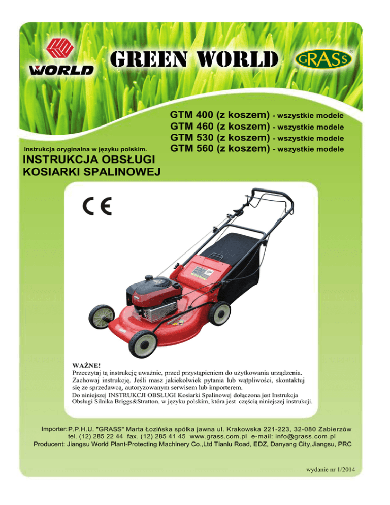 Instrukcja kosiarki GTM530 Instrukcja oryginalna w języku polskim. GTM 400 (z koszem) - wszystkie modele GTM 460 (z koszem) - wszystkie modele GTM 530 (z koszem) - wszystkie modele GTM 560 (z koszem) - wszystkie modele INSTRUKCJA OBSŁUGI KOSIARKI SPALINOWEJ WAŻNE! Przeczytaj tą instrukcję uważnie, przed przystąpieniem do użytkowania urządzenia. Zachowaj instrukcję. Jeśli masz jakiekolwiek pytania lub wątpliwości, skontaktuj się ze sprzedawcą, autoryzowanym serwisem lub importerem. Do niniejszej INSTRUKCJI OBSŁUGI Kosiarki Spalinowej dołączona jest Instrukcja Obsługi Silnika Briggs&Stratton, w języku polskim, która jest częścią niniejszej instrukcji. Importer: Producent: Jiangsu World Plant-Protecting Machinery Co.,Ltd Tianlu Road, EDZ, Danyang City,Jiangsu, PRC wydanie nr 1/2014 SPIS TREŚCI ROZDZIAŁ 1: ZASADY BEZPIECZNEJ OBSŁUGI ...................….…………… ROZDZIAŁ 2: ODSZUKIWANIE NUMERU MODELU ………….……………….. ROZDZIAŁ 3: KONSULATACJE Z DOSTAWCĄ ……………….………………. ROZDZIAŁ 4: INSTRUKCJE ROZPAKOWYWANIA …………….……………… ROZDZIAŁ 5: INSTRUKCJE MONTAŻU ........ ……….......……….…………….. ROZDZIAŁ 6: ELEMENTY STEROWANIA ………………………………………. ROZDZIAŁ 7: OBSŁUGA …………………………………………………………… ROZDZIAŁ 8: REGULACJE ………………………………………………………… ROZDZIAŁ 9: OBSŁUGA KONSERWACYJNA ………………………………….. ROZDZIAŁ 10: SMAROWANIE …………………………………………………….. ROZDZIAŁ 11: PRZECHOWYWANIE PO SEZONIE ……………......………….. ROZDZIAŁ 12: WSKAZÓWKI USUWANIA NIESPRAWNOŚCI ……………….. ROZDZIAŁ 13: GWARANCJA ............................................................................ ROZDZIAŁ 14: POSTĘPOWANIE ZE ZUŻYTYMI MASZYNAMI, OCHRONA ŚRODOWISKA ........................................................ ROZDZIAŁ 15: WYKAZ PUNKTÓW SERWISOWYCH ....................................... ROZDZIAŁ 16: DANE TECHNICZNE ................................................................... 3 6 7 7 8 9 11 14 15 17 17 19 19 19 19 19 WSTĘP Dziękujemy za zakup spalinowej kosiarki do trawy marki Green World . Instrukcja Operatora przeznaczona jest do pomocy w bezpiecznym i niezawodnym użytkowaniu. PRZED PRZYSTĄPIENIEM DO PRACY NALEŻY GRUNTOWNIE PRZECZYTAĆ I ZROZUMIEĆ TĄ INSTRUKCJE. Dla zapewnienia długiej i niezawodnej pracy urządzeniem należy dbać o jej prawidłową obsługę oraz konserwacje zgodnie ze wskazówkami zawartymi w tej instrukcji. PRZEZNACZENIE KOSIARKI SPALINOWEJ Kosiarki spalinowe: GREEN WORLD GTM 400, 460 z silnikiem Briggs&Stratton serii 475 i Serii 500 przeznaczona jest do koszenia trawy w ogrodach przydomowych o powierzchni do 1200m2. samobieżna GREEN WORLD GTM530 oraz GTM560 z silnikiem Briggs&Stratton serii 675 lub serii 825 przeznaczona jest do koszenia trawy w ogrodach przydomowych o powierzchni do 2000m2. Jakiekolwiek próby modyfikacji lub adaptacji do innych celów są rzeczą niebezpieczną i zabronioną. Wykorzystywanie sprzętu niezgodnie z przeznaczeniem jest zabronione i powoduje utratę gwarancji. UWAGA Ilustracje w niniejszej instrukcji obsługi mają charakter poglądowy i w niektórych szczegółach mogą różnić się od rzeczywistego wyglądu urządzeń. ROZDZIAŁ 1: ZASADY BEZPIECZNEJ OBSŁUGI – ZNACZENIE SYMBOLI OSTRZEŻENIE: TEN SYMBOL OZNACZA WAŻNE INSTRUKCJE DOTYCZĄCE BEZPIECZEŃSTWA, KTÓRE, JEŻELI NIE BĘDĄ PRZESTRZEGANE, MOGĄ ZAGRAŻAĆ BEZPIECZEŃSTWU OSÓB I/LUB MAJĄTKU TWOJEGO I INNYCH. PRZED PRZYSTĄPIENIEM DO OBSŁUGI KOSIARKI DO TRAWY PRZECZYTAĆ WSZYSTKIE INSTRUKCJE ZAWARTE W TYM PODRĘCZNIKU I PRZESTRZEGAĆ ICH. NIEPRZESTRZEGANIE TYCH INSTRUKCJI MOŻE SPOWODOWAĆ OBRAŻENIA OSÓB. POKAZANY OBOK SYMBOL OZNACZA OSTRZEŻENIE. NIEBEZPIECZEŃSTWO: Kosiarka do trawy została zbudowana do pracy zgodnie z zasadami bezpiecznej obsługi podanymi w tym podręczniku. Jak w każdym urządzeniu mechanicznym, brak zachowania ostrożności lub błąd ze strony operatora może spowodować poważne obrażenia. Ta kosiarka do trawy może amputować ręce i stopy i wyrzucać przedmioty. Nieprzestrzeganie poniższych instrukcji bezpieczeństwa może spowodować poważne obrażenia lub śmierć. UWAGI OGÓLNE O OBSŁUDZE • • • • • • • • Przed przystąpieniem do montażu tej maszyny przeczytać uważnie wszystkie wskazówki dla użytkownika. Przed obsługą przeczytać, zrozumieć i przestrzegać wszystkich instrukcji znajdujących się na maszynie i w niniejszej instrukcji obsługi. Przed obsługą maszyny zapoznać się dokładnie z elementami sterowania i prawidłowym jej użytkowaniem. Przechowywać ten podręcznik w bezpiecznym miejscu dla przyszłego i regularnego korzystania oraz dla zamawiania części zamiennych. Kosiarka rotacyjna jest precyzyjnym urządzeniem mechanicznym, a nie zabawką. W związku z tym zawsze należy zachowywać wyjątkową ostrożność. Ta kosiarka do trawy została zaprojektowana do wykonywania jednego zadania: do ścinania trawy. Nie używać jej do żadnego innego celu. Dzieciom poniżej wieku 16 lat nigdy nie pozwalać obsługiwać kosiarki. Dzieci od wieku 16 lat powinny obsługiwać kosiarkę tylko pod ścisłym nadzorem rodziców. Pozwalać używać tej kosiarki tylko osobom odpowiedzialnym, które znają zasady bezpiecznej obsługi. Żadne osoby, a zwłaszcza dzieci i zwierzęta domowe nie powinny znajdować się w obszarze pracy kosiarki. Gdy takie osoby znajdą się w pobliżu kosiarki, zatrzymać silnik, by uniemożliwić obrażenia przez kontakt z nożem lub przez wyrzucane przedmioty. Chociaż miejsce pracy powinno być całkowicie oczyszczone od obcych przedmiotów, taki przedmiot mógł być przeoczony i mógłby zostać przypadkowo wyrzucony przez kosiarkę w przypadkowym kierunku i spowodować poważne 