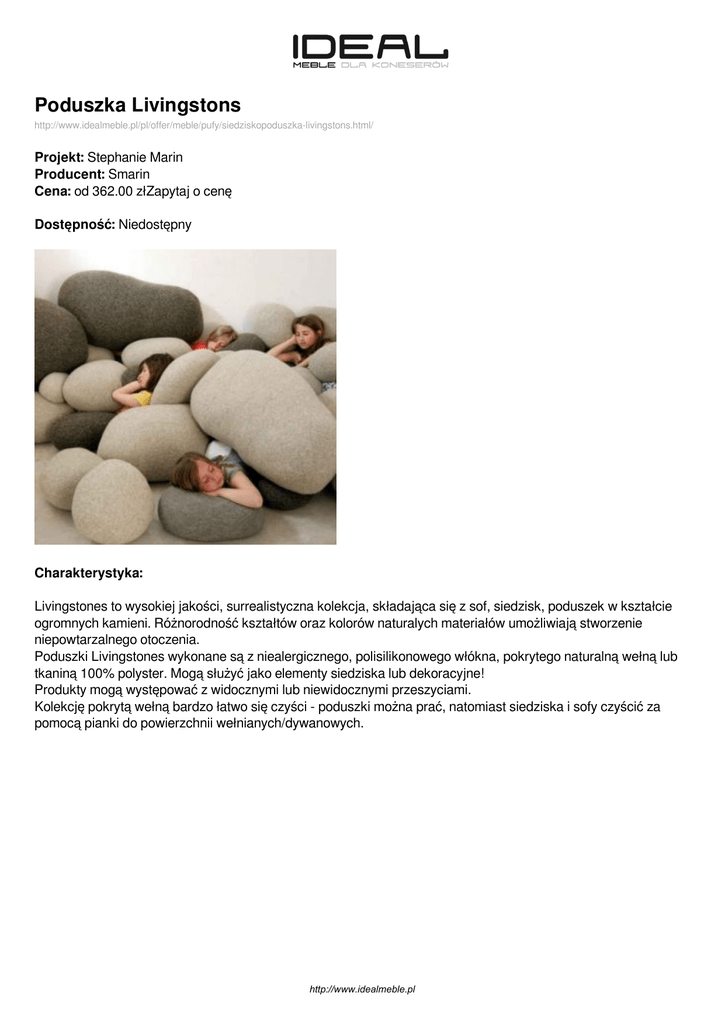 Poduszka Livingstons http://www.idealmeble.pl/pl/offer/meble/pufy/siedziskopoduszka-livingstons.html/ Projekt: Stephanie Marin Producent: Smarin Cena: od 362.00 złZapytaj o cenę Dostępność: Niedostępny Charakterystyka: Livingstones to wysokiej jakości, surrealistyczna kolekcja, składająca się z sof, siedzisk, poduszek w kształcie ogromnych kamieni. Różnorodność kształtów oraz kolorów naturalych materiałów umożliwiają stworzenie niepowtarzalnego otoczenia. Poduszki Livingstones wykonane są z niealergicznego, polisilikonowego włókna, pokrytego naturalną wełną lub tkaniną 100% polyster. Mogą służyć jako elementy siedziska lub dekoracyjne! Produkty mogą występować z widocznymi lub niewidocznymi przeszyciami. Kolekcję pokrytą wełną bardzo łatwo się czyści - poduszki można prać, natomiast siedziska i sofy czyścić za pomocą pianki do powierzchnii wełnianych/dywanowych. http://www.idealmeble.pl Dostępne wersje produktu: nazwa produktu warianty Siedzisko Livingstons 100% pure wool Carla cena 4339.00zł dostępne Niedostępny Poduszka Livingstons 100% pure wool Christophe 1033.00zł Niedostępny Poduszka Livingstons 100% pure wool Edgar 362.00zł Niedostępny Sofa Livingstons Enza 100% pure wool 23040.00zł Niedostępny Sofa Livingstons Gilda100% pure wool 24409.00zł Niedostępny Poduszka Livingstons 100% pure wool Herve 672.00zł Niedostępny Poduszka Livingstons 100% pure wool Jacques 827.00zł Niedostępny Poduszka Livingstons 100% pure wool Marc 1911.00zł Niedostępny Siedzisko Livingstons 100% pure wool Monica 8188.00zł Niedostępny Poduszka Livingstons 100% pure wool Pierre 465.00zł Niedostępny Siedzisko Livingstons 100% pure wool Rosa 6535.00zł Niedostępny Poduszka Livingstons 100% pure wool Xavier 982.00zł Niedostępny Poduszka Livingstons 100% pure wool Yann 387.00zł Niedostępny http://www.idealmeble.pl Zdjęcia produktu: http://www.idealmeble.pl Powered by TCPDF (www.tcpdf.org)
