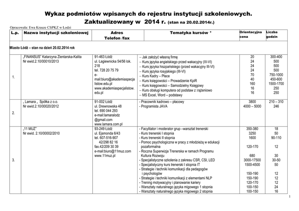 Wykaz podmiotów wpisanych do rejestru instytucji szkoleniowych. Zaktualizowany w 2014 r. (stan na 20.02.2014r.) Opracowała: Ewa Krauze CIiPKZ w Łodzi L.p. Nazwa instytucji szkoleniowej Adres Telefon /fax Tematyka kursów * Orientacyjna cena Liczba godzin Miasto Łódź – stan na dzień 20.02.2014 rok „FINANSUS” Katarzyna Zientarska-Kalita Nr ewid.2.10/00010/2013 91-463 Łódź ul. Łagiewnicka 54/56 lok. 218 tel. 728 20 75 79 email:biuro@akademiaspecja listow.edu.pl www.akademiaspecjalistow. edu.pl − Jak założyć własną firmę − Kurs języka angielskiego przed wakacyjny (III-VI) − Kurs języka hiszpańskiego (przed wakacyjny III-VI) − Kurs języka rosyjskiego (III-VI) − Kurs Kadry – Płace − Kurs księgowości – Prowadzenie KpiR − Kurs księgowości – Samodzielny Księgowy − Kurs obsługi komputera od podstaw z Crążeniowo − MS Excel, Word – podstawy „ Lamara „ Spółka z o.o. Nr ewid.2.10/00020/2012 91-002 Łódź ul. Drewnowska 48 tel. 690 044 293 e-mail:lamaralodz @gmail.com www.lamara.com.pl 93-249 Łódź ul. Ejsmonda 6/43 tel. 607-516-907 42/298 82 16 fax.42/209 30 39 e-mail:[email protected] www.11muz.pl - Pracownik kadrowo – płacowy - Programista JAVA 1. 2. „11 MUZ’’ Nr ewid. 2.10/00002/2010 3. - Facylitator i moderator grup –warsztat trenerski - Kurs trenerski I stopnia - Kurs trenerski II stopnia - Pomoc psychologiczna w pracy z młodzieżą w edukacji pozaformalna - Roczna Superwizja Trenerska w ramach Programu Kultura Rozwoju - Specjalistyczne szkolenia z zakresu CSR, CSI, LED - Specjalistyczny kurs trenerski I stopnia IT - Strategie i techniki komunikacji dla pedagogów i psychologów - Strategie i techniki komunikacji z elementami NLP - Trening motywacyjny i planowanie kariery - Warsztaty naturalnego języka migowego 1 stopnia - Warsztaty naturalnego języka migowego 2 stopnia 20 24 24 24 70 40 160 16 16 300-400 500 500 500 750-1000 450-600 1500-1700 250 250 3800 4000 – 5000 210 – 310 246 350-380 3250 1600 18 50 90-110 120-170 12 680 3000-17500 1500-4500 30 30-50 50 150-190 150-190 120-170 100-150 100-150 12 12 12 24 16 1 „ACADEMICUS” WŁODZIMIERZ BUDRYN Nr ewid.2.10/00091/2005 4. „Adad Systems” Anna Podsiadło Nr ewid.2.10/00091/2009 91-479 Łódź ul. Elizy Orzeszkowej 42 tel.(42) 616-03-13 e-mail: [email protected] 91-164 Łódź ul. Cebertowicza 51 tel. 42/ 611 58 00 fax. 42/ 611 58 59 e-mail:[email protected] 5. „ADITUS” s.c. Andrzej Kudzin, Katarzyna Kaczmarek Nr ewid.2.10/00076/2013 6. 91-211 Łódź ul. Rydzowa 22 tel. 42/ 288 11 77 e-mail:[email protected] - Warsztaty relaksacyjne - Warsztaty systemowego języka migowego 1 stopnia - Warsztaty systemowego języka migowego 2 stopnia - Warsztaty z zakresu tańca i rozwoju osobistego - Kurs fryzjerski - Kurs ogólnokosmetyczny - Kurs stylizacji paznokcia - Openoffice – operacje podstawowe - Crąże „Baza Prawa Polskiego” Prawo pracy w praktyce. Kluczowe problemy prawa pracy wraz ze skutecznymi sposobami ich rozwiązywania - MS Word – operacje podstawowe - MS Excel – operacje podstawowe - „Symfonia Kadry i Płace” Bieżąca praca z programem - „Symfonia Handel” Bieżąca praca z programem - „Symfonia Finanse i Księgowość” Bieżąca praca z programem - „Płatnik – rozliczenia ZUS” Jak poprawnie rozliczać firmę z ZUS? - „Puzzle/TaxPro” Bieżąca praca z programem - „Kadry – Specjalista ds. osobowych” Jak założyć i prowadzić dokumentację kadrową? - „Amortyzacja księgowa i podatkowa” Jak prawidłowo prowadzić środki trwałe? − APP- aktywne poszukiwanie pracy, warsztaty − Budowanie wizerunku firmy − Język angielski − Język niemiecki − Matematyka dla studentów − Obsługa klienta w biurze − Opiekun osób starszych − Pierwsze pomoc przedmedyczna − Prawo gospodarcze − Prawo pracy- praktyczne zagadnienia − Profesjonalna niania − Profesjonalny pracownik biurowy − Przedstawiciel handlowy- medyczny 60 100-150 100-150 190 3100 2700 450 4 24 16 8 180 180 12 880 14 2200 820 960 760 760 32 16 14 16 16 760 16 860 750 20 24 690 15 520 350 700 700 700 60 420 800 100 700 460 1500 650 600- 750 10 40 32 60 60 1 48 120 4 30 20 280 80 60-80 2 „AGENCJA REKLAMOWO-WYDAWNICZA VRZESIEŃ STUDIO” Andrzej Wrzesień Nr ewid.2.10/00033/2008 7. „Agencja Użytkowania i Poszanowania Energii” Sp. z o.o. Nr ewid.2.10/00007/2009 8. 9. „AKADIA” SPÓŁKA Z OGRANICZONĄ ODPOWIEDZIALNOŚCIĄ Nr ewid.2.10/00037/2009 „ALFA” KANCELARIA PODATKOWA, BIURO RACHUNKOWE MAGDALENA BORKOWSKA Nr ewid. 2.10/00011/2006 10. 11. „ALT” SYSTEMY INFORMATYCZNE BOŻENA KAROLEWSKA Nr ewid. 2.10/00191/2005 „AMA MOTO” PIOTR FIJAŁKOWSKI Nr ewid.2.10/00032/2014 12. 13. „AOK-DRIVER” Jarosław Studziński Nr ewid. 2.10/00093/2010 90-303 Łódź ul. Brzeźna 4 tel. 42/632-55-62 fax 42/6324642 e-mail:[email protected] 91-334 Łódź ul. Kwidzyńska 14 tel. 42/640 60 14 fax 42/640 65 38 e-mail:[email protected] www.auipe.pl 90-448 Łódź ul. Żwirki 1c/4 tel/fax. 42/636 88 33 e-mail:[email protected] 91-002 Łódź ul. Drewnowska 48 tel. (42)637 76 08; 633 06 47 fax (42)637 76 24 email:m.borkowska @biuroalfa.com 90-117 Łódź ul. Narutowicza 7/9, lok.331 tel./fax (42) 633 01 74 e-mail:[email protected] www.alt.com.pl - Kurs Rysunku Żurnalowego - Konstrukcja i modelowanie biustonoszy i bielizny osobistej damskiej - Konstrukcja i Modelowanie Form Odzieży Damskiej Lekkiej i Ciężkiej (zaawansowany) - Komputerowe wspomaganie przygotowania produkcji odzieży - Świadectwa charakterystyki energetycznej budynków dla osób ubiegających się o uzyskanie uprawnień - Świadectwa charakterystyki energetycznej budynków dla osób posiadających uprawnienia - Kurs audyty energetyczne budynków - Technologie energetyki odnawialnej dla instalatorów – szkolenia dla pracowników przedsiębiorstw branży budowlano-instalacyjnej( sanitarnej, grzewczej, klimatycznej) - Szkolenie techniki obsługi klienta - Kurs języka angi