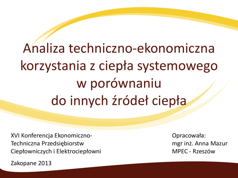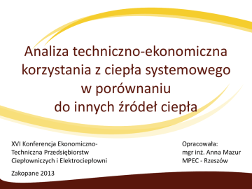 Analiza techniczno-ekonomiczna korzystania z ciepła systemowego w porównaniu do innych źródeł ciepła XVI Konferencja EkonomicznoTechniczna Przedsiębiorstw Ciepłowniczych i Elektrociepłowni Zakopane 2013 Opracowała: mgr inż. Anna Mazur MPEC - Rzeszów Wymagania techniczne różnych systemów ogrzewania • • • • • Odpowiednie pomieszczenie Magazynowanie paliwa Przewody spalinowe Obsługa urządzeń Konserwacja i naprawa urządzeń Oczekiwania odbiorcy względem systemu ogrzewania 1. Minimalizacja wymagań technicznych 2. Niezawodność: a) Komfort cieplny 24h/d b) Ciepła woda użytkowa 24h/d c) Szybkie przywrócenie do stanu prawidłowego w przypadku awarii 3. Konkurencyjna cena Ciepło systemowe Wymagania dla budynku Zminimalizowane wymagania dla budynku: • pomieszczenie węzła cieplnego z wentylacją, odwodnieniem i odpowiednim zamknięciem. Niepotrzebne: • składowanie opału • przewody spalinowe Niezawodność Niezawodność – prawdopodobieństwo spełnienia przez produkt określonych wymagań Pojęcia powiązane: Gotowość do spełnienia wymagań Obsługiwalność przez użytkownika Zapewnienie środków obsługi Usuwanie uszkodzeń Czynniki wpływające na niezawodność ciepła systemowego Niezawodność systemu ciepłowniczego: • Niezawodność dostaw (poza budynkiem): Wytwarzania Przesyłania • Niezawodność przetwarzania (w budynku) Węzeł cieplny – odpowiedni dobór urządzeń Niezawodność ciepła systemowego poza budynkiem – źródła ciepła i sieć ciepłownicza Niezawodność ciepła systemowego w budynku - węzeł cieplny Niezawodność przetwarzania Eliminacja ryzyka Urządzenia poza mieszkaniem odbiorcy, co eliminuje: • ryzyko uszkodzenia przez odbiorcę • ryzyko niewłaściwej eksploatacji • odpowiedzialność odbiorcy za naprawę i konserwację • konieczność obsługi przez odbiorcę Niezawodność przetwarzania Pomoc techniczna – usuwanie uszkodzeń Pomoc techniczna MPEC dostępna 24h/d : • • • • okresowe przeglądy bieżąca konserwacja krótki czas dojazdu do odbiorcy natychmiastowa naprawa w razie awarii Pogotowie ciepłownicze 993 Niezawodność- zestawienie Źródło ciepła Gaz ziemny piece kotły indywidualne Gaz ziemny kotłownia w budynku Olej opałowy kotłownia w budynku Ciepło systemowe węzeł cieplny w budynku Brak konieczności składowania opału Niepotrzebne przewody spalinowe Urządzenia poza mieszkaniem odbiorcy Pomoc techniczna 24h/d Niezawodność ciepła systemowego w parze z opłacalnością Koszty ogrzewania i eksploatacji dla różnych źródeł ciepła - porównanie Budynek mieszkalny wielorodzinny – 80kW Roczne zapotrzebowanie ciepła Q = 0,0036 * Qmax * sg * t * φ gdzie: Qmax = 80 kW – maksymalna obliczeniowa moc cieplna obiektu sg = 210 dni – długość sezonu grzewczego, przyjęto średnią z ostatnich lat t = 24 h – ilość godzin poboru ciepła w dobie φ = 0,45 – współczynnik temperaturowy dla średniej temperatury sezonu grzewczego z ostatnich lat +2°C Q = 0,0036 * 80 * 210 * 24 * 0,45 = 653,2 GJ/rok Rozpatrywane źródła ciepła • Kotłownia olejowa • Kotłownia gazowa • Indywidualne kotły gazowe • Ciepło systemowe Budynek mieszkalny wielorodzinny – 80kW Roczny koszt ogrzewania dla kotłowni olejowej K = B * C – roczny koszt ogrzewania B = 1000 * Q/(η * ρ * Wop) – ilość oleju opałowego gdzie: Q = 653,2 GJ/rok – roczne zapotrzebowanie ciepła η = 0,9 – sprawność kotłowni olejowej ρ = 0,83 kg/dm3 – gęstość oleju opałowego Wop = 42,8 MJ/kg – wartość opałowa oleju opałowego C = 4,03 zł/dm3 – średni koszt oleju opałowego w 2013r. B = 1000 * 653,2/(0,9 * 0,83 * 42,8) = 20 430 dm3/rok K = 20 430 * 4,03 = 82 333 zł/rok Budynek mieszkalny wielorodzinny – 80kW Roczny koszt ogrzewania dla kotłowni na gaz ziemny taryfa W-4, cennik 2013r. K = B*(C + Szs) + 12*(Sss + Sa) – roczny koszt ogrzewania B = 1000 * Q/(η * Wop) – ilość gazu ziemnego gdzie: Q = 653,2 GJ/rok – roczne zapotrzebowanie ciepła η = 0,9 – sprawność kotłowni gazowej Wop = 34,43 MJ/m3 – wartość opałowa gazu ziemnego C = 1,1109 zł/m3 – cena za paliwo gazowe Szs = 0,3535 zł/m3 – stawka zmienna opłaty sieciowej Sss = 246,35 zł/mc – stawka stała opłaty sieciowej Sa = 17,60 zł/mc – stawka opłaty abonamentowej B = 1000 * 653,2/(0,9 * 34,43) = 21 080 m3/rok K = 21 080*(1,1109 + 0,3535) + 12*(246,35 + 17,60) = 34 037 zł/rok Budynek mieszkalny wielorodzinny – 80kW Roczny koszt ogrzewania dla indywidualnych gazowych kotłów mieszkaniowych taryfa W-2, cennik 2013r. K1 = B1*(C + Szs) + 12*(Sss + Sa) – roczny koszt ogrzewania 1 mieszkania K = n*K1 – roczny koszt ogrzewania całego budynku B = 1000 * Q/(η * Wop) – zużycie gazu ziemnego B1 = B/n – zużycie gazu ziemnego na 1 mieszkanie gdzie: Q = 653,2 GJ/rok – roczne zapotrzebowanie ciepła n = 12 – ilość mieszkań w budynku η = 0,93 – sprawność indywidualnego kotła gazowego Wop = 34 ,43MJ/m3 – wartość opałowa gazu ziemnego C = 1,1250 zł/m3 – cena za paliwo gazowe Szs = 0,4823 zł/m3 – stawka zmienna opłaty sieciowej Sss = 11,72 zł/mc – stawka stała opłaty sieciowej Sa = 6,97 zł/mc – stawka opłaty abonamentowej B1 = 1000 * 653,2/(0,93 * 34,43 * 12) = 1 700 m3/rok K = 12*[1 700*(1,1250 + 0,4823) + 12*(11,72 + 6,97)] = 35 480 zł/rok Budynek mieszkalny wielorodzinny – 80kW Roczny koszt ogrzewania dla ciepła systemowego grupa P-1, cennik 2013r. K = Q*(C + Szs) + 12*Qmax(Sss + Sa) – roczny koszt ogrzewania gdzie: Q = 653,2 GJ/rok – roczne zapotrzebowanie ciepła C = 23,87 zł/GJ – cena za ciepło Szs = 12,12 zł/GJ – stawka opłaty zmiennej Sss = 2 207,70 zł/MW/mc – stawka opłaty stałej Sa = 5 762,69 zł/MW/mc – cena za zamówioną moc cieplną Qmax = 80 kW = 0,08 MW K = 653,2*(23,87 + 12,12) + 12*0,08*(2 207,70 + 5 762,69) K = 31 160 zł/rok Porównanie kosztów ogrzewania z różnych źródeł budynku mieszkalnego wielorodz