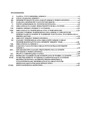 SPIS ROZDZIAŁÓW: I. II. III. IV. V. VI. VII. VIII. IX. X. XI. XII. XIII. XIV. XV. XVI. XVII. XVIII. NAZWA, TYP I SIEDZIBA SZKOŁY…….………………………………….…...s.1 CELE I ZADANIA SZKOŁY………………….……………………….……..……s.1 SPOSÓB WYKONYWANIA ZADAŃ SZKOŁY PODSTAWOWEJ…..…….....s.3 ZADANIA ZESPOŁÓW NAUCZYCIELSKICH………………………….....…..s.6 WEWNĄTRZSZKOLNY SYSTEM OCENIANIA…………………….…..….…s.8 ORGANIZACJA ZAJĘĆ DODATKOWYCH DLA UCZNIÓ……………..….s.23 FORMY OPIEKI I POMOCY UCZNIOM…………………………………..….s.23 ORGANIZACJA WSPÓŁDZIAŁANIA Z PORADNIAMI..…………….…….s.24 ZASADY I FORMY WSPÓŁDZIAŁANIA SZKOŁY Z PRAWNYMI OPIEKUNAMI UCZNIÓW W ZAKRESIE NAUCZANIA, WYCHOWANIA I PROFILAKTYKI……………………………………………………………….....s.24 ORGANY SZKOŁY PODSTAWOWEJ………………………………………....s.25 ZASADY WSPÓŁDZIAŁANIA ORGANÓW SZKOŁY ORAZ SPOSÓB ROZWIĄZYWANIA SPORÓW MIĘDZY NIMI……………..…....s.28 ORGANIZACJA SZKOŁY…………………………………………….…………s.29 ZADANIA NAUCZYCIELI ORAZ INNYCH PRACOWNIKÓW SZKOŁY……………………………………………………………………………s.32 SZCZEGÓŁOWE ZASADY PRZYJMOWANIA UCZNIÓW DO SZKOŁY PODSTAWOWEJ…………………………………………....……s.38 PRAWA I OBOWIĄZKI UCZNIA…………………………………….………...s.40 RODZAJE NAGRÓD I KAR STOSOWANYCH WOBEC UCZNIÓW….…...s.41 WARUNKI POBYTU W SZKOLE ZAPEWNIAJĄCE UCZNIOM BEZPIECZEŃSTWO, OCHRONĘ PRZED PRZEMOCĄ, UZALEŻNIENIAMI, DEMORALIZACJĄ ORAZ INNYMI PRZEJAWAMI PATOLOGII SPOŁECZNEJ………………………………….s.42 POSTANOWIENIA KOŃCOWE………………………………………..……....s.42 STATUT PUBLICZNEJ SZEŚCIOLETNIEJ SZKOŁY PODSTAWOWEJ NR 33 Im. Kornela Makuszyńskiego w Bielsku – Białej Podstawa prawna: Statut opracowano zgodnie z następującymi przepisami: art. 60 ust. 1 ustawy z 7 września 1991 r. o systemie oświaty (tekst jednolity: Dz. U. z 1996 r. nr 67, poz. 329 ze zmianami), rozporządzenie Ministra Edukacji Narodowej z 21 maja 2001 r. w sprawie ramowych statutów publicznego przedszkola oraz publicznych szkół (Dz. U. nr 61, poz. 624 oraz z 2002 r. nr 10 poz. 96), rozporządzenie Ministra Edukacji Narodowej z dnia 23 grudnia 2008 r. w sprawie podstawy programowej wychowania przedszkolnego oraz kształcenia ogólnego w poszczególnych typach szkół (Dz. U. z 2009 r. Nr 4, poz. 17), rozporządzenie ministra Edukacji Narodowej z dnia 10 sierpnia 2009 r. zmieniające rozporządzenie w sprawie sposobu nauczania szkolnego oraz zakresu treści dotyczących wiedzy o życiu seksualnym człowieka, o zasadach świadomego i odpowiedzialnego rodzicielstwa, o wartości rodziny, życia w fazie prenatalnej oraz metodach i środkach świadomej prokreacji zawartych w podstawie programowej kształcenia ogólnego. I. NAZWA, TYP I SIEDZIBA SZKOŁY §1 1. Typ – publiczna sześcioletnia szkoła podstawowa. 2. Numer porządkowy – 33 (trzydzieści trzy). 3. Imię – Kornela Makuszyńskiego. 4. Siedziba – Bielsko – Biała, ul. Łagodna 26. 5. Organ prowadzący – Gmina Bielsko – Biała. 6. Organ nadzoru – Śląskie Kuratorium Oświaty – Delegatura w Bielsku – Białej. II. CELE I ZADANIA SZKOŁY §2 1. Zgodnie z przepisami w sprawie ramowych planów nauczania cykl kształcenia w szkole podstawowej wynosi sześć lat. 2. Kształcenie w szkole podstawowej odbywa się w dwóch etapach edukacyjnych: 1) I etap: klasy I – III - edukacja wczesnoszkolna polegająca na stopniowym i łagodnym przeprowadzeniu dziecka z kształcenia zintegrowanego do nauczania przedmiotowego w klasach wyższych; 2) II etap: klasy IV – VI, w którym realizacja nauczania odbywa się w przedmiotach i blokach przedmiotowych. 3. Zadania szkoły na I i II etapie edukacyjnym: 1) kształcenie umiejętności posługiwania się językiem polskim, w tym dbałość o wzbogacanie zasobu słownictwa uczniów; 2) przygotowanie uczniów do życia w społeczeństwie informacyjnym: wyszukiwanie, porządkowanie i wykorzystywanie informacji z różnych źródeł z zastosowaniem technologii informacyjno-komunikacyjnych we współpracy z nauczycielami 1 bibliotekarzami przy wykorzystaniu zasobów multimedialnych i księgozbioru biblioteki; 3) edukacja medialna czyli wychowanie uczniów do właściwego odbioru i wykorzystania mediów; 4) edukacja zdrowotna: kształtowanie u uczniów dbałości o zdrowie własne, innych ludzi oraz tworzenie środowiska sprzyjającego zdrowiu; 5) umożliwianie dzieciom podtrzymywania poczucia tożsamości narodowej, etnicznej, językowej i religijnej. 4. W roku szkolnym 2013/2014 w klasach VI realizowane są ścieżki edukacyjne o charakterze wychowawczo – dydaktycznym: 1) edukacja prozdrowotna; 2) edukacja ekologiczna; 3) edukacja czytelnicza i medialna; 4) wychowanie do życia w społeczeństwie realizowane w modułach; 5) wychowanie patriotyczne i obywatelskie; 6) wychowanie regionalne – dziedzictwo kulturowe w regionie; 7) wychowanie do życia w rodzinie. §3 1. Celem kształcenia ogólnego w szkole podstawowej jest: 1) przyswojenie przez uczniów podstawowego zasobu wiadomości na temat faktów, zasad, teorii i praktyki, dotyczących przede wszystkim tematów i zjawisk bliskich doświadczeniom uczniów; 2) zdobycie przez uczniów umiejętności wykorzystywania posiadanych wiadomości podczas wykonywania zadań i rozwiązywania problemów; 3) kształtowanie u uczniów postaw warunkujących sprawne i odpowiedzialne funkcjonowanie we współczesnym świecie. 2. Do najważniejszych umiejętności zdobywanych przez ucznia w trakcie kształcenia ogólnego w szkole podstawowej należą: 1) czytanie – rozumiane zarówno jako prosta czynność, jako umiejętność rozumienia, wykorzystania i