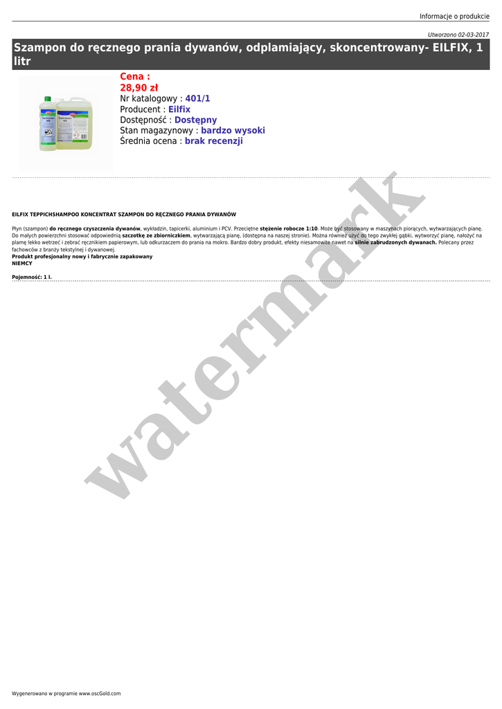 Informacje o produkcie Utworzono 02-03-2017 Szampon do ręcznego prania dywanów, odplamiający, skoncentrowany- EILFIX, 1 litr Cena : 28,90 zł er m ar k Nr katalogowy : 401/1 Producent : Eilfix Dostępność : Dostępny Stan magazynowy : bardzo wysoki Średnia ocena : brak recenzji EILFIX TEPPICHSHAMPOO KONCENTRAT SZAMPON DO RĘCZNEGO PRANIA DYWANÓW Płyn (szampon) do ręcznego czyszczenia dywanów, wykładzin, tapicerki, aluminium i PCV. Przeciętne stężenie robocze 1:10. Może być stosowany w maszynach piorących, wytwarzających pianę. Do małych powierzchni stosować odpowiednią szczotkę ze zbiorniczkiem, wytwarzającą pianę, (dostępna na naszej stronie). Można również użyć do tego zwykłej gąbki, wytworzyć pianę, nałożyć na plamę lekko wetrzeć i zebrać ręcznikiem papierowym, lub odkurzaczem do prania na mokro. Bardzo dobry produkt, efekty niesamowite nawet na silnie zabrudzonych dywanach. Polecany przez fachowców z branży tekstylnej i dywanowej. Produkt profesjonalny nowy i fabrycznie zapakowany NIEMCY w at Pojemność: 1 l. Wygenerowano w programie www.oscGold.com