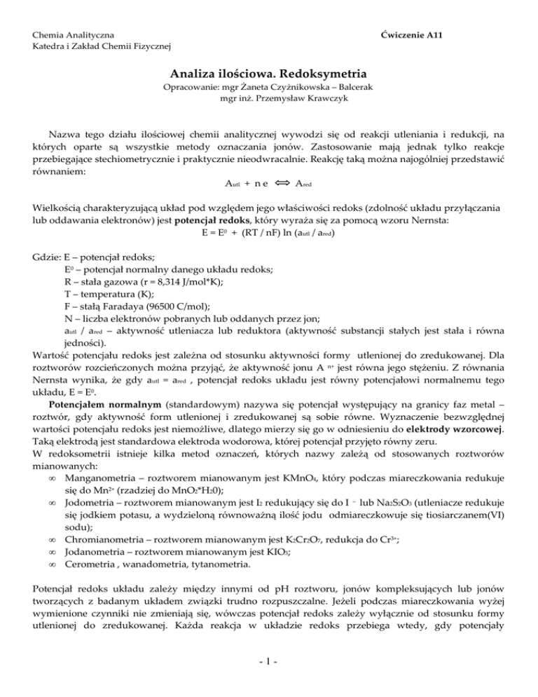 Analiza ilościowa. Redoksymetria - Katedra i Zakład Chemii Fizycznej