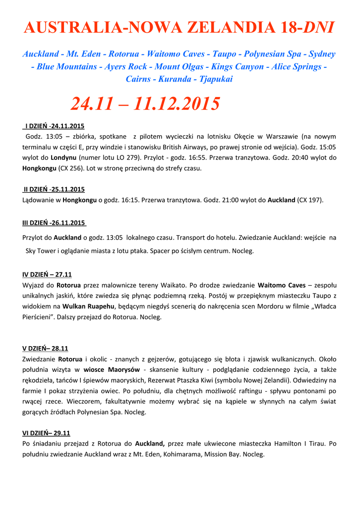 AUSTRALIA-NOWA ZELANDIA 18-DNI Auckland - Mt. Eden - Rotorua - Waitomo Caves - Taupo - Polynesian Spa - Sydney - Blue Mountains - Ayers Rock - Mount Olgas - Kings Canyon - Alice Springs Cairns - Kuranda - Tjapukai 24.11 – 11.12.2015 I DZIEŃ -24.11.2015 Godz. 13:05 – zbiórka, spotkane z pilotem wycieczki na lotnisku Okęcie w Warszawie (na nowym terminalu w części E, przy windzie i stanowisku British Airways, po prawej stronie od wejścia). Godz. 15:05 wylot do Londynu (numer lotu LO 279). Przylot - godz. 16:55. Przerwa tranzytowa. Godz. 20:40 wylot do Hongkongu (CX 256). Lot w stronę przeciwną do strefy czasu. II DZIEŃ -25.11.2015 Lądowanie w Hongkongu o godz. 16:15. Przerwa tranzytowa. Godz. 21:00 wylot do Auckland (CX 197). III DZIEŃ -26.11.2015 Przylot do Auckland o godz. 13:05 lokalnego czasu. Transport do hotelu. Zwiedzanie Auckland: wejście na Sky Tower i oglądanie miasta z lotu ptaka. Spacer po ścisłym centrum. Nocleg. IV DZIEŃ – 27.11 Wyjazd do Rotorua przez malownicze tereny Waikato. Po drodze zwiedzanie Waitomo Caves – zespołu unikalnych jaskiń, które zwiedza się płynąc podziemną rzeką. Postój w przepięknym miasteczku Taupo z widokiem na Wulkan Ruapehu, będącym niegdyś scenerią do nakręcenia scen Mordoru w filmie „Władca Pierścieni”. Dalszy przejazd do Rotorua. Nocleg. V DZIEŃ– 28.11 Zwiedzanie Rotorua i okolic - znanych z gejzerów, gotującego się błota i zjawisk wulkanicznych. Około południa wizyta w wiosce Maorysów - skansenie kultury - podglądanie codziennego życia, a także rękodzieła, tańców I śpiewów maoryskich, Rezerwat Ptaszka Kiwi (symbolu Nowej Zelandii). Odwiedziny na farmie I pokaz strzyżenia owiec. Po południu, dla chętnych możliwość raftingu - spływu pontonami po rwącej rzece. Wieczorem, fakultatywnie możemy wybrać się na kąpiele w słynnych na całym świat gorących źródłach Polynesian Spa. Nocleg. VI DZIEŃ– 29.11 Po śniadaniu przejazd z Rotorua do Auckland, przez małe ukwiecone miasteczka Hamilton I Tirau. Po południu zwiedzanie Auckland wraz z Mt. Eden, Kohimarama, Mission Bay. Nocleg. VII DZIEŃ– 30.11 Dalsze zwiedzanie Auckland oraz wyjazd do Piha - popularne czarne plaże nad Morzem Tasmana. Oglądanie najładniejszej z nich - plaży Muriwai, przylegającej do urwistego klifowego brzegu, na której występują kolonie dziwnych ptaków o jeszcze dziwniejszej nazwie Gannet. W drodze powrotnej spacer po buszu. Powrót do hotelu na nocleg. VIII DZIEŃ– 01.12 Rano transfer na lotnisko, wylot do Sydney. Przylot ok. południa, przejazd do hotelu. Spacer do centrum, wjazd na wieżę widokową, lunch z obserwacją panoramy miasta. Zwiedzanie Sydney: zespół wysokościowców, oceanarium. Nocleg. IX DZIEŃ -02.12 Dalsze całodzienne zwiedzanie Sydney: podziwianie gmachu słynnej opery, Katedra St. Mary, ogród botaniczny. Po południu rejs promem do urokliwej, nadmorskiej miejscowości Manly. Wieczorem wizyta na Kings Cross - dzielnicy rozrywki I wszelkiej rozpusty. X DZIEŃ -03.12 Wyjazd do Blue Mountains. Po drodze oglądanie wioski olimpijskiej z 2000 r. Wizyta w Featherdale Wildlife Park (gdzie można pogłaskać misie koala, dostać kopa od kangura, usiąść na jaju strusia, itp.). Dalej jazda do Blue Mountains, zwiedzanie unikalnych formacji skalnych, zjazd najbardziej stromą kolejką torową na świecie. Po południu powrót do Sydney. Nocleg. XI DZIEŃ -04.12 Wcześnie rano wyjazd na lotnisko I wylot do leżącego w samym centrum Australii Ayers Rock. Przylot I transfer do hotelu. Po południu oglądanie największego świętego kamienia Aborygenów oraz wizyta w Centrum Kultury Aborygeńskiej. Podziwianie wytworu natury w promieniach zachodzącego słońca. Fotografowanie kamienia I z kamieniem w tle na różne sposoby. Wieczorny relaks na basenie. Możliwość własnoręcznego sporządzenia pieczystego na rożnie. Krótki nocleg do 4:00 … XII DZIEŃ - 05.12 Pobudka przed świtem. Wyjazd na odkrycie innej świętej góry Aborygenów - Kata Tjuta (Mount Olgas) oraz spacer do wąwozu „Walpa Gorge”. Powrót na śniadanie do bazy. Dalej przejazd do Kings Canyon. Zakwaterowanie w bazie globtroterskiej. Próba śpiewu chóralnego w scenerii świetlistej poświaty gwieździstego nieba... XIII DZIEŃ –06.12 Wycieczka piesza wzdłuż gardzieli Kings Canyon. Podziwianie przedziwnego tworu natury w jego najciekawszych punktach. Około południa przejazd do stolicy interioru - Alice Springs. Zakwaterowanie. Orzeźwiające kąpiele. Wieczorny spacer po „westernowym” miasteczku. Nocleg. XIV DZIEŃ –07.12 Czas wolny, wypoczynek na hotelowym basenie lub zakup pamiątek. Dla chętnych fakultatywnie lot balonem nad interiorem. Po południu wyjazd na lotnisko, wylot do Cairns. Przylot I transfer do hotelu. Wieczorem spacer uliczkami Cairns, gdzie gromadzą się globtroterzy I nurkowie z całego świata. Możliwość spędzenia czasu na skocznych tańcach w klubie tanecznym lub przy szklanicy dobrze schłodzonego piwa w pubie. XV DZIEŃ –08.12 Odpoczynek nad Oceanem na plażach północnych Cairns w cieniu palm albo w pełni słońca lub fakultatywnie - całodzienna wycieczka łodzią na Wielką Rafę Koralową - podziwianie najpiękniejszej I największej na świecie rafy koralowej z milionami kolorowych ryb I stworzeń morskich, wspaniałości podwodnego świata. Nocleg w Cairns. XVI DZIEŃ – 09.12 Błogiego odpoczynku ciąg dalszy bądź - fakultatywnie - wycieczka kolejką do Kurandy: oglądanie wodospadów I dziwów natury oraz wizyta w Tjapukai - Parku Kultury Aborygeńskiej - oglądanie pokazów tańców aborygeńskich. Powrót na nocleg do Cairns. XVII DZIEŃ – 10.12 Po śniadaniu czas wolny. Godz. 10:00 wyjazd na lotnisko. Godz.13:00 wylot z Cairns do Hong Kongu (CX 146). Przylot do Hong Kongu o godz. 18:05. Przerwa tranzytowa. XVIII DZIEŃ -11.12) GODZ. 01:10 WYLOT Z HONG KONGU DO LONDYNU (CX 255) . PRZYLOT DO LONDYNU O GODZ. 06:20. PRZERWA TRANZYTOWA. WYLOT DO 