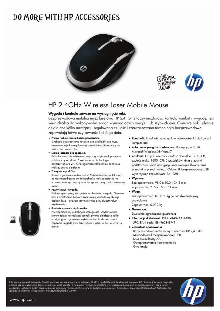 HP 2.4GHz Wireless Laser Mobile Mouse Wygoda i kontrola zawsze na wyciągnięcie ręki. Bezprzewodowa mobilna mysz laserowa HP 2,4 GHz łączy możliwości kontroli, komfort i wygodę, jest więc idealna do wykonywania zadań wymagających precyzji lub szybkich gier. Gumowe boki, płynnie działające kółko nawigacji, regulowana czułość i zaawansowana technologia bezprzewodowa zapewniają łatwe użytkowanie każdego dnia. ● Płynny ruch na niemal każdej powierzchni. Swoboda podróżowania również bez podkładki pod mysz. Laserowy czujnik o regulowanej czułości umożliwia pracę na większości powierzchni. ● Lepsza łączność bez opóźnień. Pełna łączność niezależnie od tego, czy użytkownik pracuje w pobliżu, czy w oddali. Zaawansowana technologia bezprzewodowa 2,4 GHz ogranicza zakłócenia i zapewnia większy zasięg działania. ● Porządek w podróży. Koniec z gubieniem odbiorników! Mikroodbiornik jest tak mały, że można podłączyć go do notebooka i tak pozostawić lub schować wewnątrz myszy — w ten sposób urządzenia zawsze są razem. ● Pewny chwyt i wygoda. Podczas gier i pracy niezbędna jest kontrola i wygoda. Gumowe boki i symetryczna budowa zapewniają komfortową obsługę osobom lewo- i praworęcznym również przy długotrwałym użytkowaniu. ● Kontrola w rękach użytkownika. Nie zapominajmy o drobnych szczegółach. Użytkownikom, którym zależy na większej kontroli, płynnie działające kółko nawigacyjne z gumowym wykończeniem środkowej części zapewnia wygodę przy przewijaniu w górę, w dół, w lewo i w prawo. ● Zgodność: Zgodność ze wszystkimi notebookami i biurkowymi komputerami ● Zalecane wymagania systemowe: Dostępny port USB; Microsoft Windows XP/Vista/7 ● Zasilanie: Czujnik laserowy, czułość domyślna 1200 CPI, czułość maks. 1600 CPI; 5 przycisków: dwa przyciski podstawowe, kółko nawigacji umożliwiające klikanie oraz przyciski w przód i wstecz; Odbiornik bezprzewodowy USB wykorzystuje częstotliwość 2,4 GHz ● Wymiary: Bez opakowania: 98,0 x 60,0 x 34,5 mm Zapakowane: 215 x 160 x 51 mm ● Waga: Bez opakowania: 0,1102 kg (w tym dwuczęściowy akumulator) Zapakowane: 0,212 kg ● Gwarancja: Dwuletnia ograniczona gwarancja ● Informacje dodatkowe: P/N: VK482AA #ABB UPC/EAN code: 884962348741 ● Zawartość opakowania Bezprzewodowa mobilna mysz laserowa HP 2,4 GHz Mikroodbiornik bezprzewodowy USB Dwa akumulatory AA Oprogramowanie i dokumentacja Gwarancja Informacja o prawach autorskich: Produkt może być inny niż widoczny na zdjęciach. © 2010 Hewlett-Packard Development Company, L.P. Niniejsze informacje mogą ulec zmianie bez powiadomienia. Jedyne gwarancje, jakich udziela HP na produkty i usługi, są określone w oświadczeniach gwarancyjnych dostarczanych wraz z takimi produktami i usługami. Żaden zapis niniejszego dokumentu nie może być uważany za dodatkową gwarancję. HP nie ponosi odpowiedzialności za błędy techniczne lub redakcyjne oraz braki występujące w niniejszym dokumencie. 02/10 www.hp.com