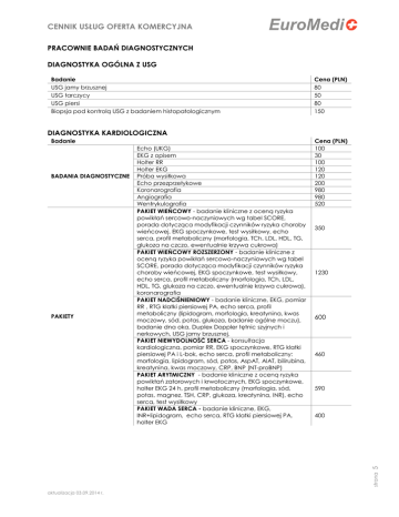 CENNIK USŁUG OFERTA KOMERCYJNA PRACOWNIE BADAŃ DIAGNOSTYCZNYCH DIAGNOSTYKA OGÓLNA Z USG Badanie USG jamy brzusznej USG tarczycy USG piersi Biopsja pod kontrolą USG z badaniem histopatologicznym Cena (PLN) 80 50 80 150 DIAGNOSTYKA KARDIOLOGICZNA Badanie BADANIA DIAGNOSTYCZNE Cena (PLN) 100 30 100 120 120 200 980 980 520 350 1230 600 460 590 400 strona 5 PAKIETY Echo (UKG) EKG z opisem Holter RR Holter EKG Próba wysiłkowa Echo przezprzełykowe Koronarografia Angiografia Wentrykulografia PAKIET WIEŃCOWY - badanie kliniczne z oceną ryzyka powikłań sercowo-naczyniowych wg tabel SCORE, porada dotycząca modyfikacji czynników ryzyka choroby wieńcowej, EKG spoczynkowe, test wysiłkowy, echo serca, profil metaboliczny (morfologia, TCh, LDL, HDL, TG, glukoza na czczo, ewentualnie krzywa cukrowa) PAKIET WIEŃCOWY ROZSZERZONY - badanie kliniczne z oceną ryzyka powikłań sercowo-naczyniowych wg tabel SCORE, porada dotycząca modyfikacji czynników ryzyka choroby wieńcowej, EKG spoczynkowe, test wysiłkowy, echo serca, profil metaboliczny (morfologia, TCh, LDL, HDL, TG, glukoza na czczo, ewentualnie krzywa cukrowa), koronarografia PAKIET NADCIŚNIENIOWY - badanie kliniczne, EKG, pomiar RR , RTG klatki piersiowej PA, echo serca, profil metaboliczny (lipidogram, morfologia, kreatynina, kwas moczowy, sód, potas, glukoza, badanie ogólne moczu), badanie dna oka, Duplex Doppler tętnic szyjnych i nerkowych, USG jamy brzusznej. PAKIET NIEWYDOLNOŚĆ SERCA - konsultacja kardiologiczna, pomiar RR, EKG spoczynkowe, RTG klatki piersiowej PA i L-bok, echo serca, profil metaboliczny: morfologia, lipidogram, sód, potas, AspAT, AlAT, bilirubina, kreatynina, kwas moczowy, CRP, BNP (NT-proBNP) PAKIET ARYTMICZNY - badanie kliniczne z oceną ryzyka powikłań zatorowych i krwotocznych, EKG spoczynkowe, holter EKG 24 h, profil metaboliczny (morfologia, sód, potas, magnez, TSH, CRP, glukoza, kreatynina, INR), echo serca, test wysiłkowy PAKIET WADA SERCA - badanie kliniczne, EKG, INR+lipidogram, echo serca, RTG klatki piersiowej PA, holter EKG aktualizacja 03.09.2014 r. CENNIK USŁUG OFERTA KOMERCYJNA DIAGNOSTYKA NACZYNIOWA Badanie BADANIA DIAGNOSTYCZNE PAKIETY Doppler CW-API Kolor Doppler żył lub tętnic kończyn górnych Kolor Doppler tętnic kończyn dolnych (2 kończyny) Kolor Doppler żył kończyn dolnych (2 kończyny) Kolor Doppler tętnic nerkowych / trzewnych (z oceną nerek) Kolor Doppler naczyń wątrobowych Kolor Doppler tętnic szyjnych i kręgowych Kolor Doppler aorty brzusznej Kapilaroskopia z konsultacją Badanie rentgenowskie tętnic - arteriografia Cena (PLN) 60 120 120 120 120 120 100 60 120 1700 PAKIET NACZYNIOWY - konsultacja chirurga naczyniowego z jednoczesnym badaniem kolor Doppler 210 PAKIET ANGIO TK PODSTAWOWY - konsultacja chirurga naczyniowego oraz angiotomografia 470 PAKIET ANGIO TK ROZSZERZONY - konsultacja chirurga naczyniowego, badanie kolor Doppler oraz angiotomografia PAKIET MIAŻDŻYCOWY - konsultacja chirurga naczyniowego, konsultacja lekarza kardiologa, profil metaboliczny (morfologia, sód, potas, magnez, TSH, CRP, glukoza, kreatynina, lipidogram), badanie metodą Kolor Doppler tętnic szyjnych /lub Doppler kończyn dolnych/ w zależności od objawów PAKIET RAYNAUD "zimne dłonie/ ziębnięcie kończyn" - konsultacja chirurga naczyniowego, kapilaroskopia, badanie metodą Doppler CW PAKIET ŻYLAKOWY - konsultacja chirurga naczyniowego, badanie żył metodą kolor Doppler 560 380 260 210 PAKIET UDAROWY - konsultacja chirurga naczyniowego oraz neurologa, badanie kolor Doppler tętnic szyjnych 310 PAKIET UDAROWY ROZSZERZONY - konsultacja chirurga naczyniowego oraz neurologa, badanie kolor Doppler tętnic szyjnych, angiotomografia tętnic szyjnych 720 PAKIET TĘTNIAKOWY - konsultacja chirurga naczyniowego, USG aorty brzusznej i tętnic biodrowych, udowych oraz podkolanowych 270 PAKIET TĘTNIAKOWY ROZSZERZONY - konsultacja chirurga naczyniowego, USG aorty brzusznej i tętnic biodrowych, udowych oraz podkolanowych, angiotomografia z kwalifikacją do operacji tętniaka lub implantacji stentgraftu 700 DIAGNOSTYKA ORTOPEDYCZNA 180 strona 6 PAKIET RTG - konsultacja lekarza ortopedy, RTG do dwóch okolic anatomicznych aktualizacja 03.09.2014 r. CENNIK USŁUG OFERTA KOMERCYJNA LABORATORIUM Nazwa usługi / opis Cena (PLN) Pobranie krwi 4,00 BADANIA PODSTAWOWE HEMATOLOGIA Morfologia krwi obwodowej 5 diff 4,50 Odczyn Biernackiego 4,00 Leukogram 4,00 Oporność osmotyczna krwinek 5,00 Retikulocyty 5,00 HbA1c Hemoglobina glikowana 15,50 Beta-2-mikroglobulina 75,50 Bilirubina bezpośrednia Bil-D 9,50 Bilirubina całkowita Bil-T 4,50 GOT/AST 4,50 GPT/ALT 4,50 Gamma GT 4,50 Fosfataza alkaliczna ALP 4,50 Mocznik 4,50 Kreatynina 4,50 Kwas moczowy 4,50 Fosfataza kwaśna ACP 4,50 Cholesterol całkowity 3,50 HDL Cholesterol 4,50 LDL Cholesterol 1,00 Trójglicerydy 4,50 Lipaza 7,00 CK-MB 10,00 CK-NAC Kinaza kreatynowa 10,00 LDH Dehydrogenaza mleczanowa 5,00 Fosfataza sterczowa ACP-P 12,50 alfa-amylaza (diastaza) we krwi 4,50 Cholinesteraza 12,50 Fosfataza alkaliczna frakcja kostna 15,00 Jonogram (sód, potas, chlorki) 4,50 Wapń 4,50 Fosfor nieorganiczny 4,50 Magnez 4,50 Żelazo 4,50 TIBC (całkowita zdolność wiązania żelaza) 7,50 Białko całkowite 4,50 Proteinogram (elektroforeza) 19,00 Glukoza we krwi 3,50 19 Albuminy 7,50 strona CHEMIA KLINICZNA aktualizacja 03.09.2014 r. CENNIK USŁUG OFERTA KOMERCYJNA Nazwa usługi / opis Cena (PLN) Homocysteina 50,00 Ceruloplazmina 37,50 IgG 15,00 IgA 15,00 IgM 15,00 IgE 15,00 Gazometria 31,50 Troponina I 19,00 Dobowy profil glukozy (S) 12,50 DIAGNOSTYKA ANEMII Transferyna 37,50 Ferrytyna 22,50 Witamina B12 31,50 Kwas foliowy 31,50 KOAGULOLOGIA D-dimery 19,00 PT - Czas protrombinowy 5,00 APTT - Czas kaolinowo-kefalinowy 5,00 Fibrynogen 5,00 BADANIE KAŁU Badanie kału na pasożyty 5,00 Kał w kierunku Lamblii 18,50 Kał na stopień strawienia 6,50 Kał na krew utajoną 12,50 Badanie kału w kierunku owsika 11,50 5,00 Białko w D.Z.M. 4,00 alfa-a