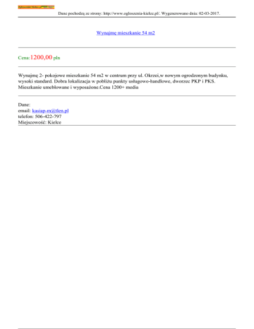 Dane pochodzą ze strony: http://www.ogloszenia-kielce.pl/. Wygenerowano dnia: 02-03-2017. Wynajmę mieszkanie 54 m2 Cena:1200,00 pln Wynajmę 2- pokojowe mieszkanie 54 m2 w centrum przy ul. Okrzei,w nowym ogrodzonym budynku, wysoki standard. Dobra lokalizacja w pobliżu punkty usługowo-handlowe, dworzec PKP i PKS. Mieszkanie umeblowane i wyposażone.Cena 1200+ media Dane: email: [email protected] telefon: 506-422-797 Miejscowość: Kielce
