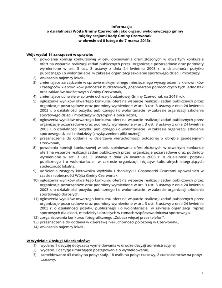 Informacja o działalności Wójta Gminy Czerwonak jako organu wykonawczego gminy między sesjami Rady Gminy Czerwonak w okresie od 8 lutego do 7 marca 2013r. Wójt wydał 14 zarządzeń w sprawie: 1) powołania komisji konkursowej w celu opiniowania ofert złożonych w otwartym konkursie ofert na wsparcie realizacji zadań publicznych przez organizacje pozarządowe oraz podmioty wymienione w art. 3 ust. 3 ustawy z dnia 24 kwietnia 2003 r. o działalności pożytku publicznego i o wolontariacie w zakresie organizacji szkolenie sportowego dzieci i młodzieży, 2) wskazania najemcy lokalu, 3) zmieniające zarządzenie w sprawie maksymalnego miesięcznego wynagrodzenia kierowników i zastępców kierowników jednostek budżetowych, gospodarstw pomocniczych tych jednostek oraz zakładów budżetowych Gminy Czerwonak, 4) zmieniające uchwałę w sprawie uchwały budżetowej Gminy Czerwonak na 2013 rok, 5) ogłoszenia wyników otwartego konkursu ofert na wsparcie realizacji zadań publicznych przez organizacje pozarządowe oraz podmioty wymienione w art. 3 ust. 3 ustawy z dnia 24 kwietnia 2003 r. o działalności pożytku publicznego i o wolontariacie w zakresie organizacji szkolenia sportowego dzieci i młodzieży w dyscyplinie piłka nożna, 6) ogłoszenia wyników otwartego konkursu ofert na wsparcie realizacji zadań publicznych przez organizacje pozarządowe oraz podmioty wymienione w art. 3 ust. 3 ustawy z dnia 24 kwietnia 2003 r. o działalności pożytku publicznego i o wolontariacie w zakresie organizacji szkolenia sportowego dzieci i młodzieży (z wyłączeniem piłki nożnej), 7) przeznaczenia do oddania w dzierżawę nieruchomości położonej o obrębie geodezyjnym Czerwonak, 8) powołania komisji konkursowej w celu opiniowania ofert złożonych w otwartym konkursie ofert na wsparcie realizacji zadań publicznych przez organizacje pozarządowe oraz podmioty wymienione w art. 3 ust. 3 ustawy z dnia 24 kwietnia 2003 r. o działalności pożytku publicznego i o wolontariacie w zakresie organizacji inicjatyw kulturalnych integrujących społeczność lokalną, 9) udzielenia zastępcy kierownika Wydziału Urbanistyki i Gospodarki Gruntami upoważnień w czasie nieobecności Wójta Gminy Czerwonak, 10) ogłoszenia wyników otwartego konkursu ofert na wsparcie realizacji zadań publicznych przez organizacje pozarządowe oraz podmioty wymienione w art. 3 ust. 3 ustawy z dnia 24 kwietnia 2003 r. o działalności pożytku publicznego i o wolontariacie w zakresie organizacji szkolenia sportowego dorosłych, 11) ogłoszenia wyników otwartego konkursu ofert na wsparcie realizacji zadań publicznych przez organizacje pozarządowe oraz podmioty wymienione w art. 3 ust. 3 ustawy z dnia 24 kwietnia 2003 r. o działalności pożytku publicznego i o wolontariacie w zakresie organizacji imprez sportowych dla dzieci, młodzieży i dorosłych w ramach współzawodnictwa sportowego, 12) zorganizowania konkursu fotograficznego „Zobacz więcej przez telefon”, 13) przeznaczenia do oddania w dzierżawę nieruchomości położonej w Czerwonaku, 14) wskazania najemcy lokalu. W Wydziale Obsługi Mieszkańców: 1) wydano 1 decyzję dotyczącą wymeldowania w drodze decyzji administracyjnej, 2) wydano 2 decyzje umarzające postępowanie o wymeldowanie, 3) zameldowano: 43 osoby na pobyt stały, 18 osób na pobyt czasowy, 2 cudzoziemców na pobyt czasowy, 1 4) 5) 6) 7) 8) 9) 10) 11) 12) 13) 14) 15) 16) wymeldowano: 14 osób, przemeldowano: 8 osób, zarejestrowano: 33 urodzenia, 15 zgonów, 10 rozwodów, 4 zmiany nazwiska (imienia), udostępniono 46 informacji o danych osobowych, wydano 16 poświadczeń o zameldowaniu, 27 poświadczeń o zameldowaniu czasowo w innej gminie, wydano 23 zawiadomienia o wymeldowaniu przy czynności zameldowania, przyjęto 33 zawiadomienia o nowym miejscu pobytu stałego, wydano 61 danych osobowo-adresowych, wprowadzono 175 zmian w danych dotyczących dowodów osobistych, dokonano 107 wpisów do centralnej ewidencji działalności gospodarczej, wydano 2 zaświadczenia z lokalnej ewidencji działalności gospodarczej, wydano 7 decyzji o wygaśnięciu zezwolenia na sprzedaż napojów alkoholowych, wydano 250 dowodów osobistych i przyjęto 207 wniosków o wydanie dowodu osobistego. W Urzędzie Stanu Cywilnego sporządzono: 1) 1 akt urodzenia, 2) 3 akty małżeństw (cywilne), 3) 7 aktów zgonu, 4) 3 decyzje w sprawie wpisania do polskich ksiąg aktów sporządzonych za granicą, sprostowania i uzupełnienia treści aktów, 5) 1 zaświadczenie stwierdzające brak okoliczności wyłączających zawarcie małżeństwa, 6) 106 odpisów skróconych, zupełnych i wielojęzycznych z akt stanu cywilnego, 7) 19 przypisków do aktów stanu cywilnego, 8) rozwiązania małżeństw – naniesiono 3 zmiany, 9) 1 decyzję w sprawie zmiany imion i nazwisk, 10) 1 zaświadczenie o zdolności prawnej do zawarcia małżeństwa za granicą, 11) przyjęto 3 oświadczenia o uznaniu ojcostwa. W Wydziale Podatków i Opłat Lokalnych: 1) wprowadzono do ewidencji 7800 potwierdzeń odbioru decyzji wymiarowych na rok 2013, 2) wydano: - 20 decyzji w sprawie podatku od nieruchomości i rolnego, - 4 postanowienia o wszczęciu postępowania, - 9 wezwań do złożenia informacji podatkowych, - 15 wezwań do zapoznania się z aktami, - 15 zaświadczeń, - 33 decyzje w sprawie zwrotu podatku akcyzowego zawartego w cenie oleju napędowego, - 40 informacji o nadpłacie, - 127 tytułów wykonawczych, - 14 upomnień, - 13 postanowienia o przerachowaniu wpłaty, - 2 decyzje w sprawie zwrotu opłaty skarbowej, 3) przyjęto, opracowano i przeprowadzono postępowania w sprawie 33 wniosków o zwrot podatku akcyzowego zawartego w cenie oleju napędowego, 4) wysłano 10 pism do urzędu skarbowego, 5) złożono 3 wnioski o wpis hipoteki przymusowej, 2 zgłoszenia wierzytelności, 6) przeprowadzono 1 kontrolę podatkową. 2 W Wydziale Inwestycji: Kontynuowane są prace przy budowie połączenia drogowego pomiędzy ul. Piłsudskieg