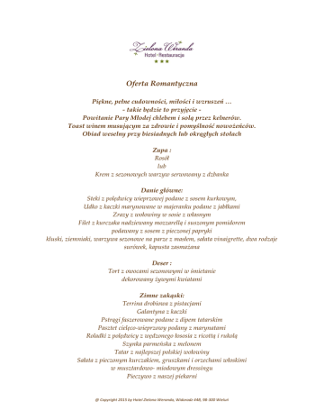 Oferta Romantyczna Piękne, pełne cudowności, miłości i wzruszeń … - takie będzie to przyjęcie Powitanie Pary Młodej chlebem i solą przez kelnerów. Toast winem musującym za zdrowie i pomyślność nowożeńców. Obiad weselny przy biesiadnych lub okrągłych stołach Zupa : Rosół lub Krem z sezonowych warzyw serwowany z dzbanka Danie główne: Steki z polędwicy wieprzowej podane z sosem kurkowym, Udko z kaczki marynowane w majeranku podane z jabłkami Zrazy z wołowiny w sosie z własnym Filet z kurczaka nadziewany mozzarellą i suszonym pomidorem podawany z sosem z pieczonej papryki kluski, ziemniaki, warzywa sezonowe na parze z masłem, sałata vinaigrette, dwa rodzaje surówek, kapusta zasmażana Deser : Tort z owocami sezonowymi w śmietanie dekorowany żywymi kwiatami Zimne zakąski: Terrina drobiowa z pistacjami Galantyna z kaczki Pstrągi faszerowane podane z dipem tatarskim Pasztet cielęco-wieprzowy podany z marynatami Roladki z polędwicy z wędzonego łososia z ricottą i rukolą Szynka parmeńska z melonem Tatar z najlepszej polskiej wołowiny Sałata z pieczonym kurczakiem, gruszkami i orzechami włoskimi w musztardowo- miodowym dressingu Pieczywo z naszej piekarni @ Copyright 2015 by Hotel Zielona Weranda, Widoradz 44B, 98-300 Wieluń Dania gorące serwowane: danie I podane wieczorem Płatki z polędwiczki wieprzowej na placuszkach ziemniaczanych z borowikami danie II podane przed północą Filet z sandacza podany z rizotto, sosem z zielonego pieprzu i młodą marchewką danie III podane po północy Polędwiczki drobiowe w kremowym sosie z francuskiej musztardy i białego wina podana z tagiatelle danie IV podane nad ranem Francuska zupa cebulowa zapiekana z serowymi grzankami lub barszczyk czerwony z pasztecikiem Dzień drugi – poprawiny z polskim smakiem Zupa: (jedna do wyboru) 1. Zupa pomidorowa ze świeżych pomidorów podana z ryżem 2. Polski kapuśniak na wędzonce podany z kawałkami mięsa (zupy podane w wazach w stoły) Danie główne (2 szt. mięsa na osobę): 1. Kotlet schabowy 2. Stek siekany z prażoną cebulką 3. Fantazja drobiowa z brokułami i mozzarellą na sosie pieczarkowym Dodatki: Ziemniaki z wody z koperkiem, 2 rodzaje surówek sezonowych Zakąski zimne: 1. Schab w galarecie 2. Chrusty drobiowe z sosem brendy 3. Półmiski mięs pieczystych z chrzanem 4. Śledzik w śmietanie 5. Tradycyjna sałatka jarzynowa Ciepłe kolacje: 1. Cepeliny z farszem mięsym okraszone świeżą słoniną i boczkiem 2. Żurek wieluński z jajkiem i kiełbasą Tort weselny oraz apartament dla nowożeńców GRATIS. Kawa, herbata, pieczywo, woda niegazowana w cenie przyjęcia bez ograniczeń. Cena 260zł/os *Wszystkie ceny obowiązują w sezonie 2015/2016 r. @ Copyright 2015 by Hotel Zielona Weranda, Widoradz 44B, 98-300 Wieluń Dodatkowo polecamy m.in.: Słodki bufet Pięknie zaaranżowany bufet z deserami a wśród nich Panna Cotta, Czekoladowy, Cytrynowy, Cream Brule, Tiramisu, mini babeczki z owocami, mini bezy z pistacjami, muffinki Cena od 11 zł/os Live cooking Krewetki w emulsji maślanej z pomidorkami concase, steki z polędwicy wieprzowej flambirowane żubrówką, płatki polędwicy wołowej, grzyby sezonowe (boczniaki, rydze) smażone na maśle czosnkowym, a wszystko to przygotowywane przez naszych kucharzy na oczach Państwa gości. Czas trwania 1,5 h Cena od 30 zł/os Dodatkowo polecamy steki z sezonowanej, dojrzewającej wołowiny 10 zł/os Staropolskie Danie Szefa Kuchni Udziec wieprzowy w sosie winno-grzybowym Kaczki nadziewane mięsem i wątrówką z prażonymi jabłkami Łosoś, Sum, Sandacz lub Szczupak faszerowany z sosem z białego wina Dodatki: kasza gryczana, kausta czerwona na ciepło, grzyby marynowane, papryka, ogórki Cena 35 zł/os Stacja Sushi Stacja obsługiwana przez profesjonalnych itamae. Sushi tworzone z najwyższej jakości ryb wędzonych, świeżych lub wegańskie Nigiri, Sashimi, Hosomaki, Uramaki, Futomaki, Kotonaru Maki Cena od 25 zł/os (przy minimum 100 osobach) Drink Bar Profesjonalna obsługa barmańska wraz z alkoholem, owocami do garnirowania, dekoracją baru Cena od 35 zł/os Parowozik z pieczonymi kasztanami Romantyczny parowozik prosto z Paryża, a w nim pieczone kasztany, które przeniosą Państwa prosto na Plac Pigalle Cena od 12 zł/os Gościna w Werandzie Szynka z tłuszczykiem oraz szynka tradycyjna krucha Polędwice schabowe oraz balerony i boczki Kiełbasa krakowska sucha Kiełbasy cienkie podsuszane oraz świeże, kabanosy Salceson wiejski ozorkowy Kaszanka czarna, pasztetowa Marynaty, smalec, masło, twaróg wiejski Cena 15 zł/os – 1 dzień Dodatkowo proponujemy udziec z kością – 350 zł @ Copyright 2015 by Hotel Zielona Weranda, Widoradz 44B, 98-300 Wieluń Stół Rybny Całe ryby faszerowane: łosoś, sum, pstrąg Ryby w marynacie: pstrąg, miętus Ryby wędzone prosto z naszej wędzarni Łosoś w plastrach oraz w kawałkach na sałatach Węgorz Sałatki z krewetką koktajlową Sałatki z paluszkami krabowymi (podane w naczyniach finger-food) Cena 18 zł/os Grillowanie w dzień poprawin (w sezonie letnim) Steki z karkówki Filet z kurczaka Żeberka w słodko-pikantnej marynacie Pstrąg marynowany w ziołach z cytryną Kiełbasa oraz kaszanka Warzywa: cukinia, bakłażan, pomidory, papryka, ziemniaki pieczone z ziołami Sałatki: vinaigrette, z pomidorów i fasoli, bawarska Sosy oraz dipy Cena od 35 zł/os W celu uzyskania dodatkowych informacji prosimy o kontakt pod numerem telefonu 601 314 990 lub 43 841 80 71 Państwa zadowolenie to cel naszych starań! Zapraszamy do skorzystania z naszej oferty. Hotel Zielona Weranda, Widoradz 44B, 98-300 Wieluń www.zielonaweranda.com.pl [email protected] Ceny obowiązują w sezonie 2015/2016 @ Copyright 2015 by Hotel Zielona Weranda, Widoradz 44B, 98-300 Wieluń