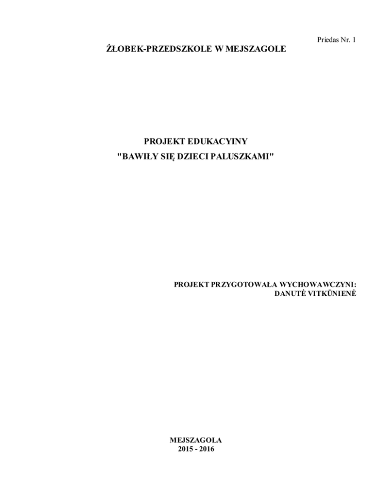 ŻŁOBEK-PRZEDSZKOLE W MEJSZAGOLE Priedas Nr. 1 PROJEKT EDUKACYINY "BAWIŁY SIĘ DZIECI PALUSZKAMI" PROJEKT PRZYGOTOWAŁA WYCHOWAWCZYNI: DANUTĖ VITKŪNIENĖ MEJSZAGOLA 2015 - 2016 Krótki opis O tym jak ważne jest przytulanie czy głaskanie wiedziały już nasze babci, biorąc nas na kolana, bawiąc się w „koci- łapci“. Zabawy paluszkowe niezwykle pozytywnie wpływają na rozwój dziecka, rozwijają motorykę małą, mają pozytywny wpływ na rozwój mowy dziecka, zaspokajają potrzeby psychiczne i emocjonalne. Cel ogólny: Rozwijanie sprawności manualnej. Cele szczegółowe: 1. Rozwijanie koordynacji wzrokowo ruchowej poprzez prace plastyczne za pomocą paluszków. 2. Rozwijanie pamięci słuchowej, mowy, wzbogacenie słownictwa za pomocą, wierszy, rymowanek paluszkowych. 3. Zaspokojenie potrzeb psychicznych i emocjonalnych. Uczestnicy: dzieci w wieku od 1,5 do 6 lat. Grupy przedszkolne: "Biedronki", "Krasnoludki"; Miejsce wykonania: żlobek przedszkole Koszt: z funduszu grupy Partnerzy: rodzice, wychowawczynie. Czas wykonania projektu: 2015.10 - 2016.03 PLAN WYKONANIA PROJEKTU Eil. Nr. Prie monės pavadinimas 1. Temat: Motoryka mała – zabawy paluszko-we 1. Gimnastyka paluszków. (Ćwiczenia za pomocą piłeczek masażowych ołówków, sczotczek) Dary jesieni. Praca zespołowa Temat: Wierszyki, rymowanki paluszkowe. Nauka wierszy („Idzie rak nieborak“, „Bawiły się dzieci paluszkami“, „Ten pierwszy to dziadek“, „Małe rączki‘) Zima biała Prace plastyczne z materiałów przyrodniczych Wystawa: „Paluszkowe lalki“ 2. Įgyvendinimo vieta Grupa żłobkowa Dalyviai Grupa "Biedronki" Įgyvendinimo laikas 2015-10 Prie monių vertinimo kriterijai Zdjęcia Atsakingi asmenys D. Vitkūnienė Grupa żłobkowa Grupa "Biedronki“ 2015-11 Zdjęcia D. Vitkūnienė Grupa żłobkowa Grupa "Biedronki" Grupa "Biedronki", Rodzice Grupa "Biedronki" Grupa "Biedronki" i „Krasnoludki“ Grupa "Biedronki" Grupa "Biedronki" Grupa "Biedronki" i „Krasnoludki“ 2015-12 Zdjęcia D. Vitkūnienė 2016-01 Zdjęcia D. Vitkūnienė 2016-01 Zdjęcia D. Vitkūnienė 2016-02 Zdjęcia D. Vitkūnienė 2016-02 Zdjęcia D. Vitkūnienė 2016-03 Zdjęcia D. Vitkūnienė 2016-03 Zdjęcia D. Vitkūnienė Grupa żłobkowa Paluszki pracują“ „Buleczki dla babci i dziadka“ Grupa żłobkowa Teatrzyk paluszkowy „Trzy świnki“ Grupa żłobkowa Maseczki zapustowe Malowanie farbami za pomocą paluszków Urządzenie stendu informacyjnego dla rodziców: „Co my umiemy“ Wspólna zabawa dzieci z grupy „Biedronki“ i „Krasnoludki“ „Bawiły się dzieci paluszkami“ Grupa żłobkowa Szatnia grupy Sala przedszkol na