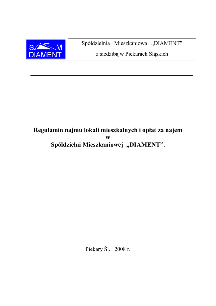 Spółdzielnia Mieszkaniowa „DIAMENT” z siedzibą w Piekarach Śląskich Regulamin najmu lokali mieszkalnych i opłat za najem w Spółdzielni Mieszkaniowej „DIAMENT”. Piekary Śl. 2008 r. I Postanowienia ogólne §1 1. Na podstawie przepisów § 3 ust. 2 pkt. 6 Statutu, Spółdzielnia może zawierać zarówno z członkami Spółdzielni jak i osobami nie będącymi członkami umowy najmu lokali mieszkalnych w budynkach stanowiących własność Spółdzielni. 2. Spółdzielnia może wynajmować lokale mieszkalne wolne w sensie prawnym, do których nie może ustanowić spółdzielczego prawa do lokalu lub prawa odrębnej własności lokalu, lub z uwagi na brak osób zainteresowanych uzyskaniem powyższego prawa. 3. Uchwałę o przeznaczeniu lokalu mieszkalnego do przetargu podejmuje Zarząd Spółdzielni. 4. Spółdzielnia organizuje przetarg w celu uzyskania najwyższej stawki czynszu najmu lokalu mieszkalnego. 5. Przetarg ma charakter ustny (licytacja) i przeprowadzany jest w oparciu o Regulamin przetargów na zbycie praw do lokali stanowiących własność Spółdzielni. §2 1. Mieszkaniami przeznaczonymi do wynajęcia mogą być w szczególności: a. mieszkania z odzysku, do których prawa dotychczasowych użytkowników wygasły,(wolne w sensie prawnym), b. mieszkania powstałe w wyniku adaptacji dotychczasowych lokali użytkowych, poddaszy, pralni lub suszarni, nadające się do zamieszkania zgodnie z przepisami prawa budowlanego. II - Kryteria wyboru najemców lokali mieszkalnych §3 Najemcami lokali mieszkalnych mogą być: 1) członkowie mieszkający w zasobach mieszkaniowych Spółdzielni, zalegający z zapłatą czynszu za okres ponad 12 miesięcy, którzy dobrowolnie zrzekli się prawa do dotychczas zajmowanego lokalu w zamian za wynajęcie im mniejszego mieszkania, 2) ustały przyczyny wykluczenia lub wykreślenia Członka zajmującego spółdzielczy lokal mieszkalny, a nie został on ponownie przyjęty w poczet Członków Spółdzielni, 3) osoba zajmująca lokal mieszkalny złożyła zobowiązanie o ratalnej spłacie zaległości, za powstanie których została uprzednio wykluczona, 4) byli członkowie Spółdzielni, których przekwaterowanie dokonane zostało do wskazanego przez Spółdzielnię lokalu mieszkalnego przeznaczonego do wynajęcia. 5) Gmina – w celu realizacji zawartego ze Spółdzielnią porozumienia dotyczącego dostarczania lokali socjalnych na rzecz byłych członków Spółdzielni, 6) osoby fizyczne lub prawne nie będące członkami Spółdzielni. 1 III - Ogólne zasady najmu lokali mieszkalnych §4 1. Najem lokali mieszkalnych przez osoby wymienione w § 3 odbywa się na podstawie umowy najmu na czas nie oznaczony. 2. Małżonkowie wspólnie zajmujący lokal na podstawie umowy najmu są z mocy prawa najemcami tego lokalu, chociażby umowa najmu została zawarta tylko przez jednego z nich. 3. W razie śmierci najemcy, osoby bliskie mieszkające z nim stale do chwili śmierci, wstępują w stosunek najmu lokalu, chyba że się tego prawa zrzekną wobec Spółdzielni. Nie dotyczy to osób, które w chwili śmierci najemcy miały tytuł prawny do zajmowanego innego lokalu mieszkalnego. 4. Najem lokali mieszkalnych przez Gminę na cele określone w § 3 pkt. 5 odbywa się na podstawie umowy najmu na czas nieoznaczony. 5. Szczegółowy zakres obowiązków Spółdzielni i najemcy określa umowa najmu. 6. Umowa ta winna przewidywać m.in., że do najemcy mieszkania mają zastosowanie przepisy regulaminu używania lokali oraz porządku domowego obowiązującego w zasobach mieszkaniowych SM DIAMENT. 7. Przed wydaniem lokalu najemcy sporządza się protokół, w którym szczegółowo określa stan techniczny znajdujących się w lokalu instalacji, urządzeń, podłóg oraz stolarki drzwiowej i okiennej. 8. Za zapłatę czynszu i innych opłat obciążających lokal odpowiadają solidarnie z najemcą stale mieszkające z nim osoby pełnoletnie. §5 1. Najemca może wprowadzić w lokalu ulepszenia tylko za pisemną zgodą Spółdzielni. 2. Po zakończeniu najmu najemca jest obowiązany odnowić lokal i dokonać obowiązujących go napraw. 3. Stan techniczny lokalu zdawanego przez najemcę nie może być gorszy od stanu w jakim lokal znajdował się w chwili przekazania go do najmu stwierdzonego protokołem. §6 1. Najemcy bez zgody Spółdzielni nie wolno podnajmować całości lub części lokalu, albo oddawać go w bezpłatne użytkowanie. Naruszenie tego warunku stanowić może podstawę do rozwiązania umowy najmu bez wypowiedzenia. 2. Warunek określony w ust. 1 nie dotyczy Gminy. III – Czynsz i inne opłaty za najem lokalu mieszkalnego §7 1. Z tytułu najmu najemca jest obowiązany do uiszczania czynszu i innych opłat związanych z używaniem lokalu mieszkalnego. 2. Wysokość i terminy wnoszenia opłat strony określają w umowie. 2 3. Ponadto najemca obowiązany jest uiszczać opłaty niezależne od Spółdzielni. §8 1. O zmianie wysokości opłat, o których mowa w § 7 Spółdzielnia informuje najemcę w formie pisemnej do końca miesiąca poprzedzającego miesiąc, w którym zmieniona opłata ma obowiązywać. §9 1. 2. 3. 4. Najemca zobowiązany jest do wniesienia kaucji. Wysokość kaucji określa Zarząd z uwzględnieniem postanowień niniejszego regulaminu. Wygrywający przetarg wnosi kaucję w wysokości ustalonej w ogłoszeniu o przetargu. W przypadku określonym w § 3 pkt. 1 – 4 Zarząd może ustalić kaucję, która zostanie wniesiona poprzez rozliczenie wkładu. IV – Ustanie najmu § 10 Spółdzielnia może wypowiedzieć najem jeżeli najemca: 1) pomimo pisemnego upomnienia nadal: używa lokalu mieszkalnego w sposób sprzeczny z umową lub niezgodnie z przeznaczeniem lub zaniedbuje obowiązki dopuszczając do powstania szkód albo niszczy urządzenia do przeznaczone wspólnego korzystania przez mieszkańców, wykracza w sposób rażący lub uporczywy przeciwko porządkowi domowemu i obowiązującym regulaminom, 2) jest w zwłoce 