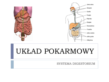 UKŁAD POKARMOWY SYSTEMA DIGESTORIUM Jama brzuszna (cavum abdominis) okrężnica cz. zstępująca trzustka odbytnica okrężnica cz. wstępująca żołądek 1 wyrostek robaczkowy wątroba 10 12 2 9 pęcherzyk żółciowy 8 3 jelito cienkie jelito ślepe okrężnica cz. poprzeczna 7 13 14 6 Jama brzuszna (cavum abdominis) otrzewna trzewna otrzewna ścienna wątroba sieć mniejsza żołądek trzustka dwunastica okrężnica (cz. poprzeczna) sieć większa krezka jelito cienkie esica odbytnica otrzewna ścienna i trzewna przechodzą w siebie na wzajem UKŁAD POKARMOWY (SYSTEMA DIGESTORIUM) Część nadprzeponowa Jama ustna (cavum oris) szpara ustna (rima oris) podniebienie twarde (palatum durum) i miękkie (palatum molle) dno jamy ustnej (fundus cavi oris) język (lingua) ślinianki: przyuszna (glandula parotis), podżuchwowa (glandula submandibularis), podjęzykowa (glandula sublingualis) zęby (dentes) Gardziel (fauces) i gardło (pharynx) Przełyk (esophagus) UKŁAD POKARMOWY (SYSTEMA DIGESTORIUM) Część podprzeponowa Żołądek (ventriculus, gaster): wpust (cardia), dno żołądka (fundus ventriculi), trzon żołądka (corpus ventriculi) odźwiernik (pylorus) Jelito cienkie (intestinum tenue): dwunastnica (duodenum) jelito czcze (jejunum) jelito kręte (ileum) Jelito grube (intestinum crassum): jelito ślepe (cecum) z wyrostkiem robaczkowym (appendix vermiformis) okrężnica (colon) odbytnica (rectum) Gruczoły trawienne: wątroba (hepar) trzustka (pancreas) JAMA USTNA CAVUM ORIS • • • • • • szpara ustna (rima oris) podniebienie twarde (palatum durum) i miękkie (palatum molle) dno jamy ustnej (fundus cavi oris) język (lingua) ślinianki: przyuszna (glandula parotis), podżuchwowa (glandula submandibularis), podjęzykowa (glandula sublingualis) zęby (dentes) przedsionek i właściwa jama ustna, oddzielone łukami zębowymi JAMA USTNA CAVUM ORIS Szpara ust (rima oris) jest ograniczona wargami (labia) szczękową i żuchwową. Warga utworzona jest przez skórę, m. okrężny ust, wyścielone od wewnątrz błona śluzową. W każdej wardze można wyróżnić część skórną, śluzową i pośrednią, czyli czerwień wargową, w której naczynia włosowate przeświecają przez nabłonek, pozbawiony w tym miejscu zrogowaciałej warstwy. W przedłużeniu przegrody nosa znajduje się rynienka podnosowa (philtrum). U noworodków na wewnętrznej stronie czerwieni wargowej znajdują się tzw. brodawki kosmkowe, pozwalające im lepiej przyssać się do sutka matki, zanikają one po okresie ssania. Policzki (buccae) utworzone są przez m. policzkowy (m. buccinator), zewnętrznie do niego położona jest poduszeczka tłuszczowa, przykryta skórą. Od środka znajduje się błona śluzowa. Podniebienie (palatum) stanowi górną ścianę jamy ustnej. Wyróżniamy w niej część przednią, tzw. podniebienie twarde (palatum durum), utworzone przez wyrostki podniebienne szczęki i blaszki poziome kości podniebiennych oraz podniebienie miękkie (palatum molle), które jest fałdem błony śluzowej z mięśniami poprzecznie prążkowanymi. Pośrodku tylnego brzegu podniebienia znajduje się wyniosłość, nazywana języczkiem (uvula). Dno jamy ustnej (fundus cavi oris) stanowią niektóre mięśnie nadgnykowe (żuchwowo-gnykowe), tworzące przeponę jamy ustnej. Od strony jamy ustnej dno pokryte jest błoną śluzową, tworzącą fałd podjęzykowy, ze śliniankami podjęzykową i podżuchwową. Nabłonek błony śluzowej jest wielowarstwowy, płaski. Do narządów jamy ustnej zalicza się zęby, język i ślinianki. JAMA USTNA CAVUM ORIS Mięsień policzkowy język żuchwa Mięśnie dna jamy ustnej Ślinianka przyuszna i jej przewód Mięsień żwacz Ślinianka podjęzykowa Ślinianka podżuchwowa 3 pary gruczołów ślinowych (amylaza ślinowa): (1) ślinianki przyuszne (2) ślinianki podżuchwowe (3) ślinianki podjęzykowe Wytwarzanie śliny – 1-1,5 L/dobę, wydzielanie - na drodze odruchowej 1 przewód ślinianki 1 2 rodzaje śliny wytwarzanej w śliniankach i drobnych gruczołach śluzówki języka i jamy ustnej – surowicza i śluzowa Skład śliny: • skł. mineralne - nieco inny niż osocza (są jony K+, Na+, Ca+2, Mg+2, Cl-, ale np. K+ i HCO3więcej, a Na+ i Cl- mniej) • skł. organiczne – białka, mucyny, lipaza i ptialina (alfaamylaza) -enzymy trawienne, kalikreina itd. przewód ślinianki 3 przewód ślinianki 2 ślinianki 3 http://reasonablywell-julia.blogspot.com/2011/05/facial-swelling-and-sjogrens-syndrome.html 2 Ślinianki unerwiane są przez te same nerwy, które unerwiają kubki smakowe: n. twarzowy (VII), językowo-gardłowy (IX) i błędny (X) Droga doośrodkowa – czuciowe włókna tych nerwów, Ośrodki - w rdzeniu przedłużonym, Droga odośrodkowa – wł. parasympatyczne tych nerwów (wszystkie ślinianki) oraz wł. sympatyczne rozpoczynające się w górnym odcinku rdzenia kręgowego (podżuchwowa i podjęzykowa) Kom. surowicze (gł. amylaza) Aktywacja wł. parasympatycznych duża ilość śliny surowiczej (wodnista, z dużą zawartością białka) Atropina – blokuje jej wydzielanie Kom. śluzowe (gł. mucynę) Aktywacja wł. sympatycznych mała ilość gęstej, lepkiej śliny (bogatej w cukry) JĘZYK LINGUA Ruchy języka umożliwiają mięśnie: własne (wewnętrzne): podłużny górny (unosi koniuszek języka), dolny (opuszcza), poprzeczny (wydłuża) i pionowy (spłaszcza język) • mięśnie zewnętrzne (dochodzące) (m.in. od żuchwy i kości gnykowej) • BRODAWKI JĘZYKOWE nitkowate grzybowate okolone liściaste funkcje mechaniczne brodawki nitkowate kubki smakowe (receptory smaku) brodawki grzybowate Brodawki językowe brodawka grzybowata brodawka nitkowata brodawka liściasta brodawki grzybowate i nitkowate brodawka okolona kubek smakowy gruczoł ślinowy kubek smakowy chemoreceptory komórki podporowe aferentne nerwy smakowe ZĘBY DENTES SZKLIWO KORONA KOMORA DZIĄSŁO SZYJKA ZĘBINA KOSTNIWO PRZEGRODA MIĘDZYZĘBODOŁOWA KORZEŃ KANAŁ KO